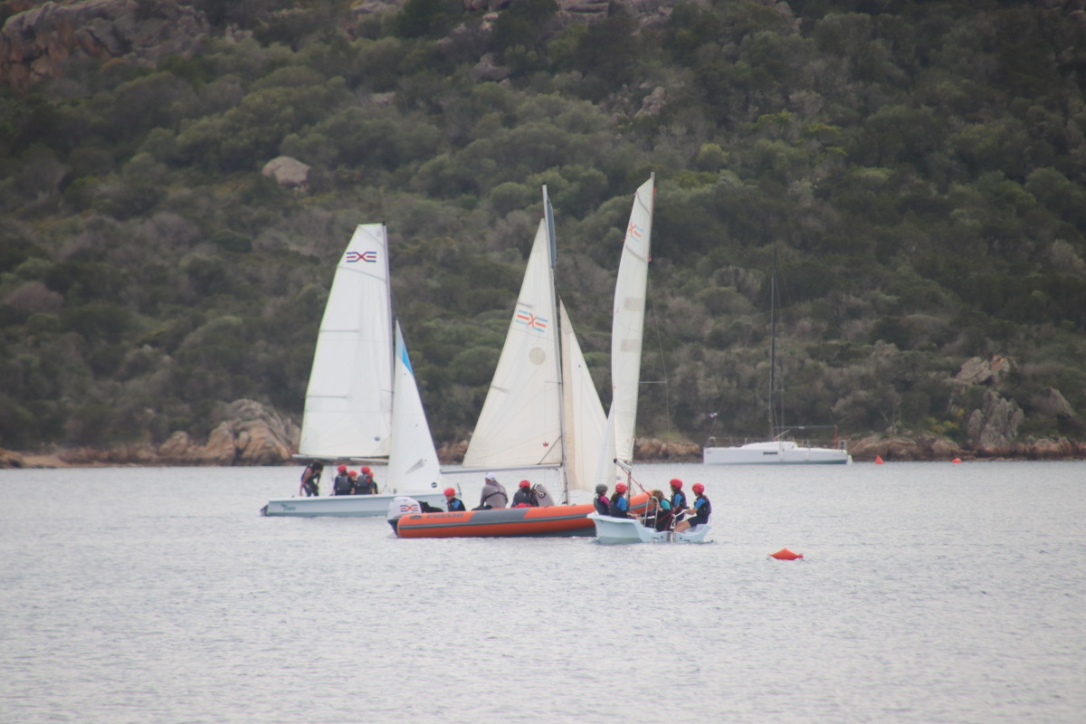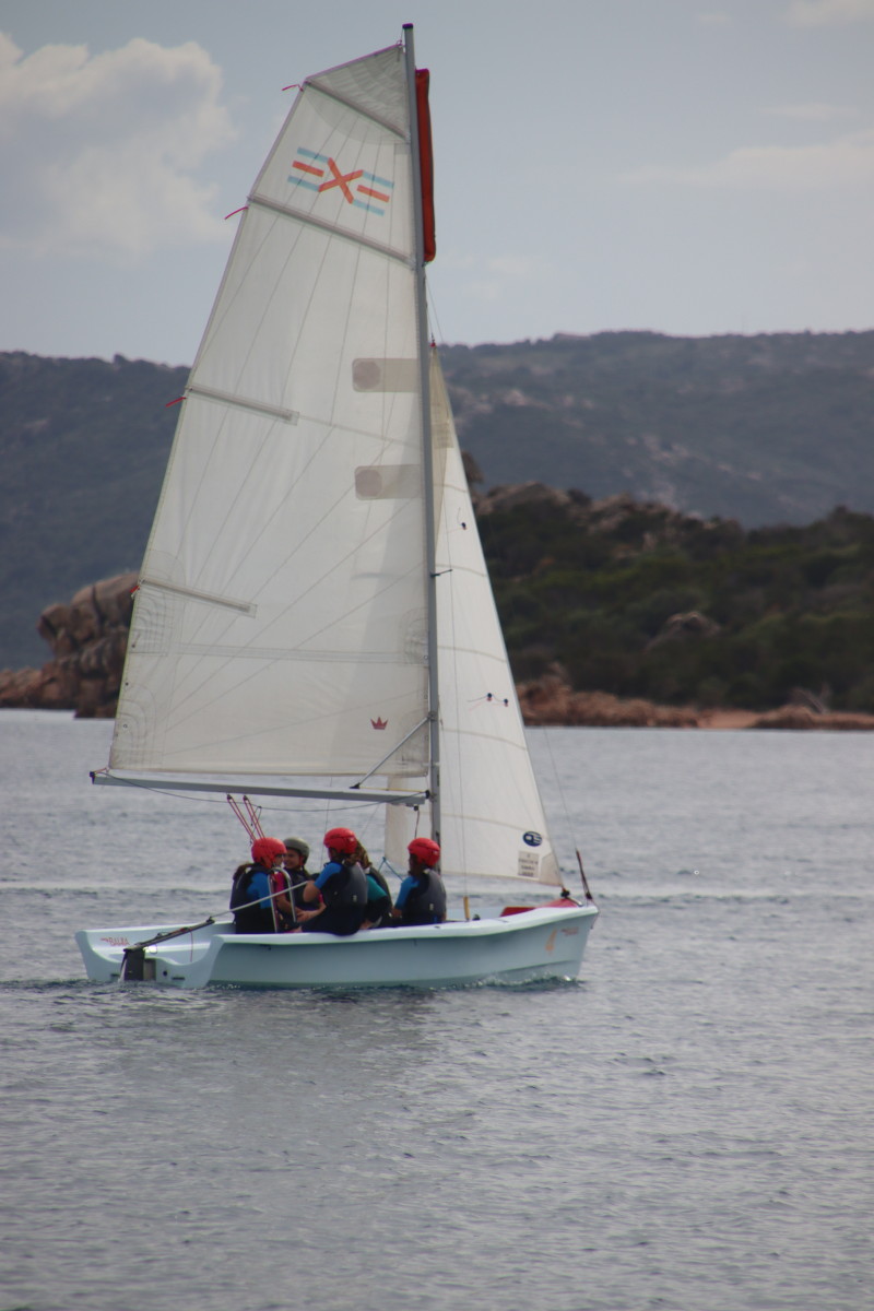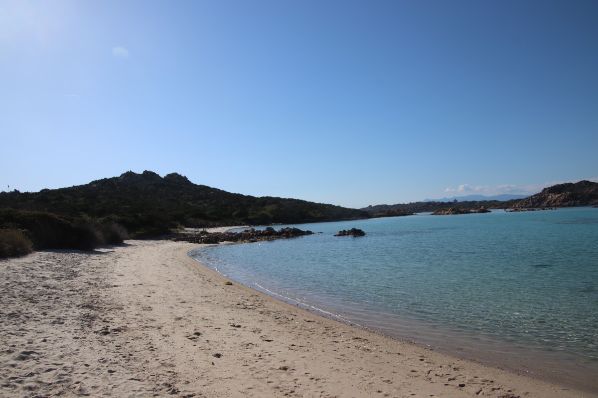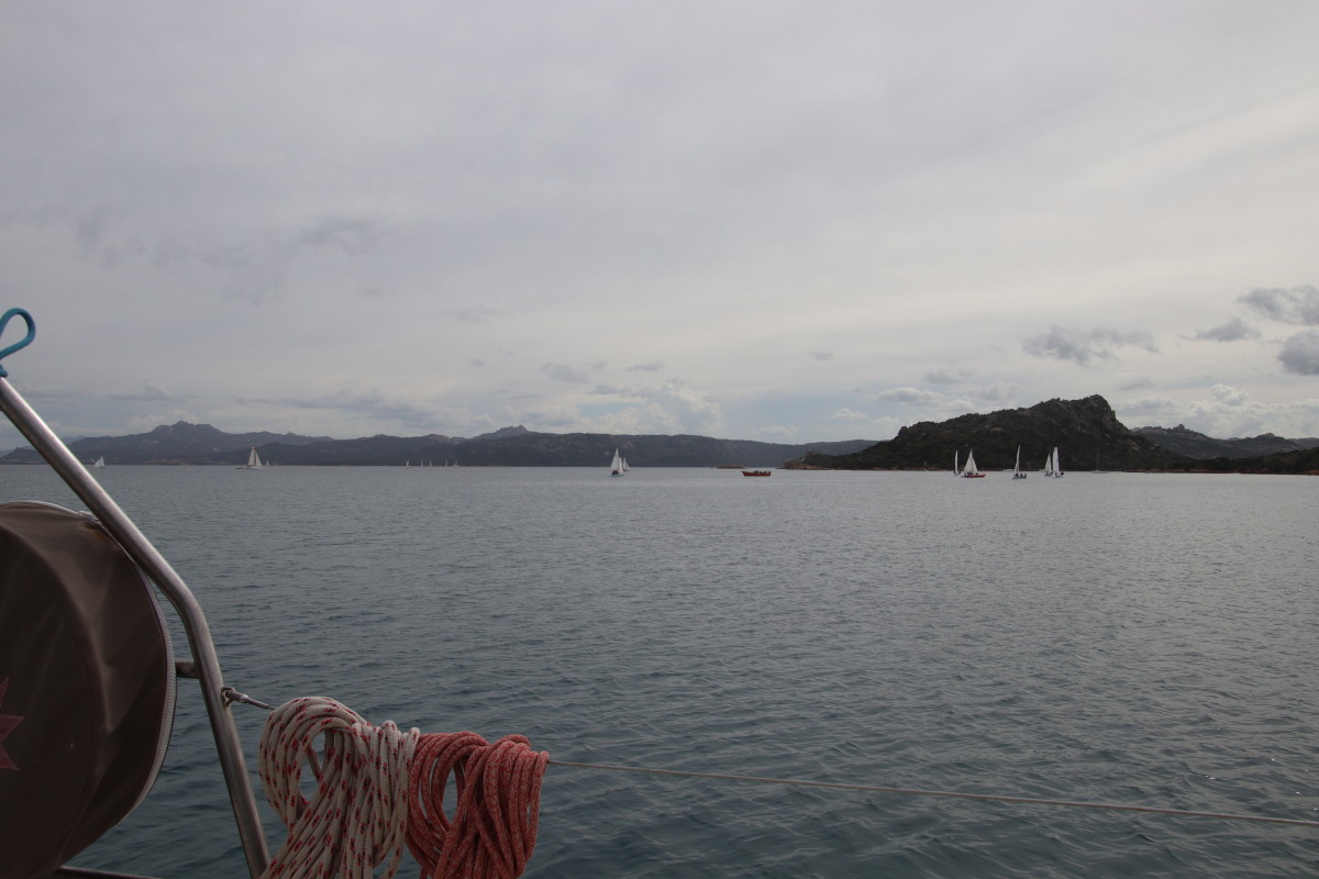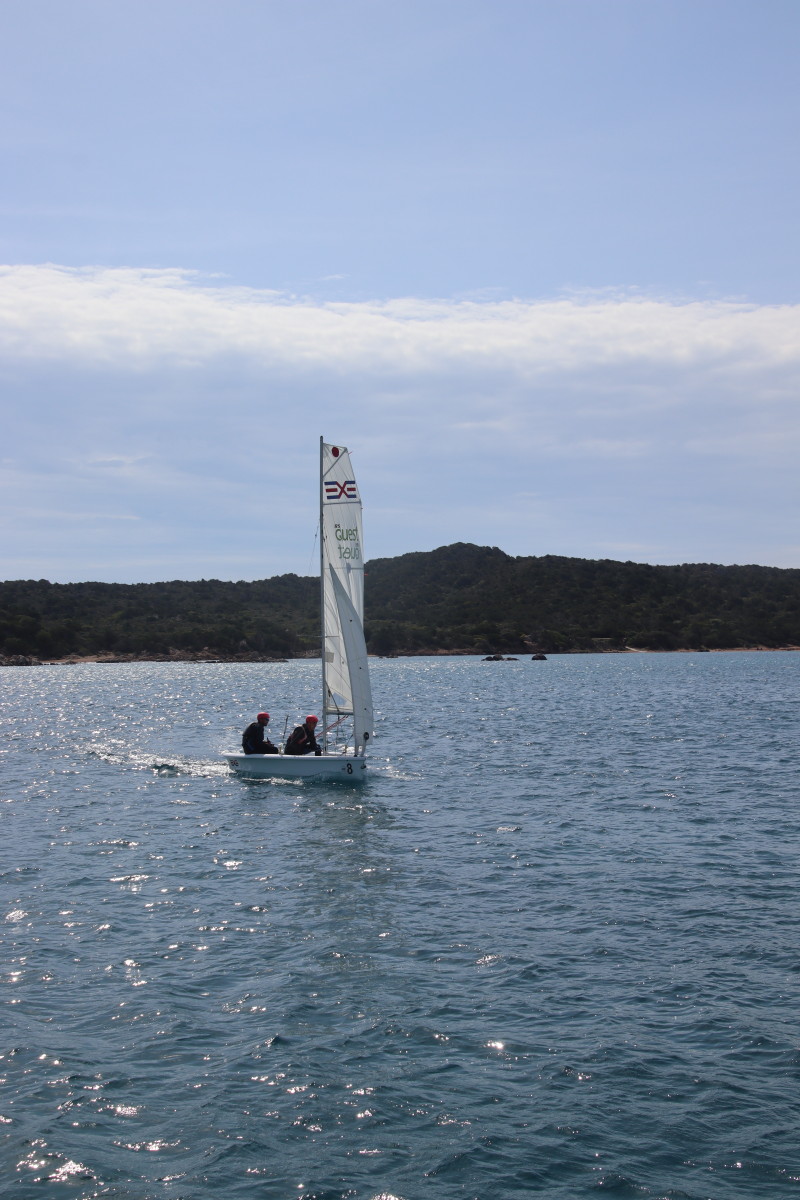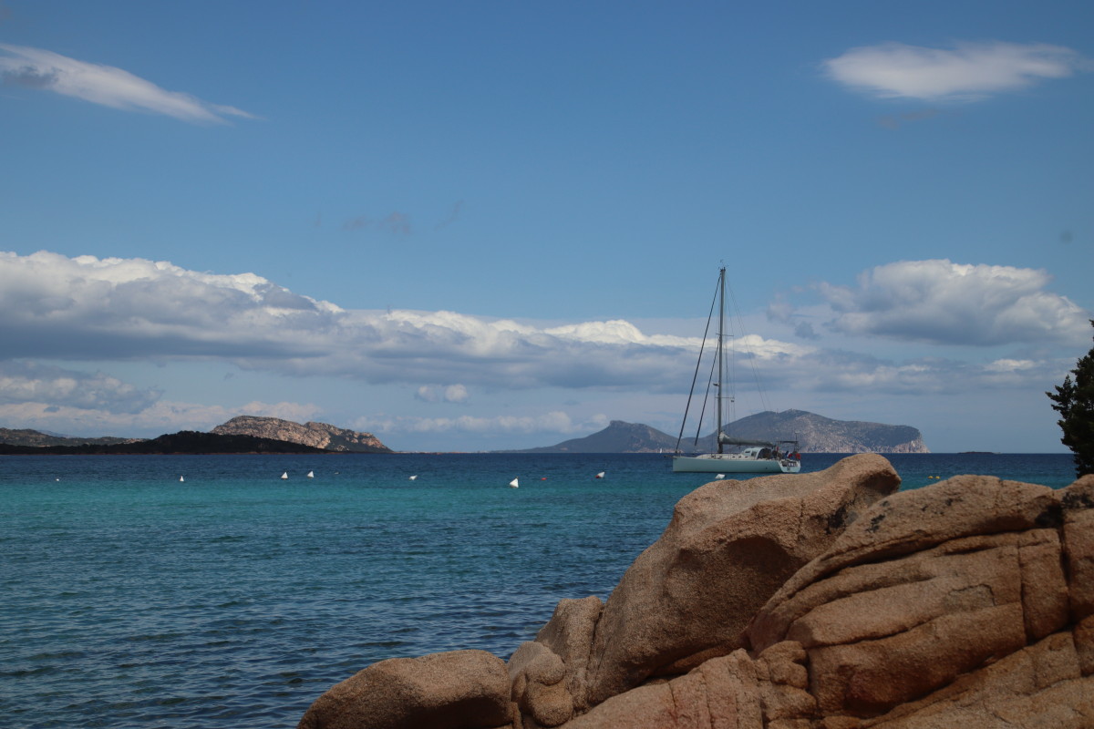 Nous commençons ce séjour par 2 jours dans la baie de Porto Palma sur la côte sud de Caprera. Encore tranquille en cette saison nous avons toute la place pour choisir un beau patch de sable sans posidonie pour y déposer notre ancre. La baie est le terrain de jeu d’une école de voile très active (ça nous rappelle des souvenirs de jeunesse) et toute la journée dériveurs et petits habitables de régate s’ébattent dans un ballet incessant d’empannages, virements de bords et autres manœuvres.