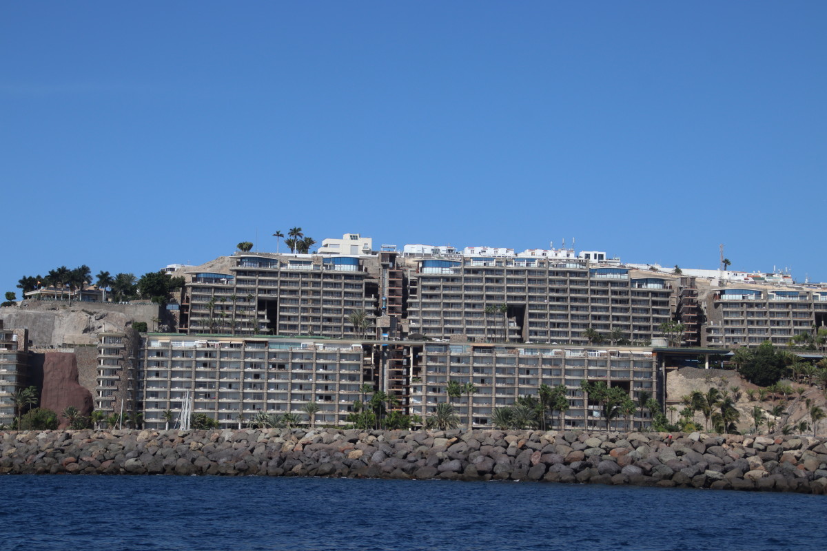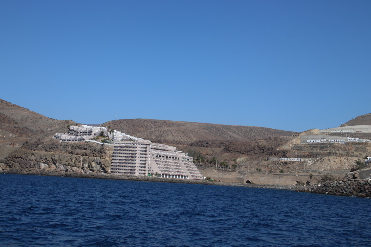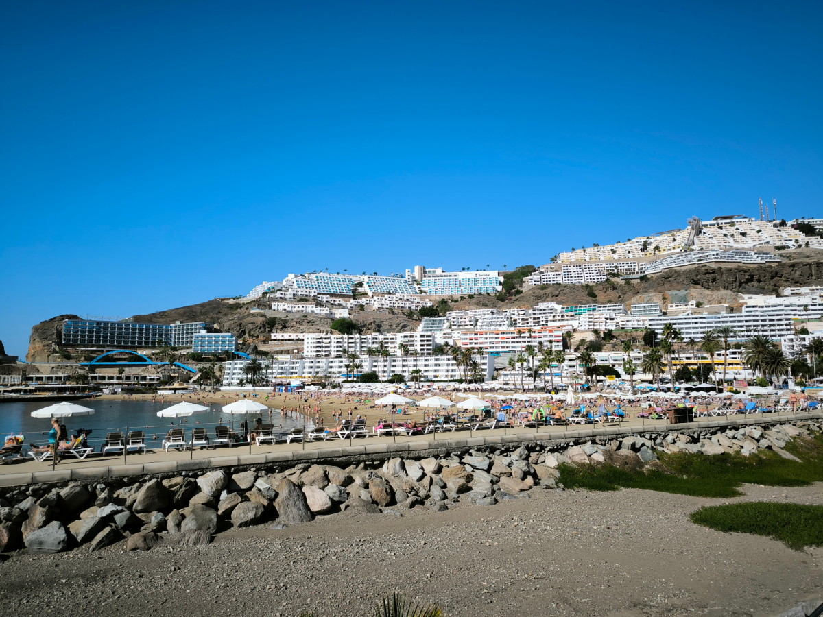 La côte autour est loin d’être sauvage. Ce sont ce qu’ils appellent ici une urbanización traduisez « entassez le maximum de constructions pour en faire des hôtels ou des locations de vacances », même le flanc verticaux de falaises des barrancos (canyon locaux) donnant sur la mer sont utilisés. Aucune vie locale, ici tout est uniquement conçu pour le touriste avide de soleil et de farniente. Mais il y a des supermarchés relativement bien achalandés même si c’est beaucoup de produits industriels prêt à manger et autres snacks (la malbouffe serait-elle encore plus lucrative au soleil?) mais l’intérêt principal de l’endroit est qu’il est très bien desservi par des bus rapides et confortables.