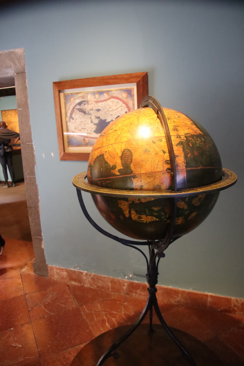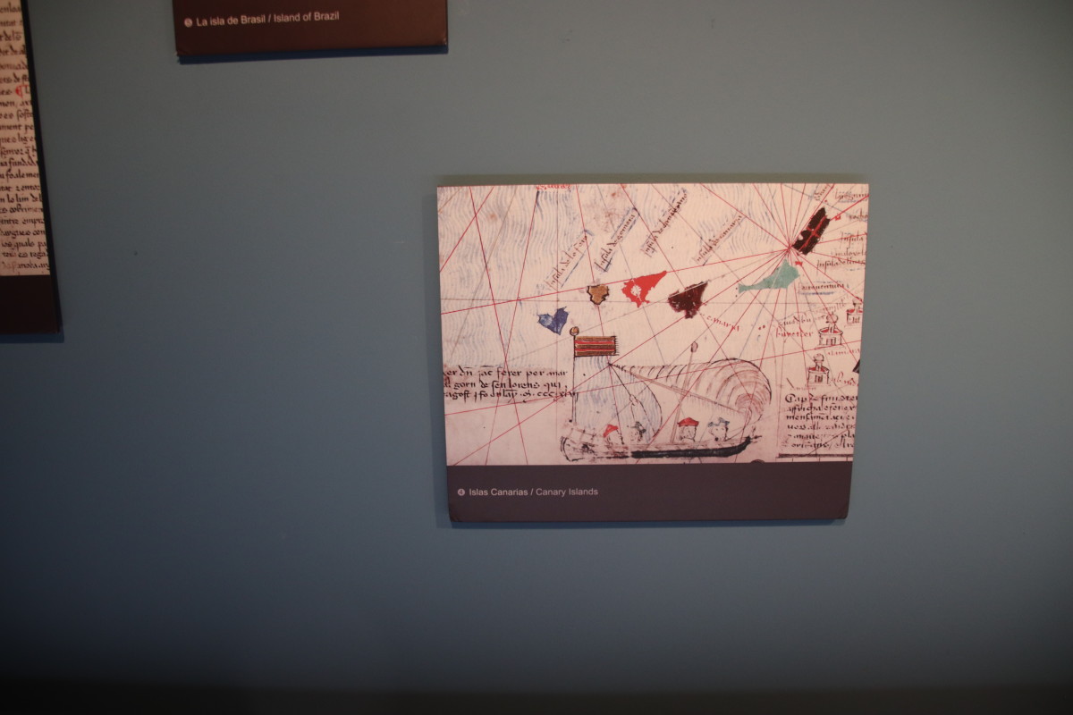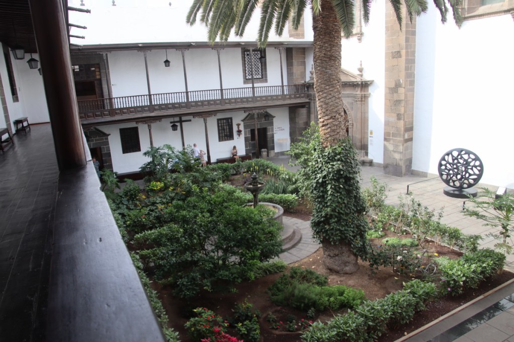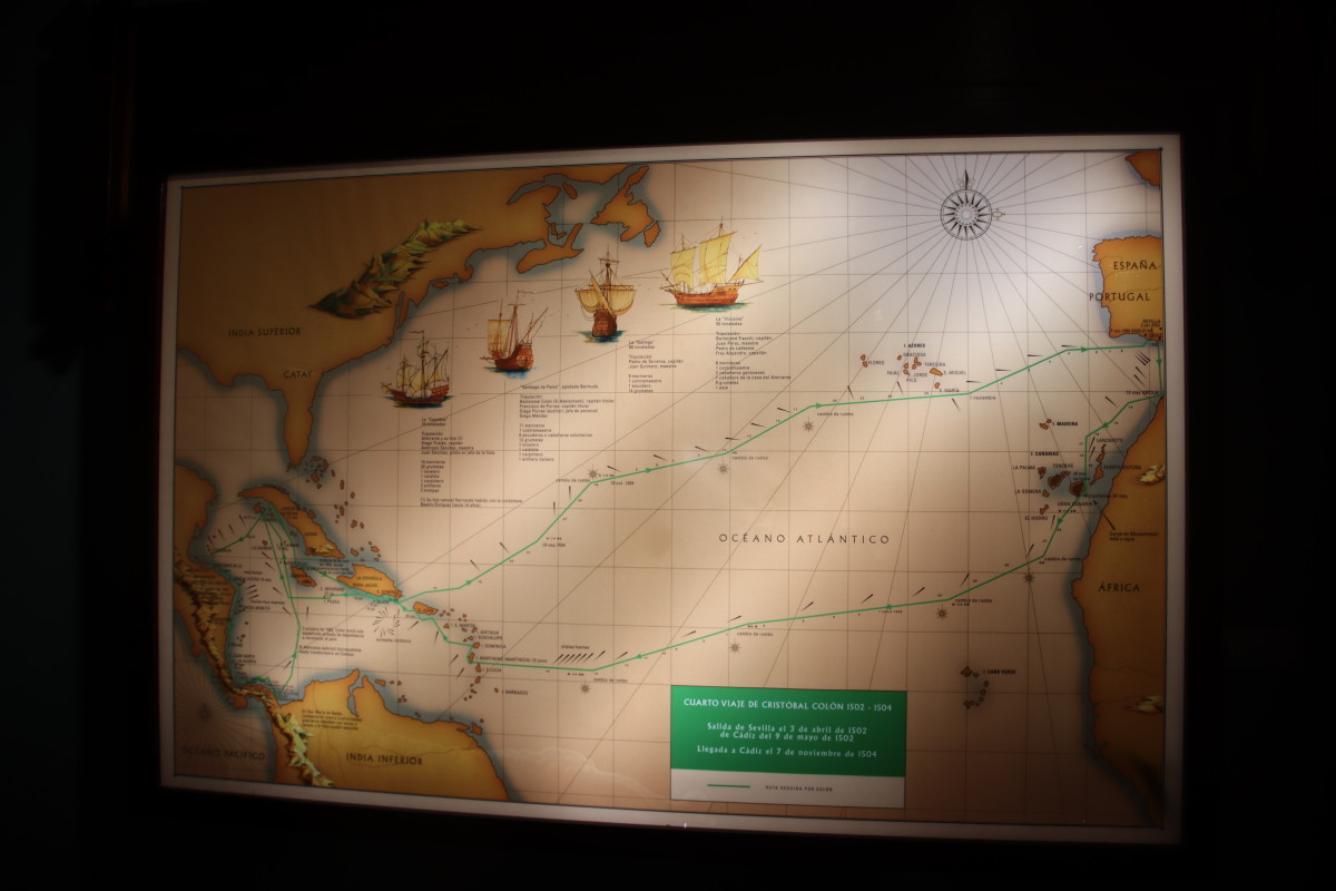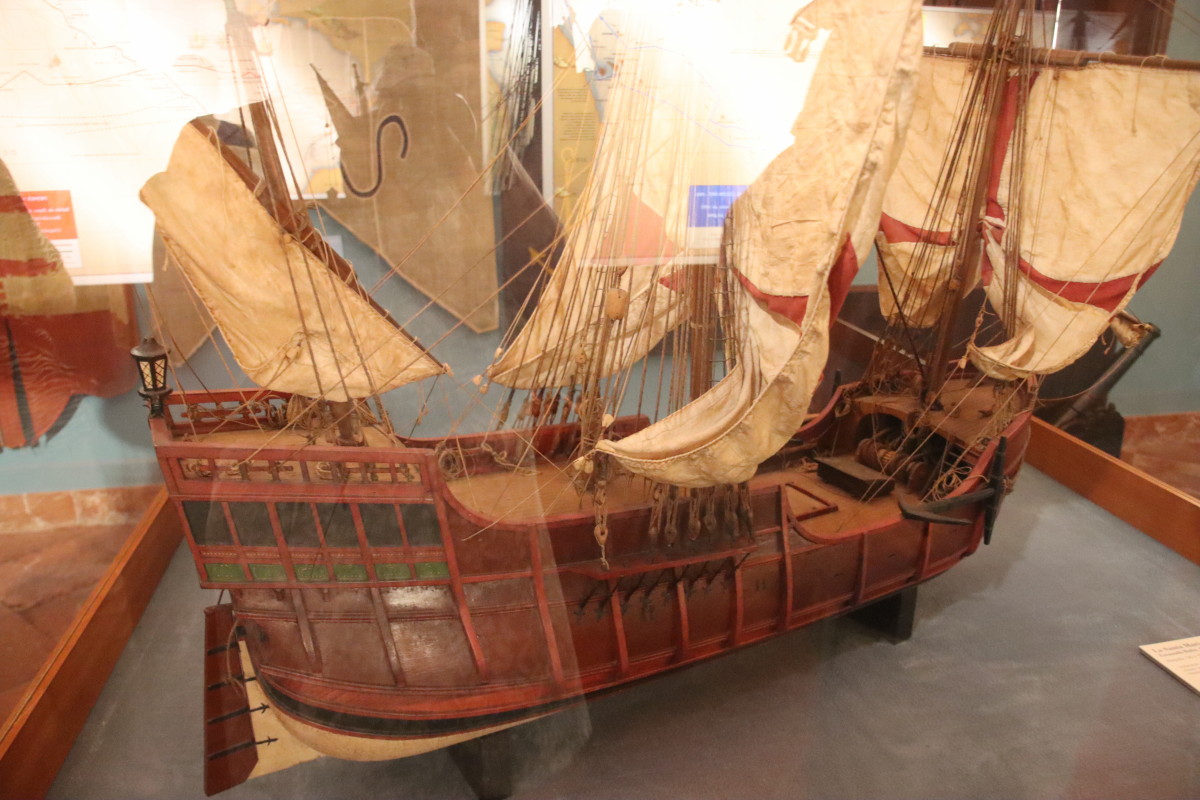 Là le gardien nous laisse les stocker dans un recoin derrière la porte d’entrée. C’est une exposition très intéressante dans un magnifique palais apparemment du XVIIIème siècle (en fait l’assemblage réalisé dans les années 1950 de plusieurs demeures dont l’une était la maison du gouverneur et la plus vieille datait de cette époque). Elle retrace le rôle de l’archipel et tout particulièrement de Las Palmas sur la route des Amériques, étape nécessaire lors de trois des quatre voyages de Christophe Colomb, lors du 4ème, il ne s’arrêta qu’à La Gomera. Plusieurs salles sont aussi consacrées aux navires utilisés et à la cartographie de l’époque. Pour sa première traversée (La Gomera – San Salvador dans le Sud des Bahamas) il aura parcouru les 3200 milles de la route directe en 36 jours soit une moyenne de 3,7 nds dans des conditions difficiles vu qu’il était resté très au nord de ce qu’on appelle aujourd’hui la route des alizés.