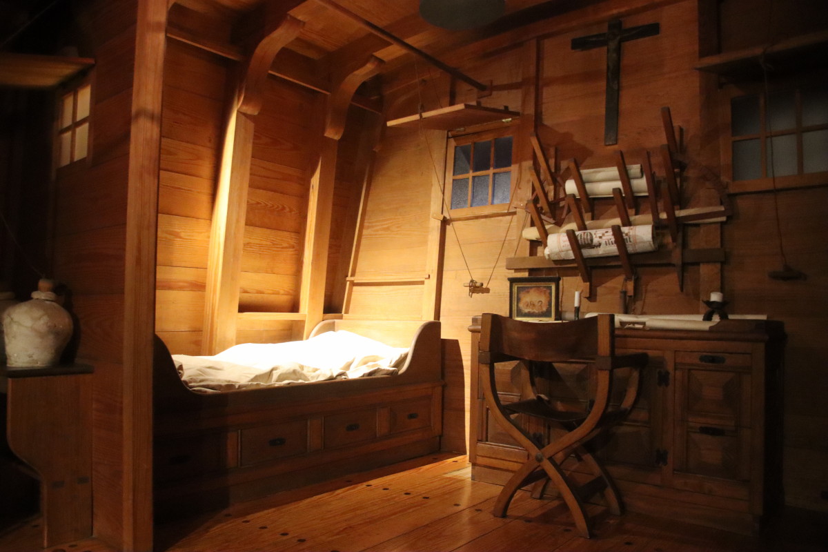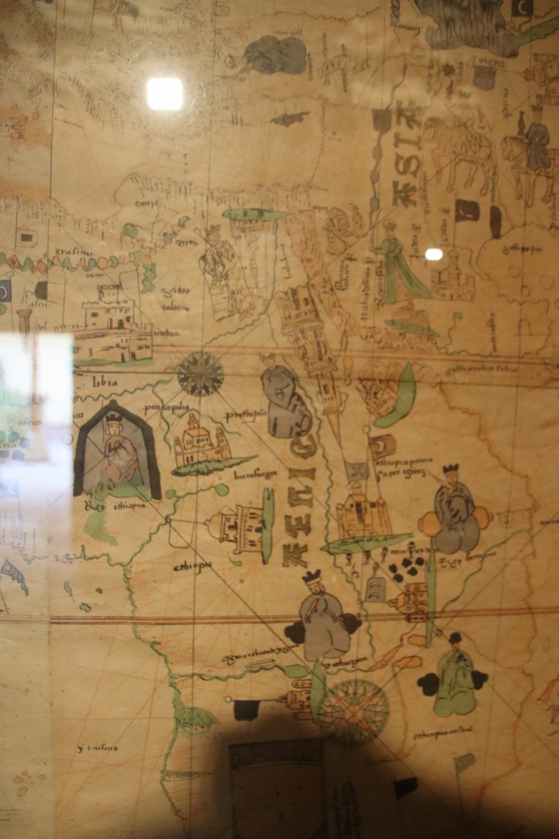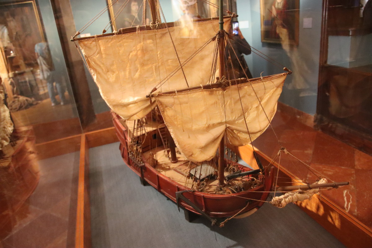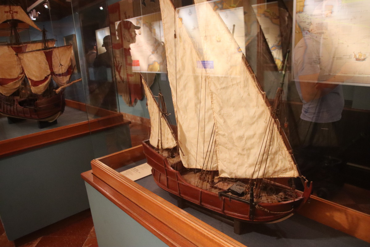 Là le gardien nous laisse les stocker dans un recoin derrière la porte d’entrée. C’est une exposition très intéressante dans un magnifique palais apparemment du XVIIIème siècle (en fait l’assemblage réalisé dans les années 1950 de plusieurs demeures dont l’une était la maison du gouverneur et la plus vieille datait de cette époque). Elle retrace le rôle de l’archipel et tout particulièrement de Las Palmas sur la route des Amériques, étape nécessaire lors de trois des quatre voyages de Christophe Colomb, lors du 4ème, il ne s’arrêta qu’à La Gomera. Plusieurs salles sont aussi consacrées aux navires utilisés et à la cartographie de l’époque. Pour sa première traversée (La Gomera – San Salvador dans le Sud des Bahamas) il aura parcouru les 3200 milles de la route directe en 36 jours soit une moyenne de 3,7 nds dans des conditions difficiles vu qu’il était resté très au nord de ce qu’on appelle aujourd’hui la route des alizés.