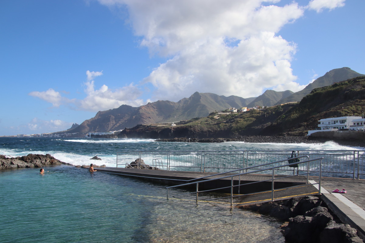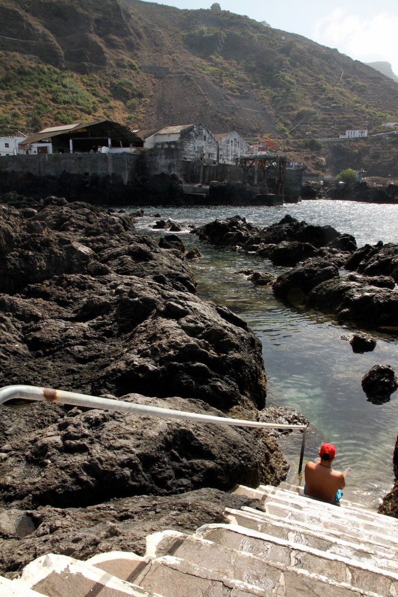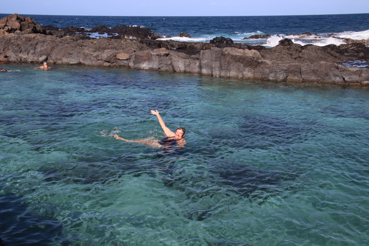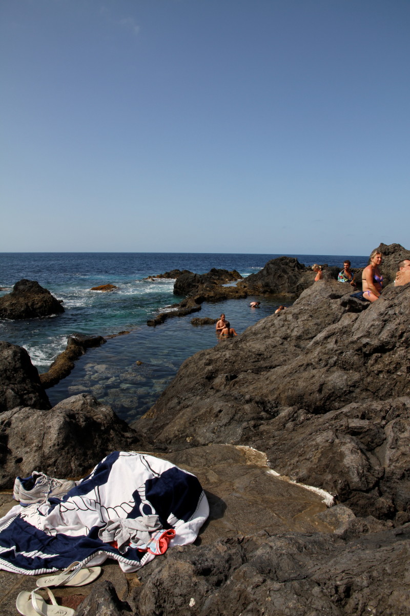 Tout au long de cette côte il y a de nombreuses criques ou piscines naturelles certaines sont inaccessible car il faut traverser des exploitations bananières beaucoup sont impraticable dès qu’il y a la moindre houle de Nord ou Nord Ouest (80 % de l’année). Notre piscine préférée est à Jóver juste en dessous de Tejina. on y accède par une petite route qui passe entre les bananeraies. Un parking, quelques maisons avec un petit bar resto sur l’arrière. L’endroit est surtout fréquenté par les locaux le dimanche. La piscine naturelle est sans doute la plus agréable de toute l’île. Elle est facilement accessible, d’une bonne profondeur d’un bout à l’autre, très bon ensoleillement (nous sommes sur la côte nord:)) et surtout elle est praticable pratiquement quelque soit l’état de la mer.