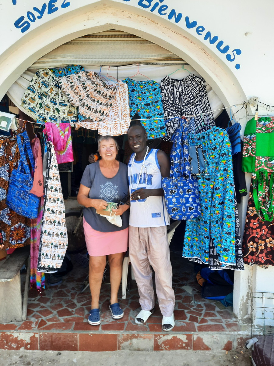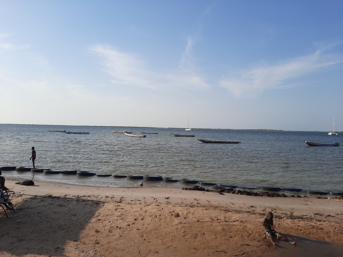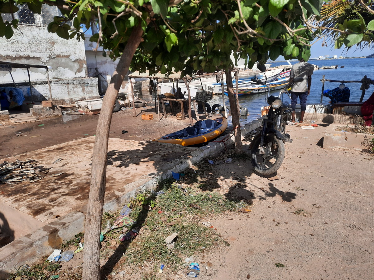 Le lendemain matin nous allons en kayak jusqu’au port de la ville situé juste avant le pont en profitant du courant de la marée. La ville est très animée, même si on a raté le marché hebdomadaire du mardi. Nombreux petits commerces assez bien achalandés. Cheikh (prononcez Cher) le propriétaire d’une échoppe de vêtements locaux se porte volontaire pour nous guider et trouver les meilleurs bananes, les papayes les plus succulentes le pain le plus frais( petits pain blancs).