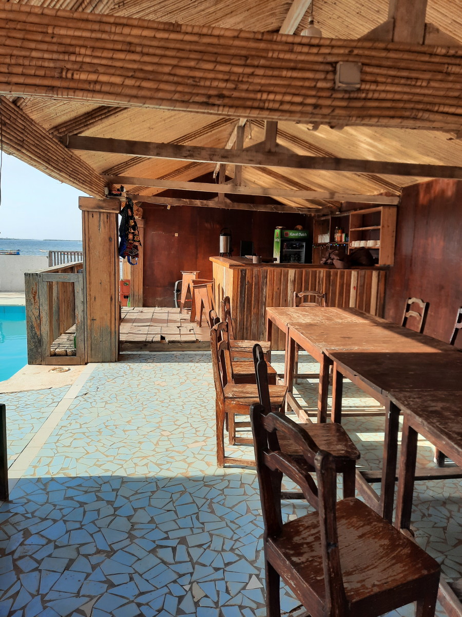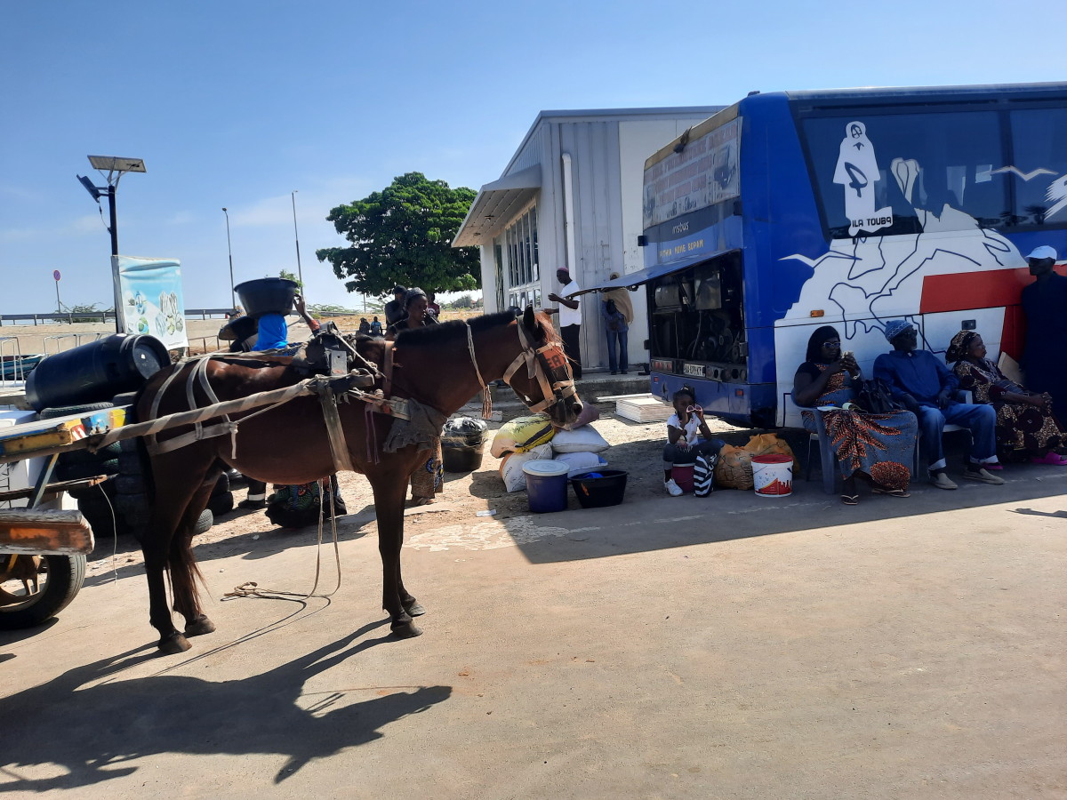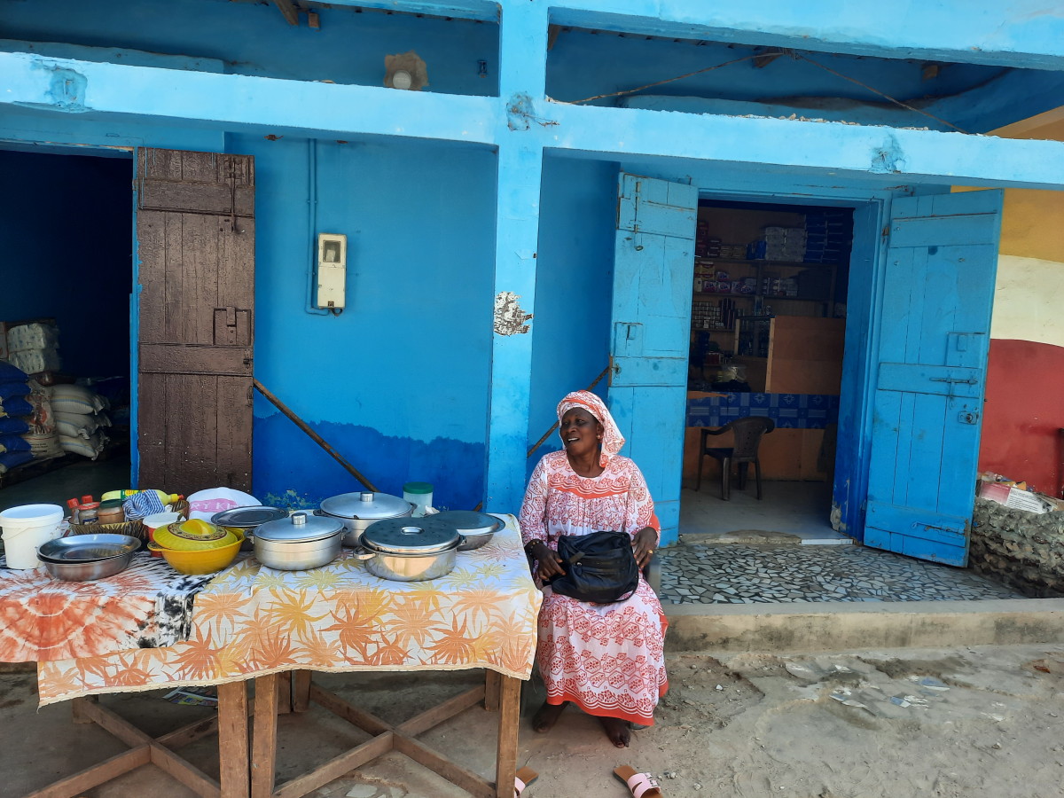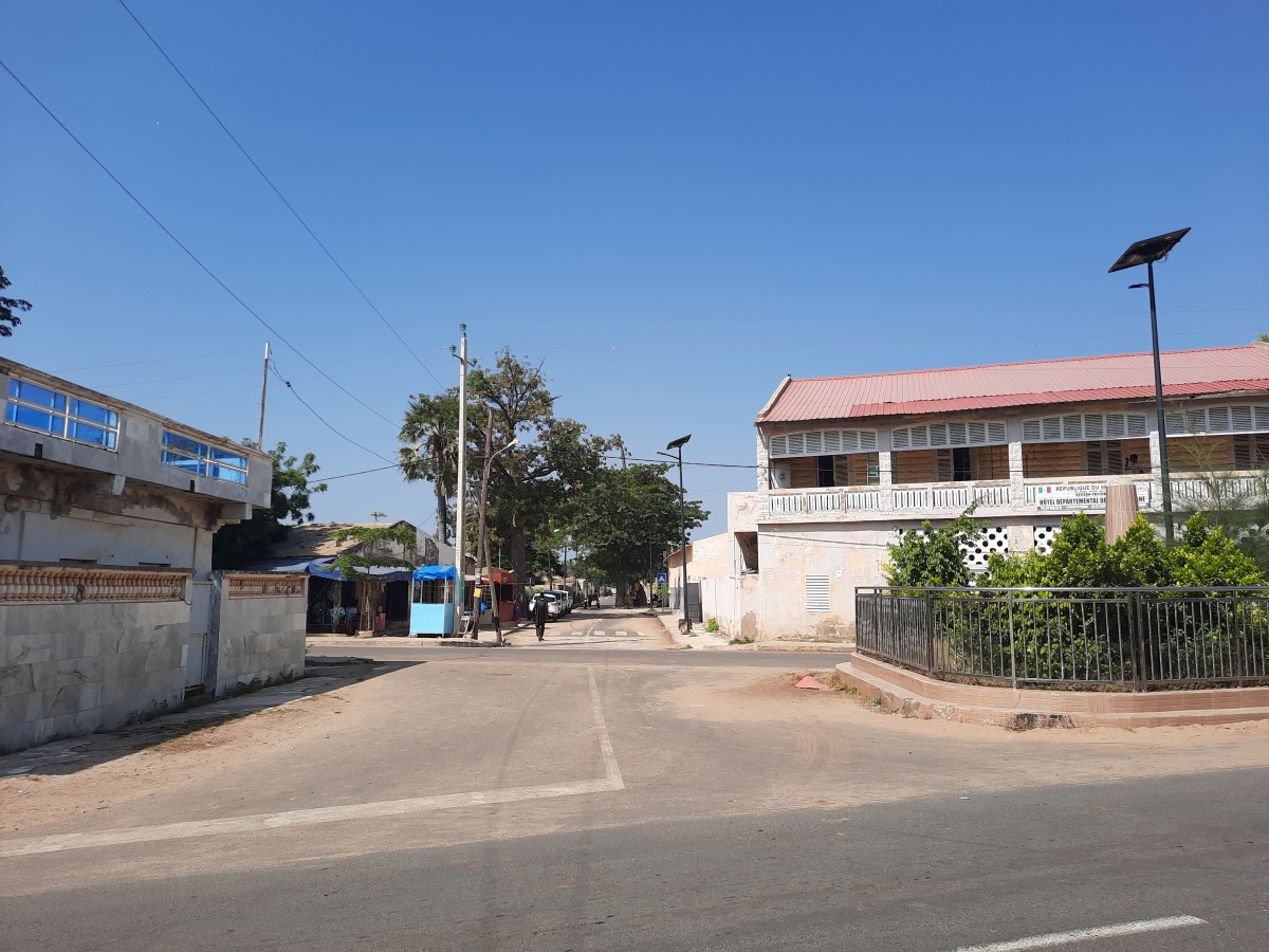 Le lendemain matin nous allons en kayak jusqu’au port de la ville situé juste avant le pont en profitant du courant de la marée. La ville est très animée, même si on a raté le marché hebdomadaire du mardi. Nombreux petits commerces assez bien achalandés. Cheikh (prononcez Cher) le propriétaire d’une échoppe de vêtements locaux se porte volontaire pour nous guider et trouver les meilleurs bananes, les papayes les plus succulentes le pain le plus frais( petits pain blancs).