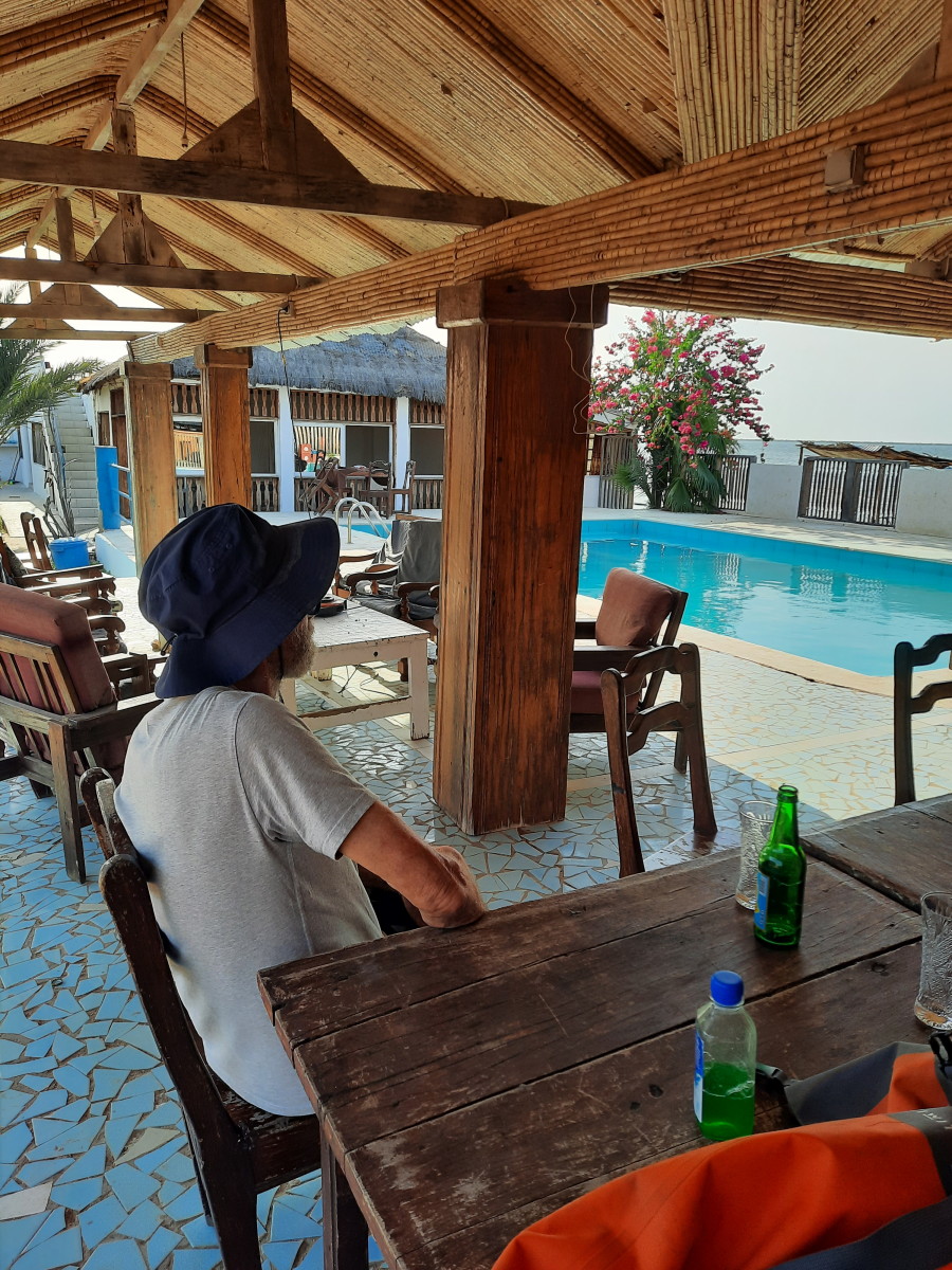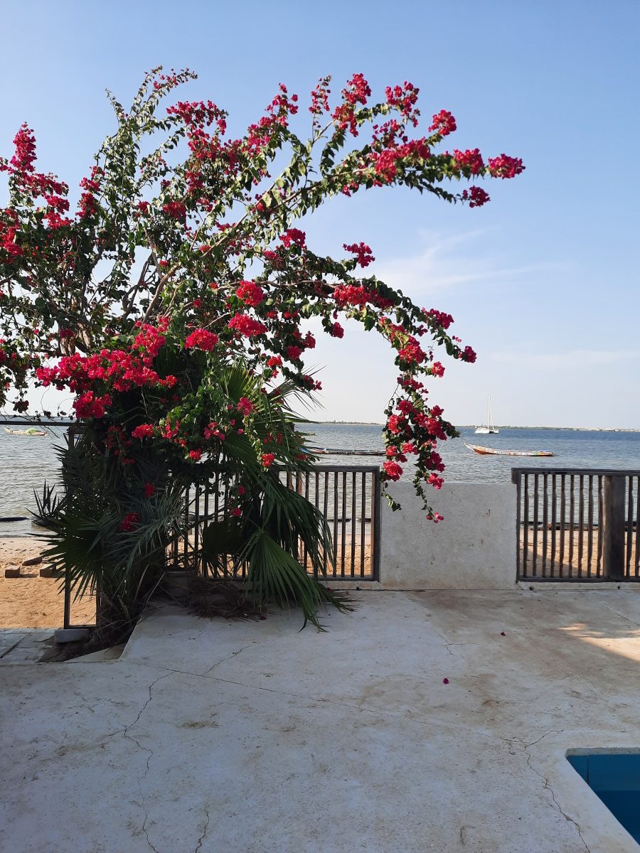 On continue donc la remontée du fleuve qui paradoxalement s’élargit beaucoup quand on arrive à Foundougne. On jette l’ancre dans 10 m d’eau entre la rive nord et une marque du chenal pour casser la croute. Puis on continue la remontée. Le plan d’eau est de plus en plus large. Au fond on aperçoit un pont qui ressemble (en plus petit) au pont de l’île de Ré. Nous apprendrons qu’il a d’ailleurs été dessiné par le même architecte. Sur bâbord c’est un terminal pétrolier flambant neuf (ont-ils prévu une exportation massive d’huile de Karité ou est-ce simplement prévu pour ravitailler la région en essence, mystère…) pendant les quelques jours que nous passerons dans le coin nous n’y verrons pas âme qui vive de là imaginer un montage bien subventionné et très juteux pour quelqu’un….