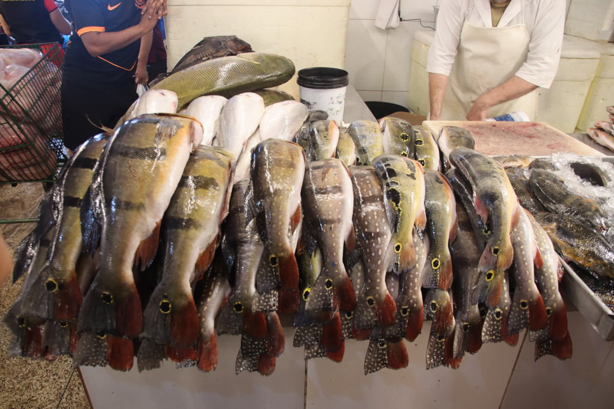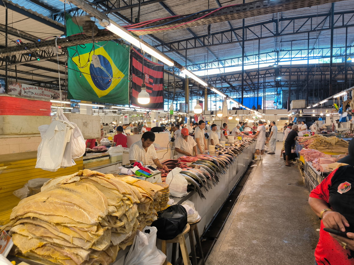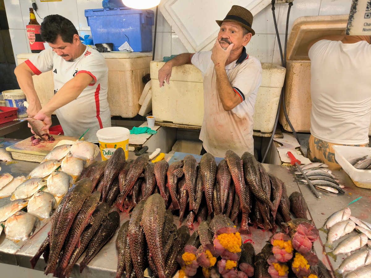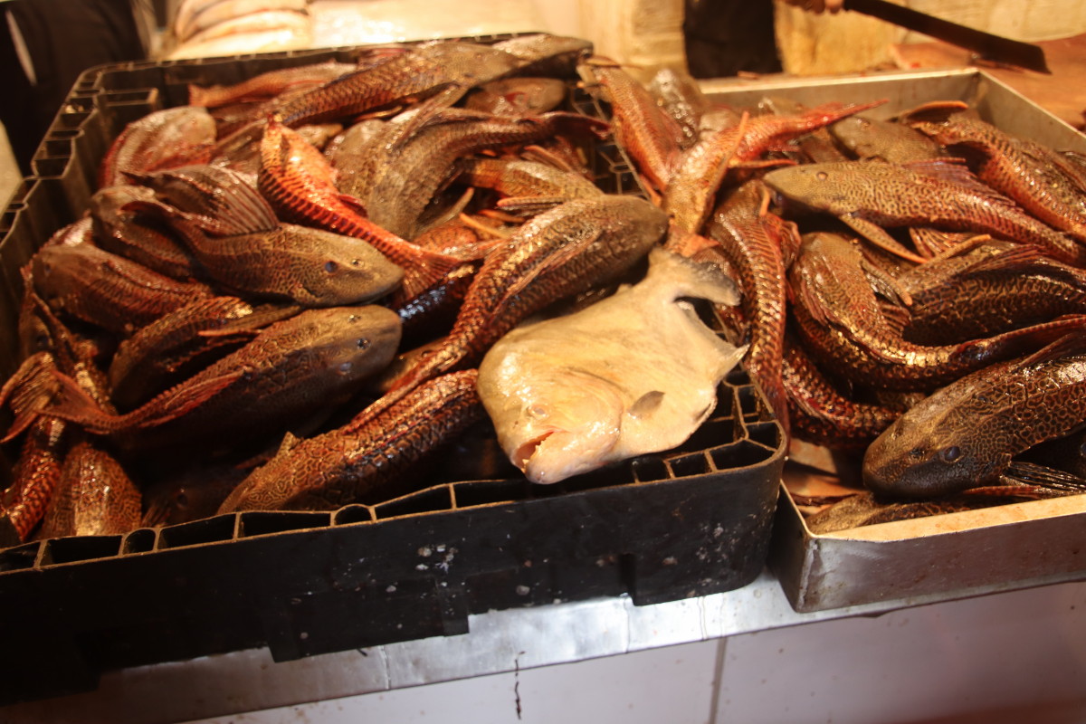 La partie du marché la plus impressionnante est sans aucun doute celle du poisson: issus exclusivement du (des) fleuve(s) ils sont d’une variété étonnante. On retiendra: le plus gros de tous l’arapaima ou pirarucu, le plus connus le piranha, le tambaqui très gros lui aussi et il mange principalement des fruits, et le poisson chat blindé et son armure digne d’un film de science fiction mais il y en a des dizaines d’autres dont nous n’avons pas retenu les noms.