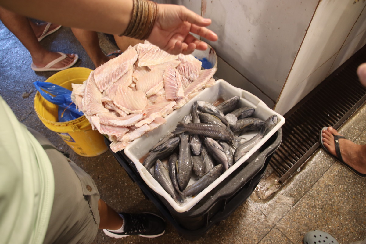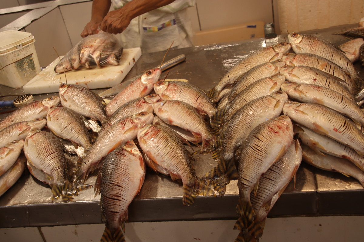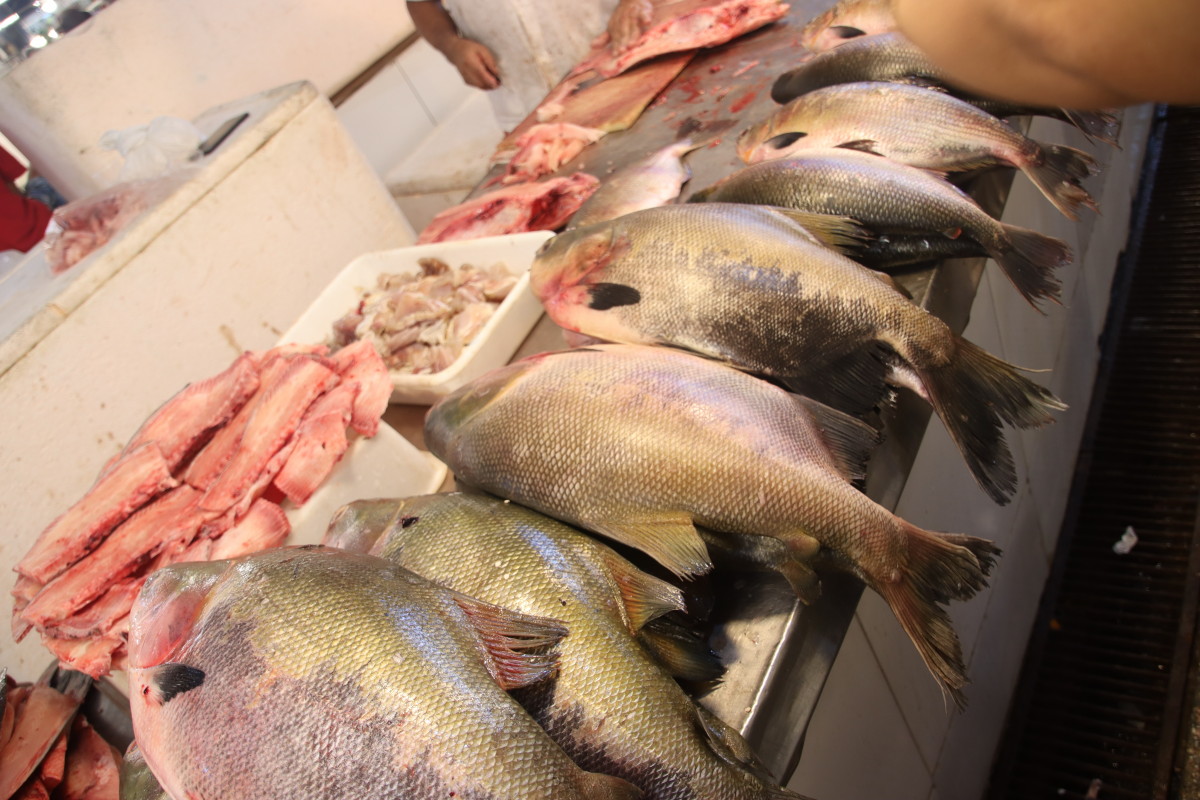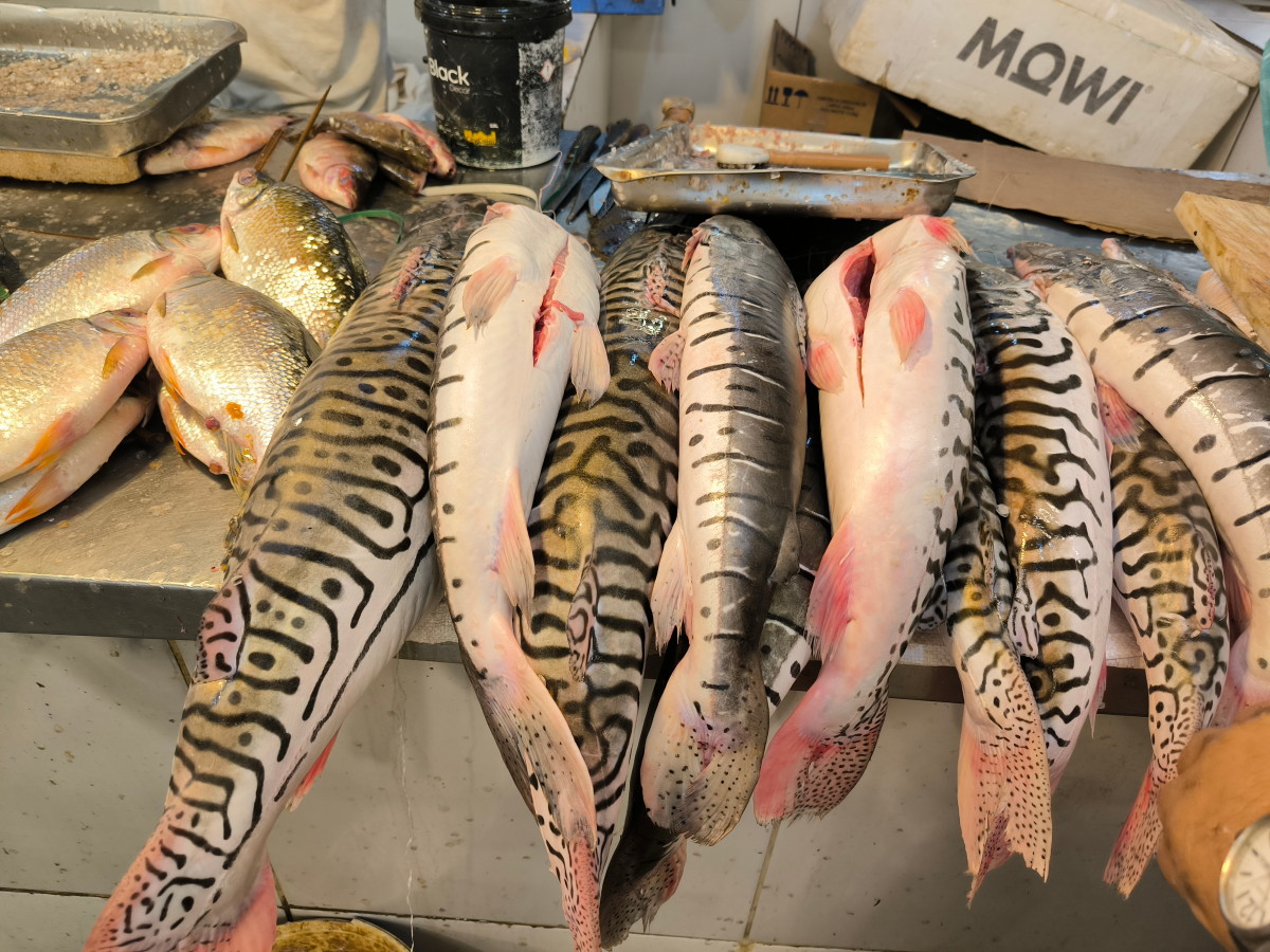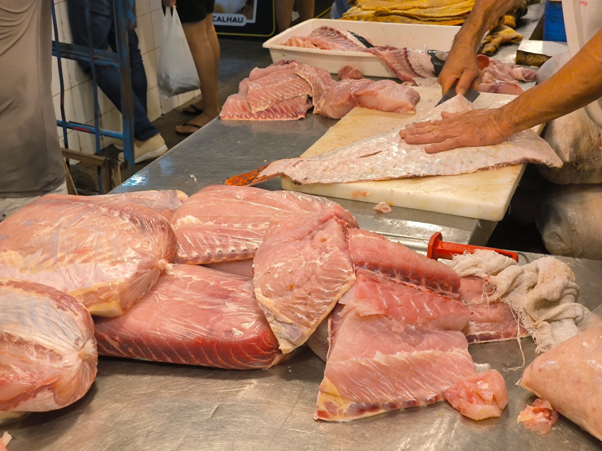 La partie du marché la plus impressionnante est sans aucun doute celle du poisson: issus exclusivement du (des) fleuve(s) ils sont d’une variété étonnante. On retiendra: le plus gros de tous l’arapaima ou pirarucu, le plus connus le piranha, le tambaqui très gros lui aussi et il mange principalement des fruits, et le poisson chat blindé et son armure digne d’un film de science fiction mais il y en a des dizaines d’autres dont nous n’avons pas retenu les noms.