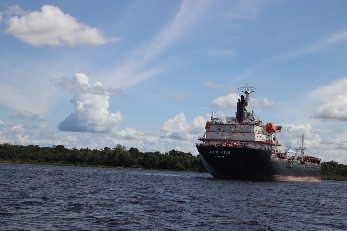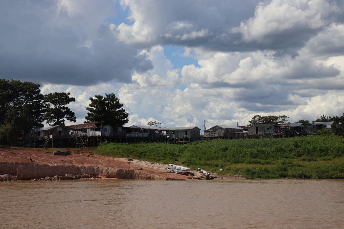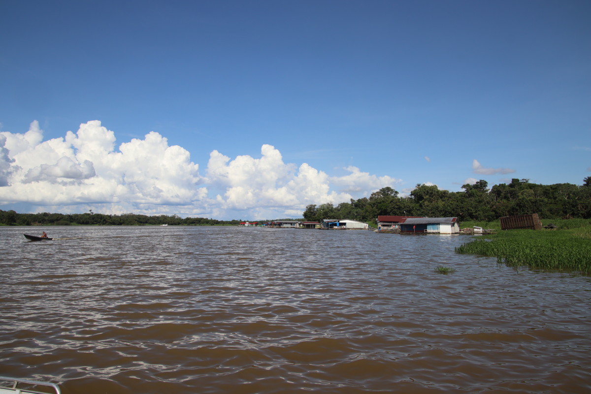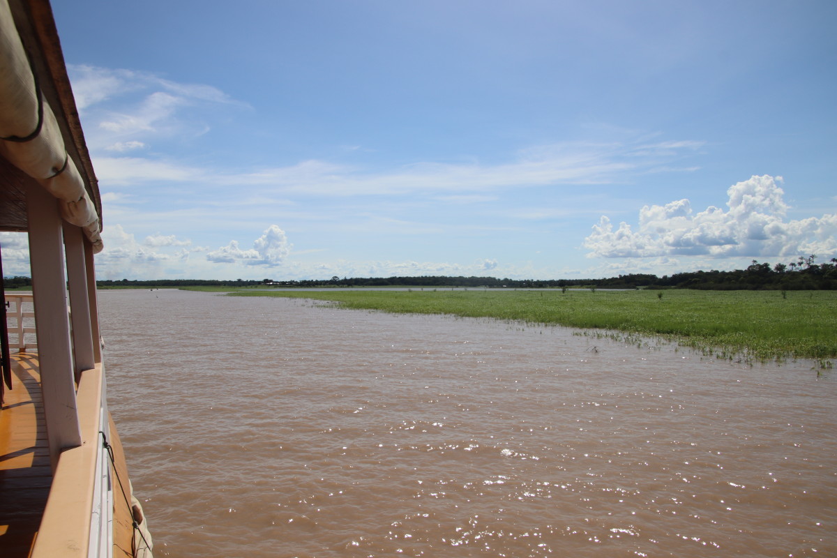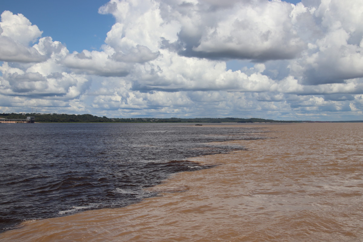 Les courses achevées on peut enfin embarquer. Première étape nous fait longer toute la zone portuaire et industrielle pour aller voir le confluent où les eaux claires mais noires et acide du Rio Negro rencontrent les eaux boueuses chargées d’argile de l’Amazone sans vraiment se mélanger. Intéressant certes mais cette vue certes unique justifie-t-elle 2 heures aller et 2 heures retour à travers un paysage industriel.
