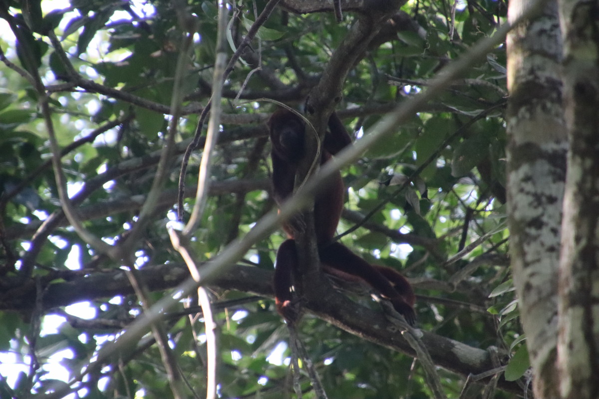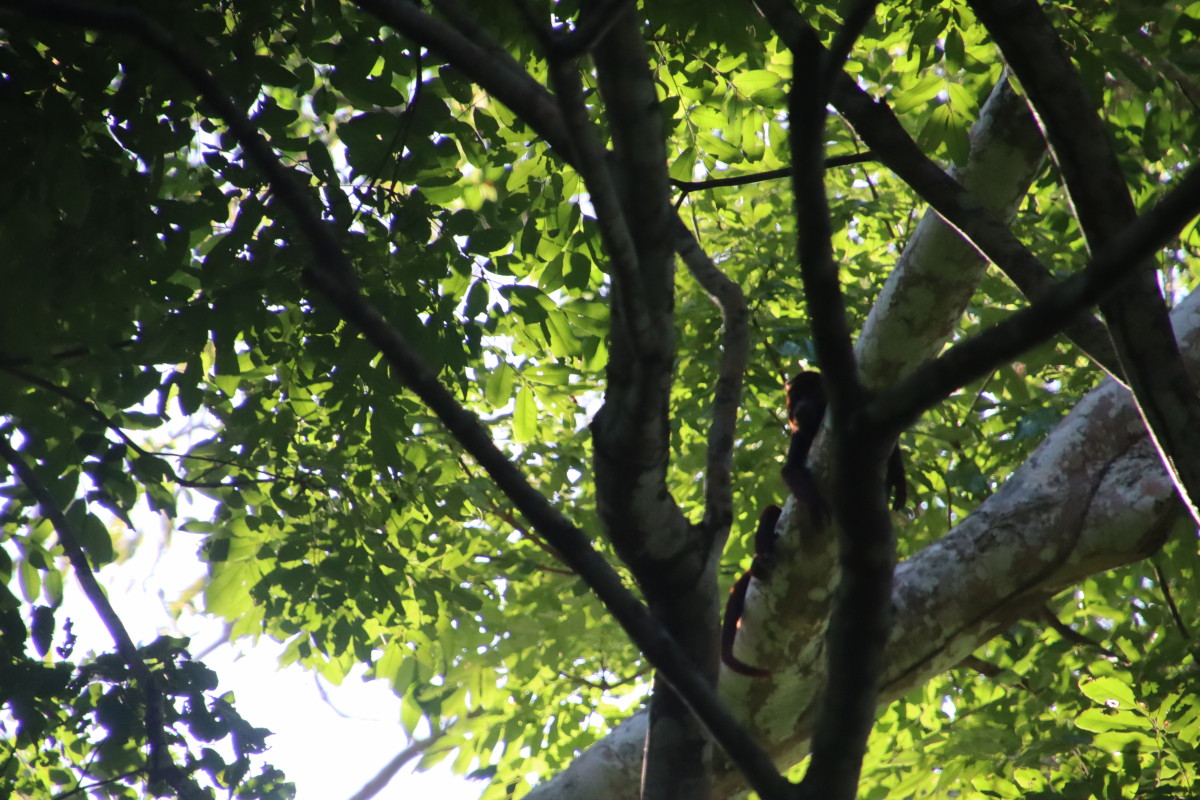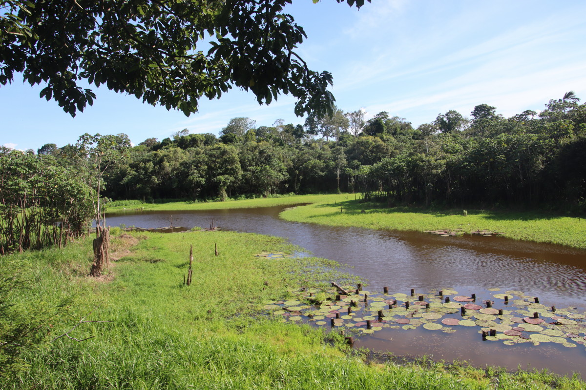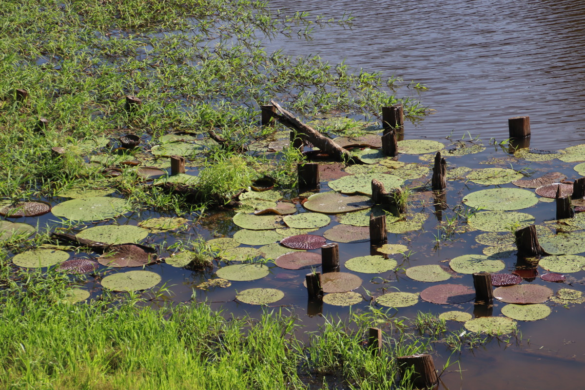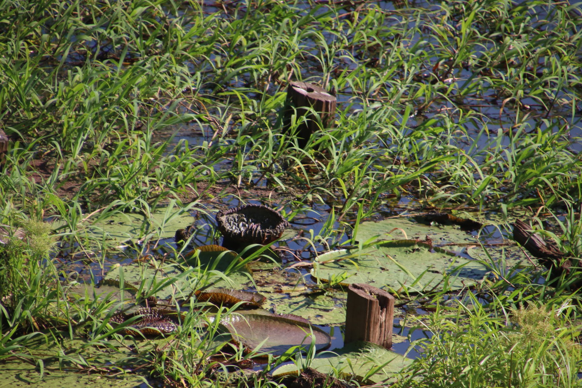 Ballade sur une passerelle à travers la forêt du « Parque Nacional Do Janauari » pour admirer des singes hurleurs et quelques oiseaux jusqu’à un étang ou flottent des nénuphars aux feuilles de près d’1 mètre de diamètre, normalement il y a des crocos qui si promènent mais pas aujourd’hui.