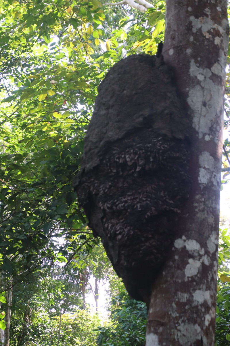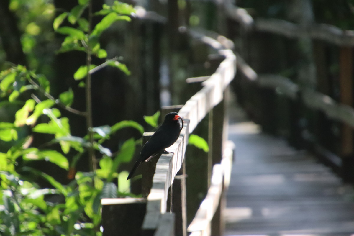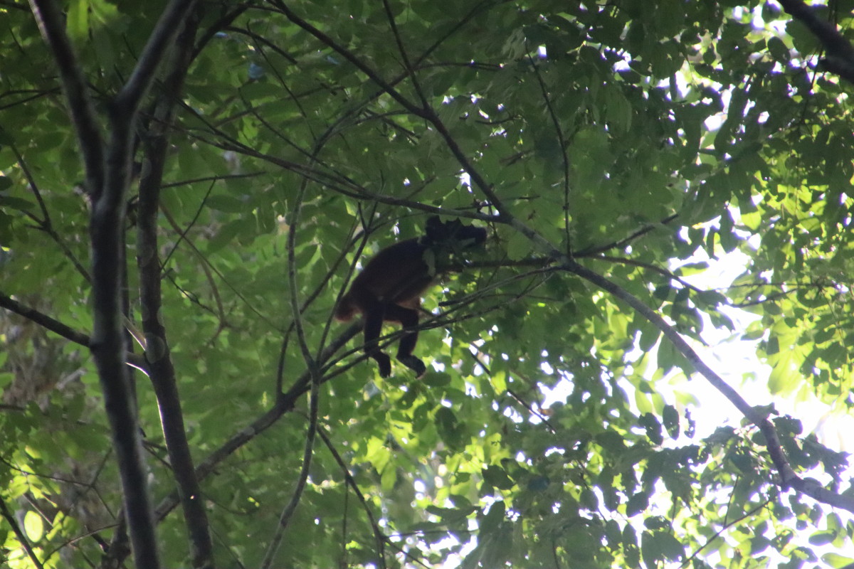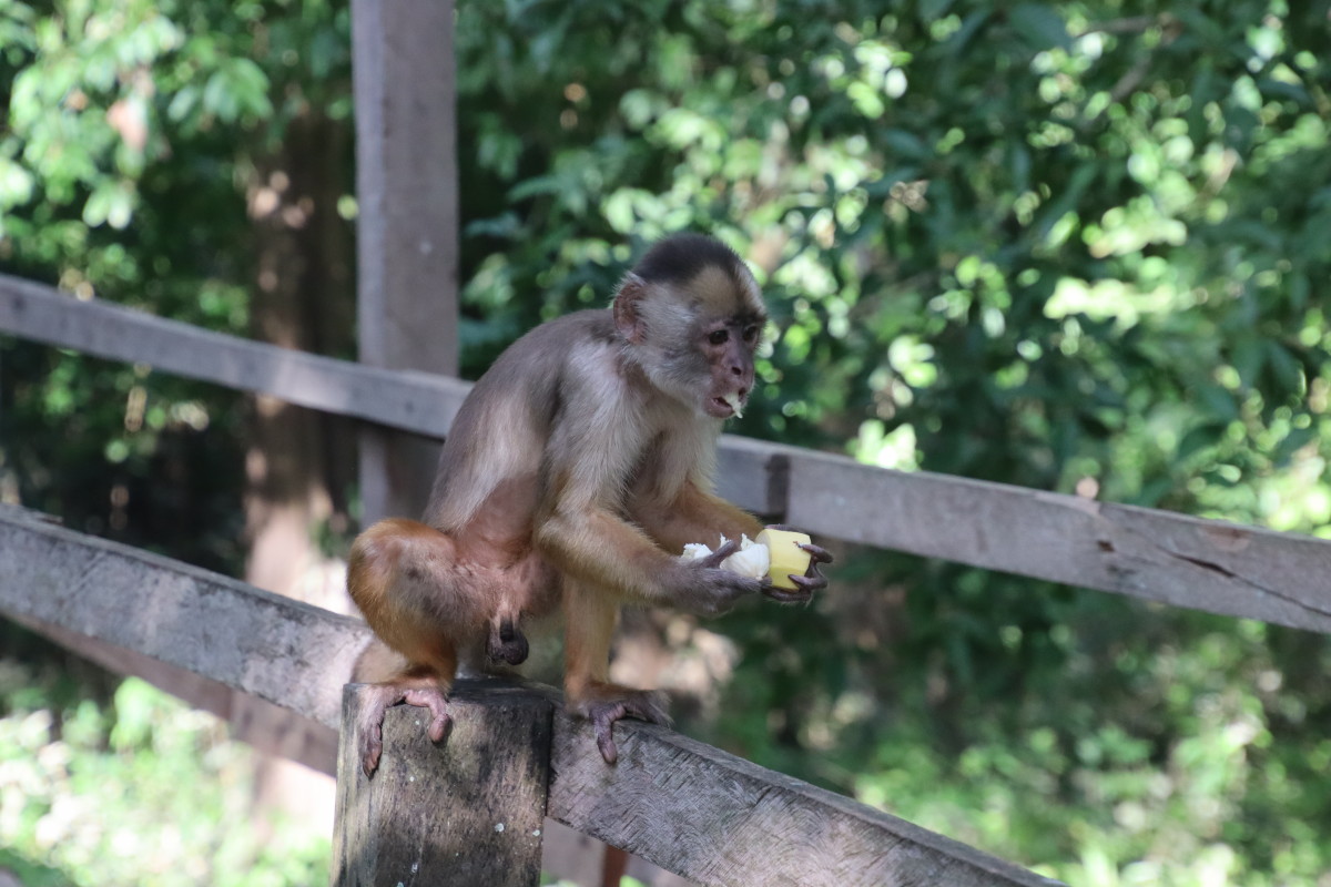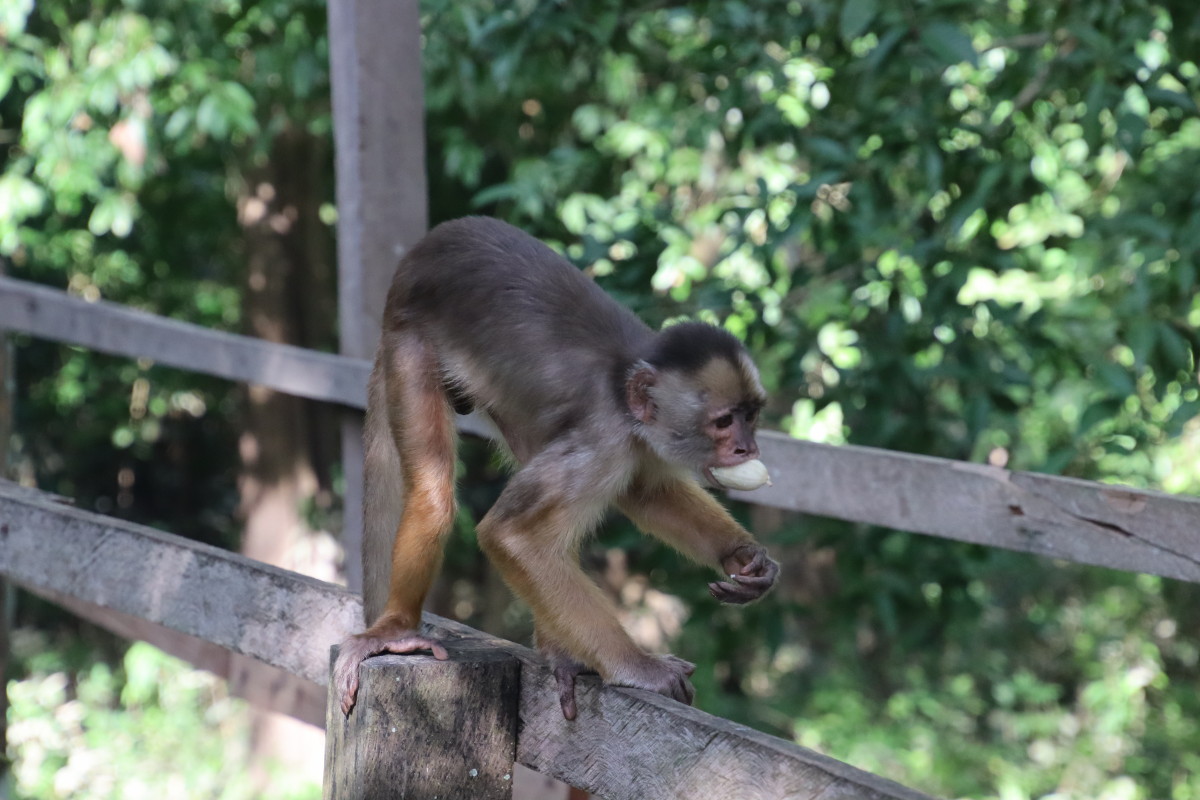 Ballade sur une passerelle à travers la forêt du « Parque Nacional Do Janauari » pour admirer des singes hurleurs et quelques oiseaux jusqu’à un étang ou flottent des nénuphars aux feuilles de près d’1 mètre de diamètre, normalement il y a des crocos qui si promènent mais pas aujourd’hui.