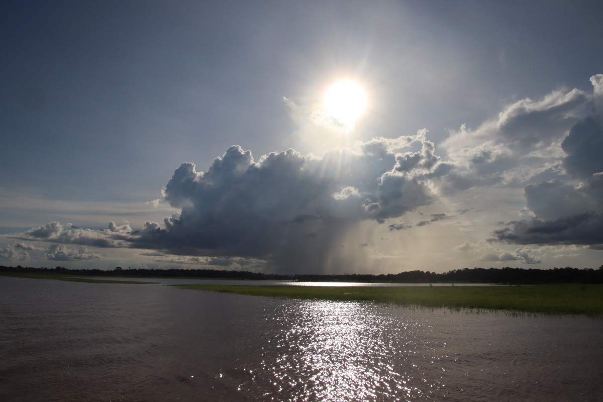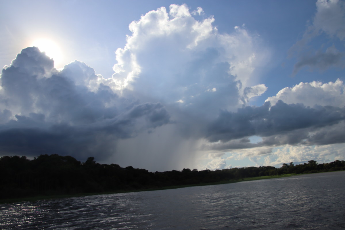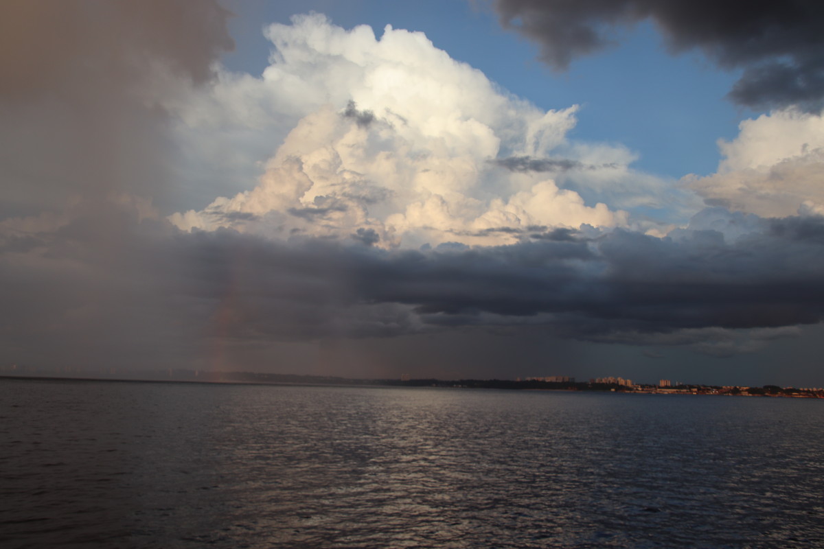 Pour la nuit nous continuons la remontée du fleuve en passant sous le pont. Juste avant la tombée de la nuit nous sommes cueillis par deux gros orages accompagnés de fortes pluie. Mais le mauvais temps s’éloigne rapidement et nous nous amarrons à la rive bien à l’abri dans une petite crique de la rive sud d’Amazon Island.
