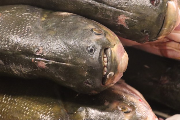 La partie du marché la plus impressionnante est sans aucun doute celle du poisson: issus exclusivement du (des) fleuve(s) ils sont d’une variété étonnante. On retiendra: le plus gros de tous l’arapaima ou pirarucu, le plus connus le piranha, le tambaqui très gros lui aussi et il mange principalement des fruits, et le poisson chat blindé et son armure digne d’un film de science fiction mais il y en a des dizaines d’autres dont nous n’avons pas retenu les noms.