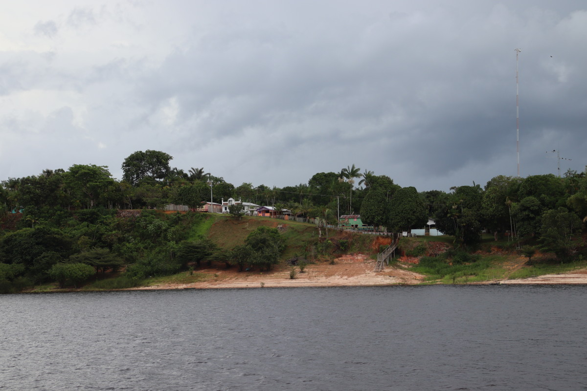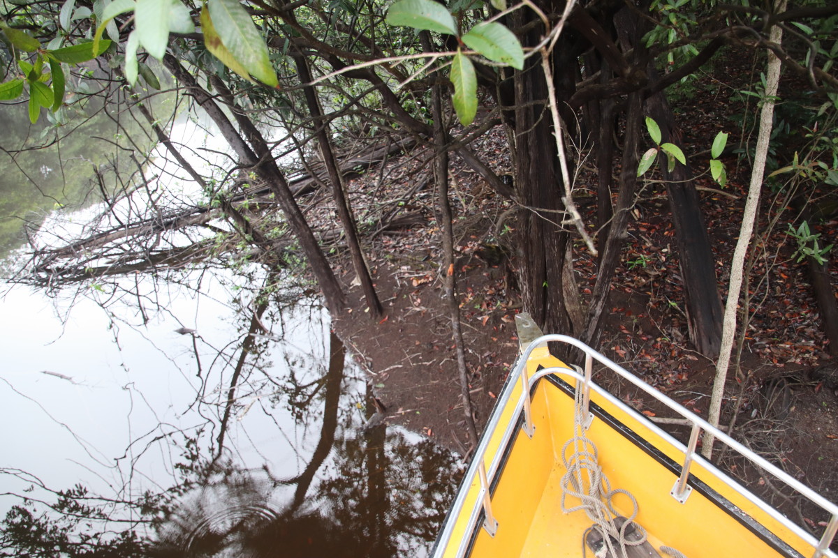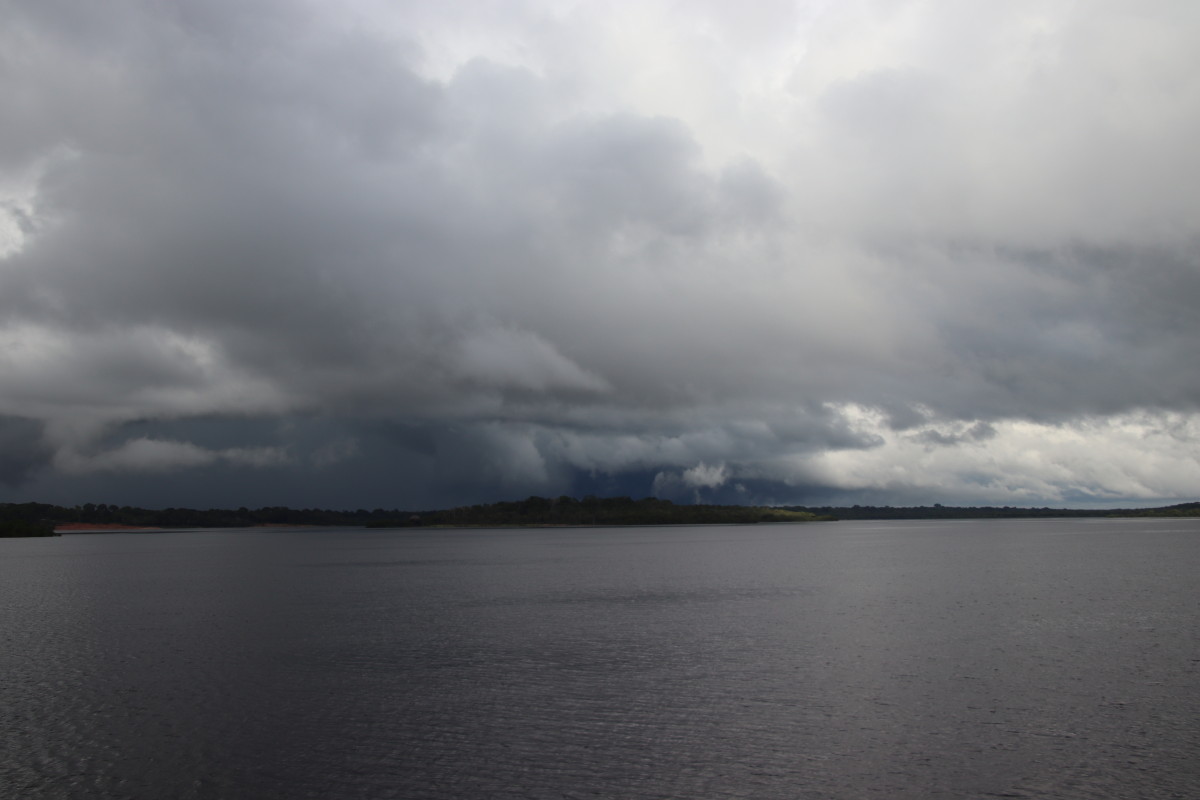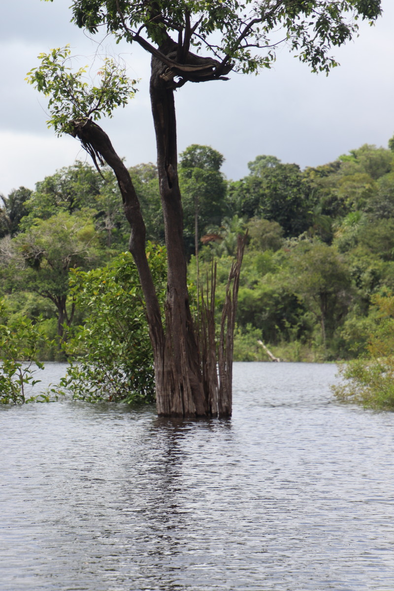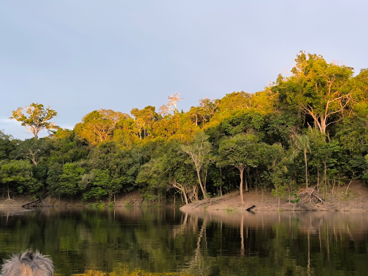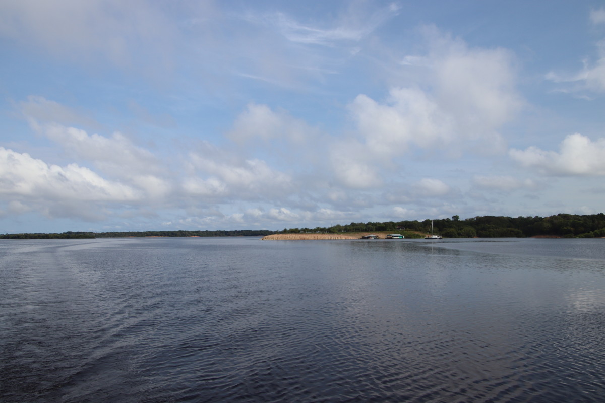 Après un bon moment dans l’eau chaude et claire (vu sa couleur on se croirait dans une grande tasse de thé) on continue la remontée du fleuve. Pose déjeuner dans une petite crique, juste avant Santa Maria. On en profite pour laisser passer un gros orage avec des pluies diluviennes. nous ne sommes qu’au début de la saison des pluies et le niveau du fleuve est encore bas. L’orage passé on continue la remontée du fleuve et on se niche tout au fond d’un adorable petit bras latéral juste à la tombée de la nuit.