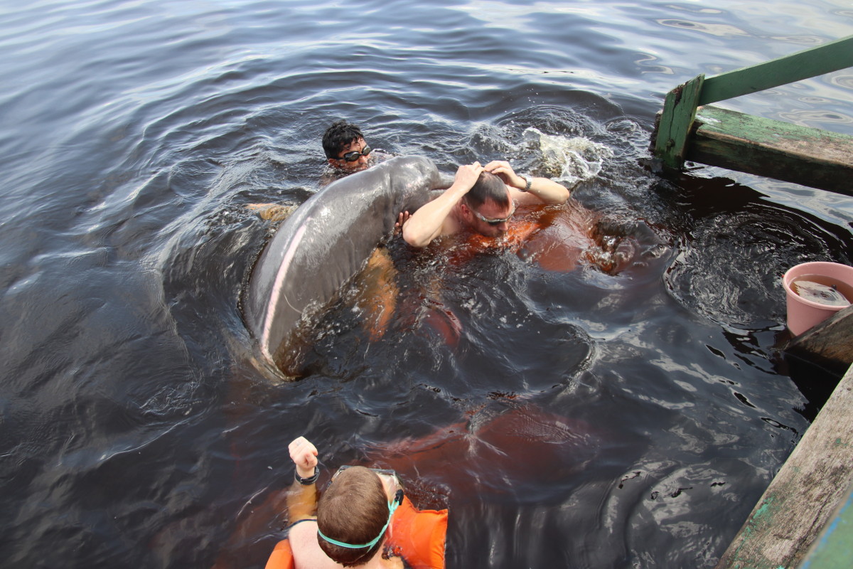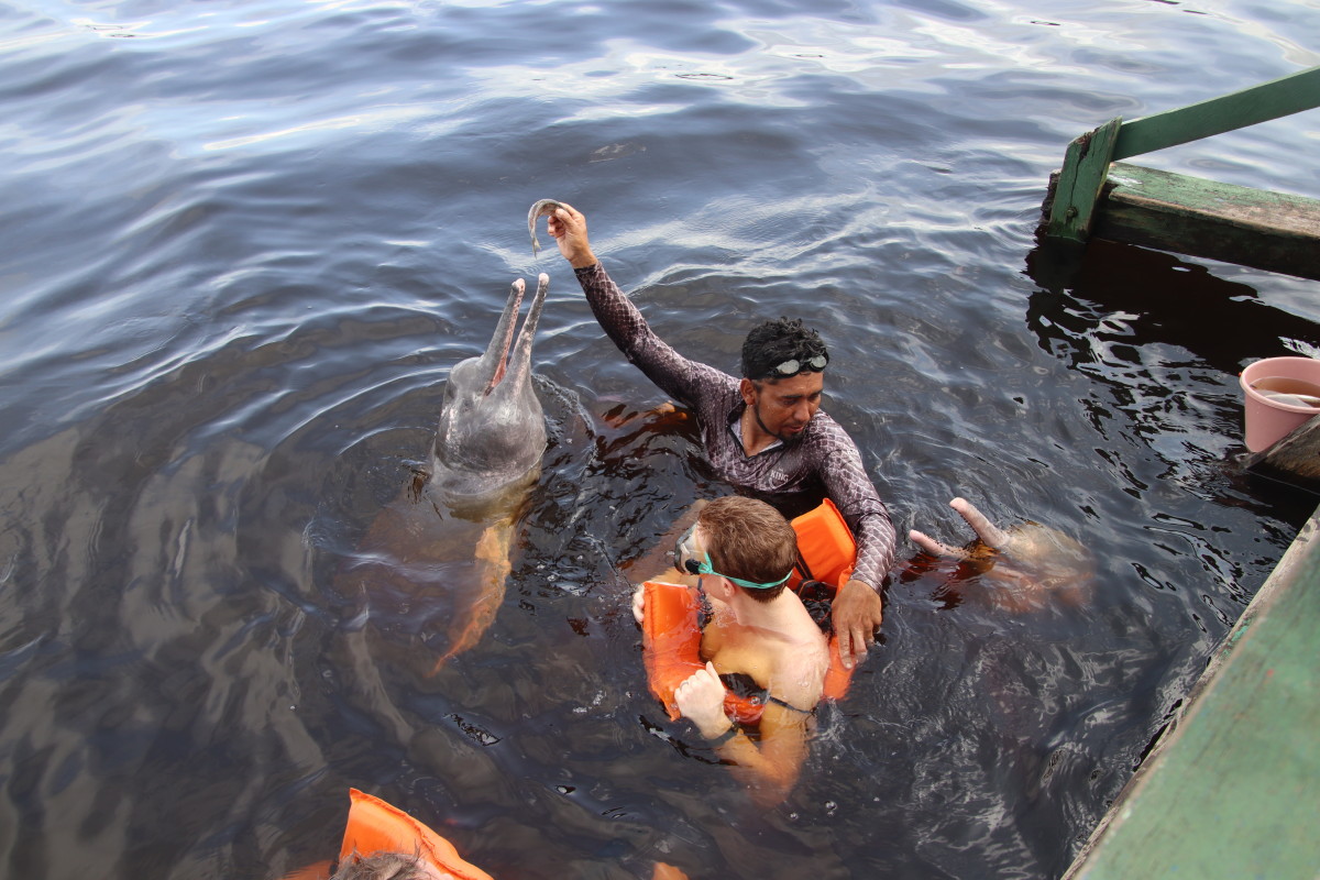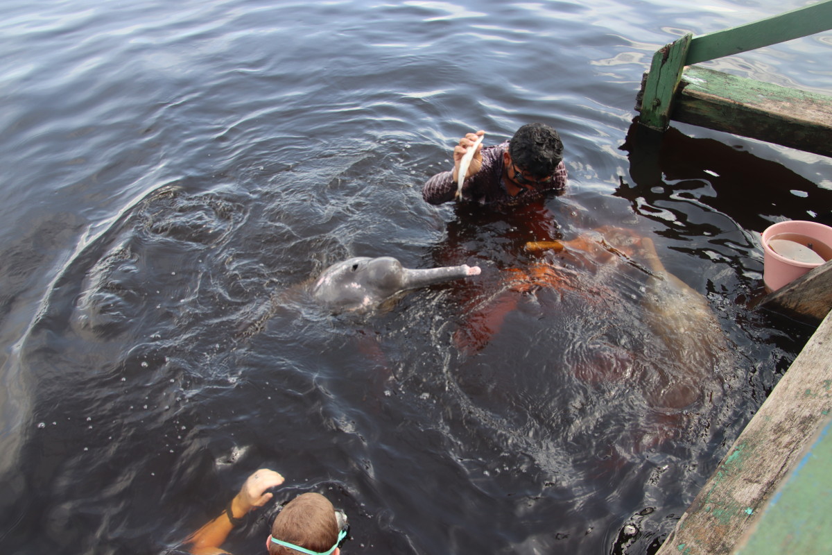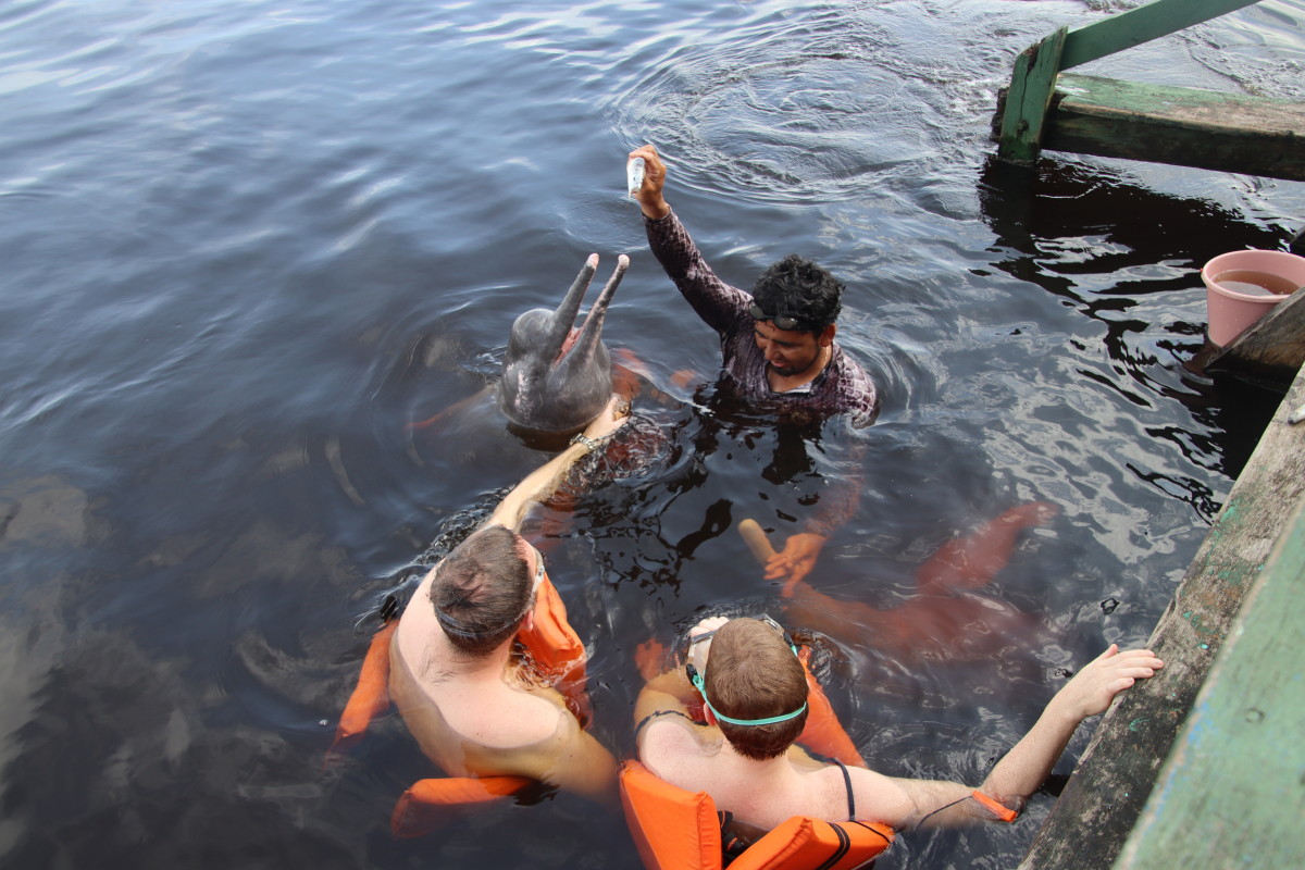 L’activité du jour c’est une baignade avec les dauphins roses. Espèce endémique du bassin de l’Amazonie vivant exclusivement en eau douce. Ce sont des dauphins sauvages vivant ici en liberté. C’est assez drôle de jouer avec eux pendant que le montreur les attire avec des poissons mais ce n’est pas écologique car il deviennent dépendant de l’homme pour une part non négligeable de leur nourriture.