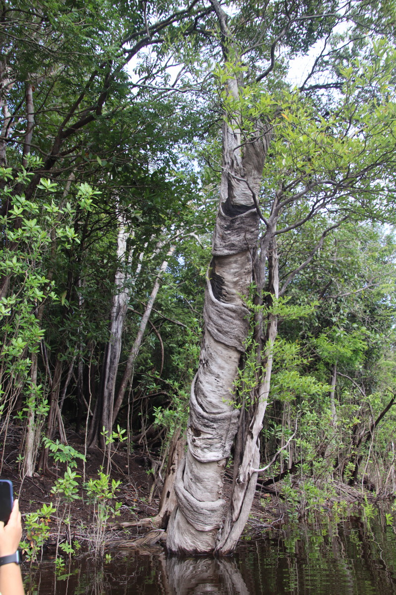 Le matin suivant, Bachir le marin nous amène sur l’embarcation du bateau explorer la rivière est ses bras aux alentours. Il y a quelque chose de différent à découvrir au détour de chaque méandre, végétal ou animal. Les oiseaux sont particulièrement présents. on passera un petit moment à observer les Cassiques huppés ces oiseaux noirs au bec et à la queue jaune qui construisent leur nids suspendus aux branches d’un même arbre rassemblant toute une colonie. Des légendes circulent à leur sujet. il y aurait eu un pacte entre une déesse, des humains et ces oiseaux et qui expliquerait leur comportement.