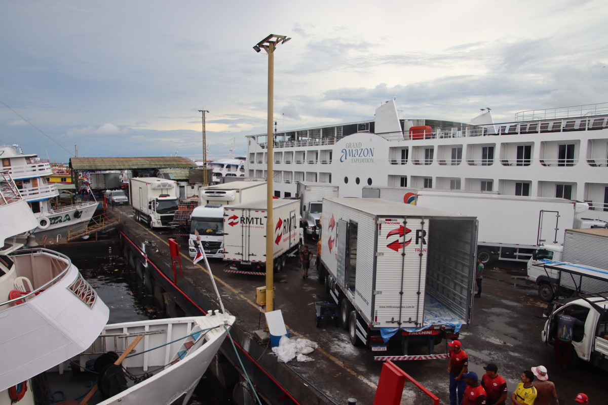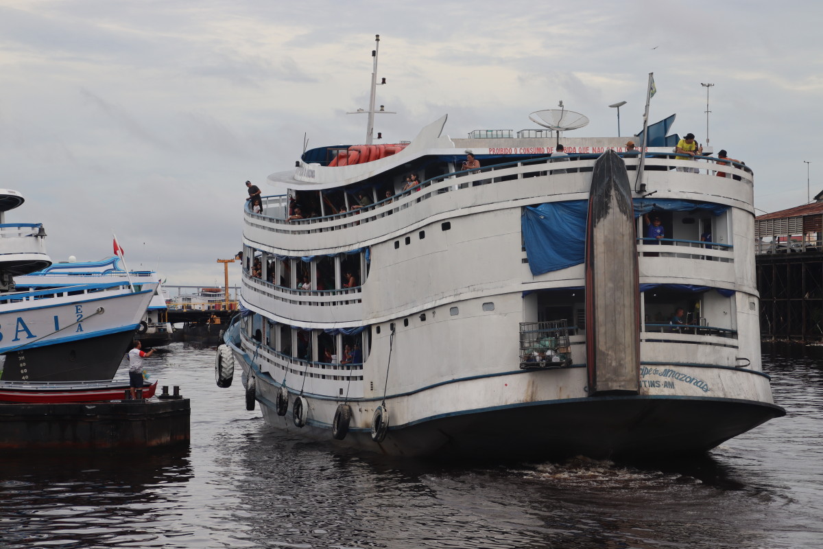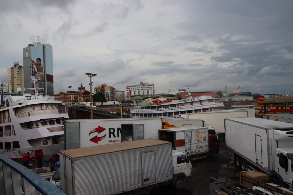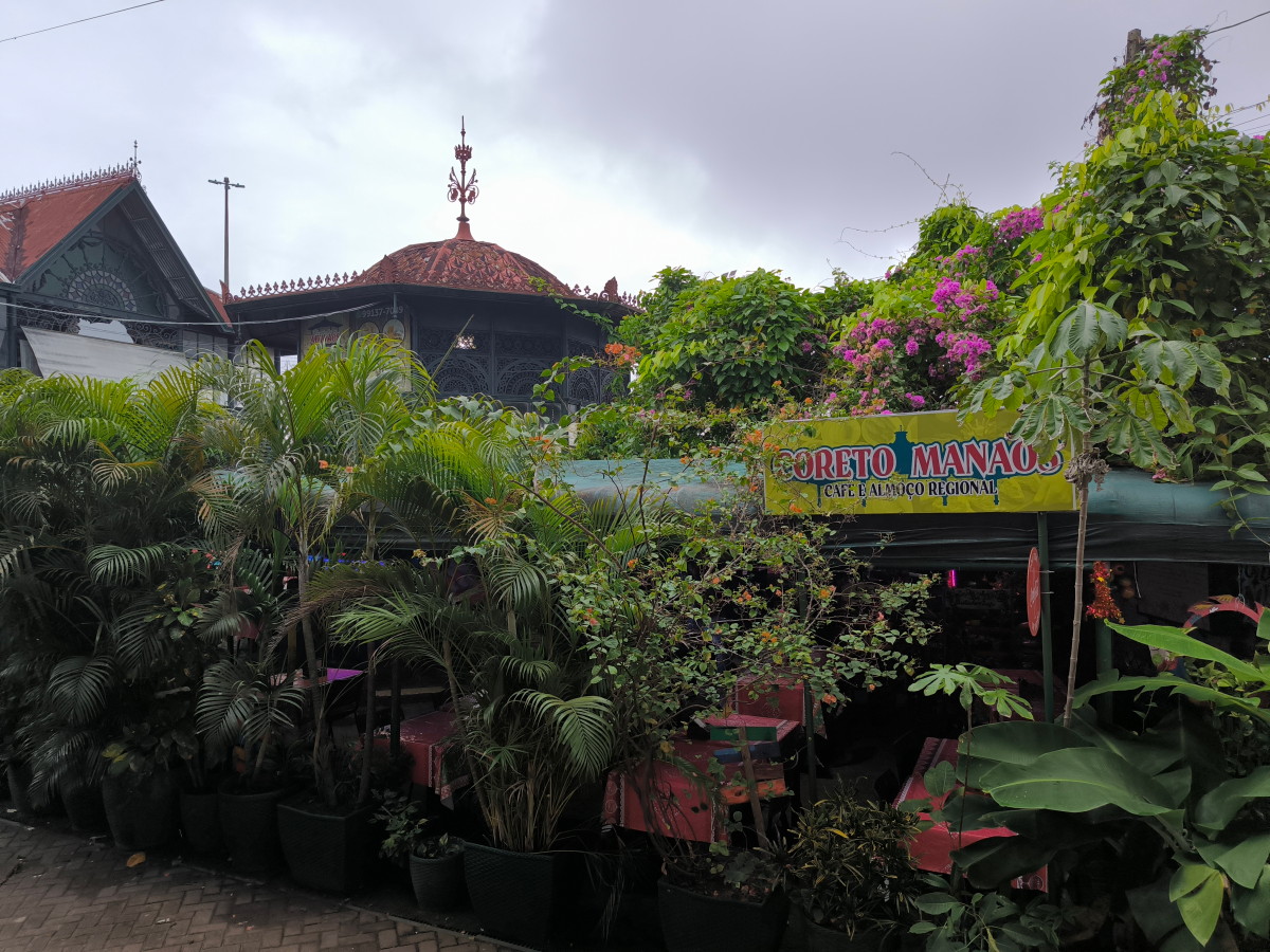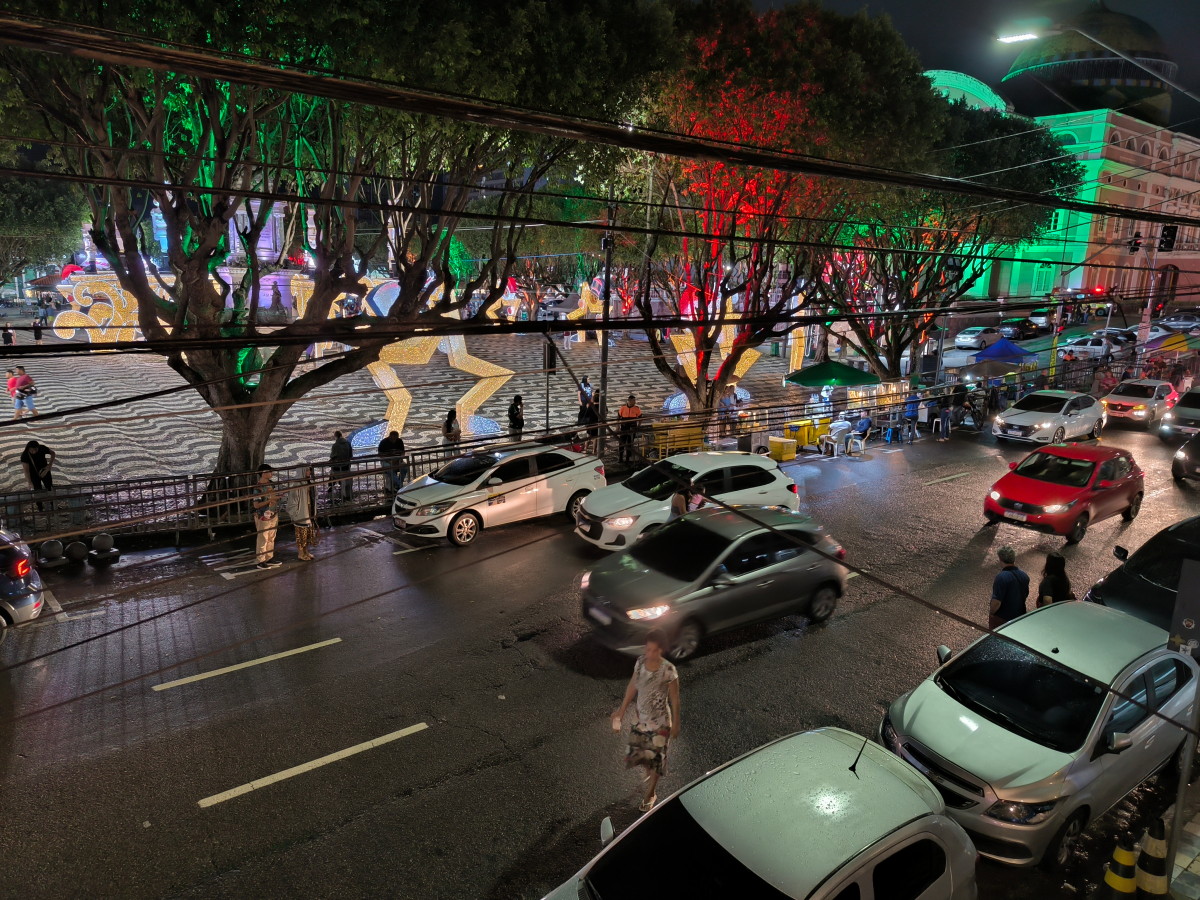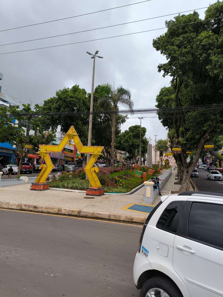 Nous sommes donc à l’aèroport de Manaus. Tous les agents de voyage nous confirme aucune place disponible avant le 27 décembre quelque soit la destination. Nous ne sommes que le 18/12 il va falloir trouver une autre solution pour rentrer à bord. L’option ferry pour Belém et bus pour Joao Pessoa semble la seule encore possible. Au moins si on ne rentre pas tour de suite on pourra voir du pays ! Mais le prochain ferry ne part que le 20. On se trouve rapidement une chambre d’hôtel et on rentre en ville en Uber. Le réceptionniste nous explique très gentiment comment prendre un billet de ferry (agent officiel à l’entrée du marché municipal Adolpho Lisboa). On dîne fort agréablement à une terrasse sur la place du Teatro Amazonas illuminée où se tient le marché de Noël.