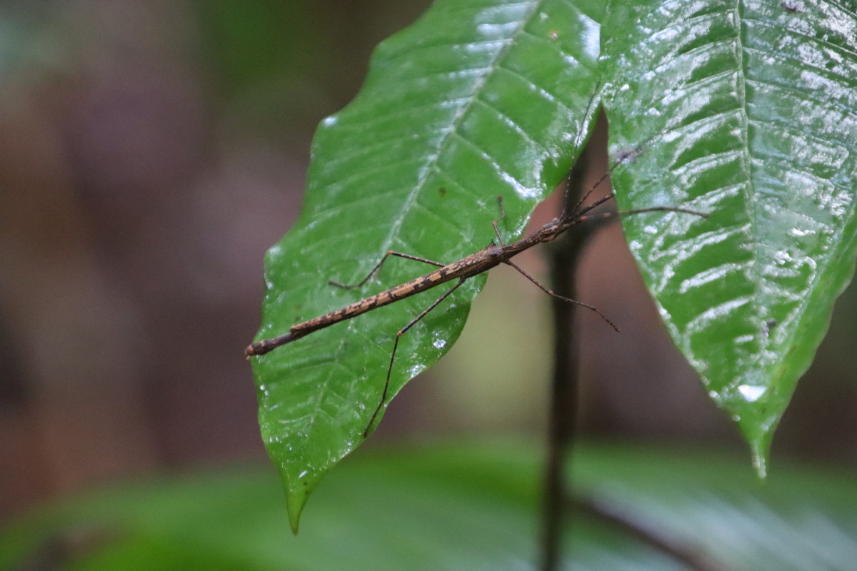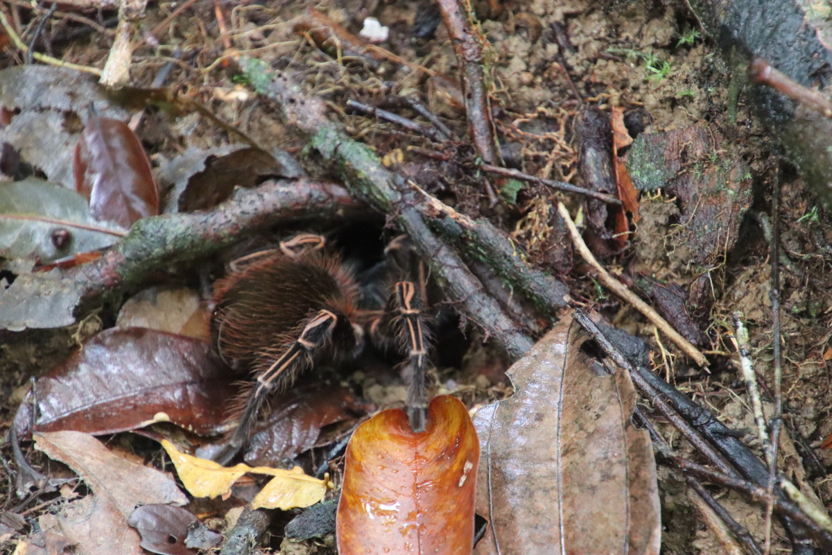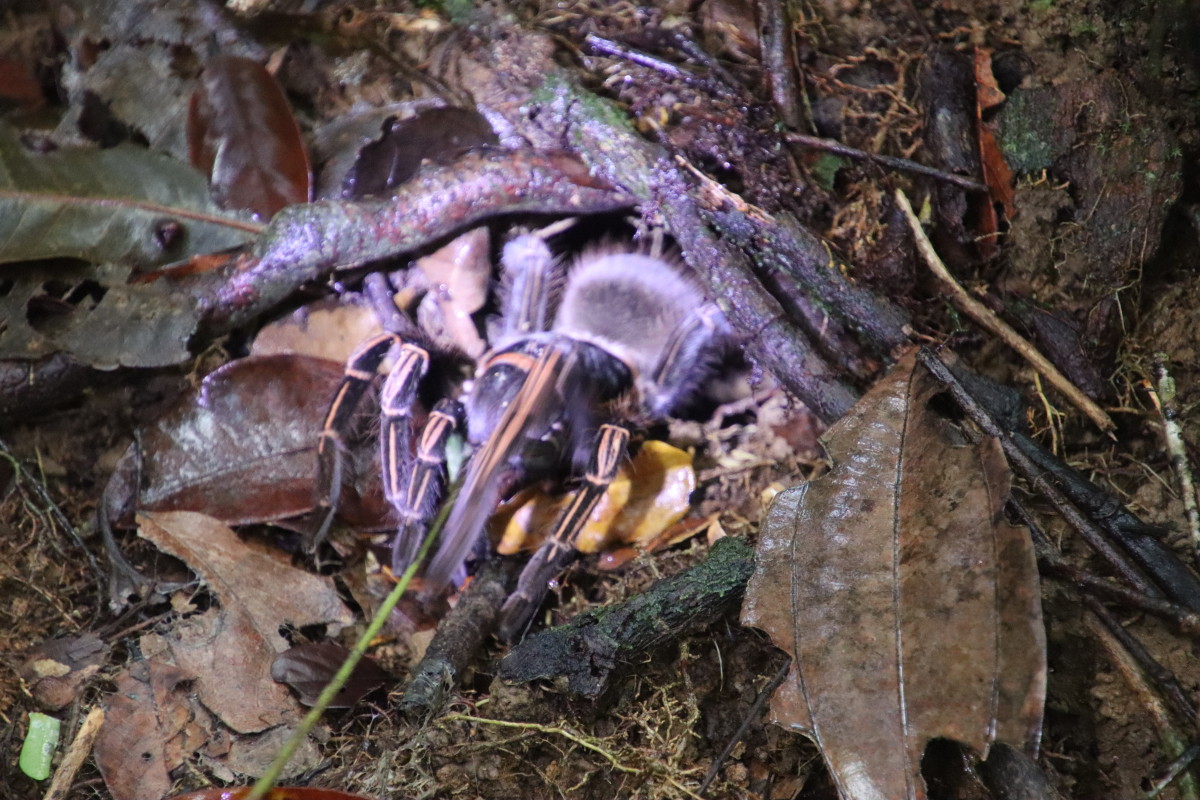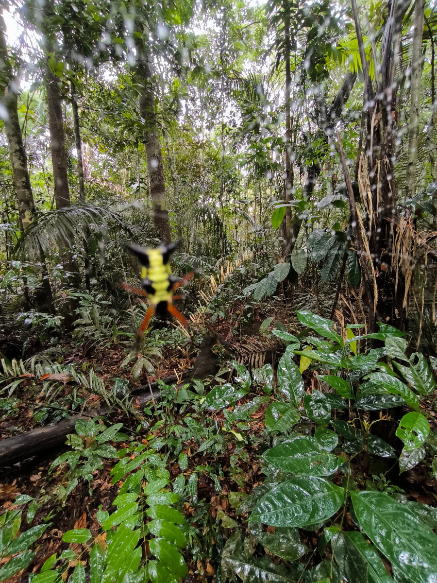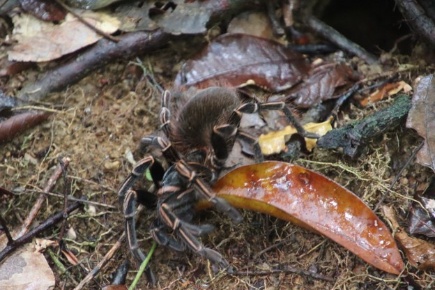 Nous sommes à une vingtaine de kilomètres seulement de la forêt où nous étions hier matin. Et pourtant elle est à la fois la même est très différente. Et au niveau bestioles on est carrément gâtés. En plus des petites araignées colorées dans leur toile on a le plaisir de faire la connaissance d’un superbe phasme et surtout d’une mygale énorme.