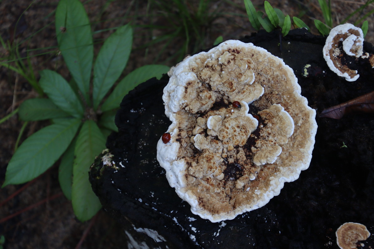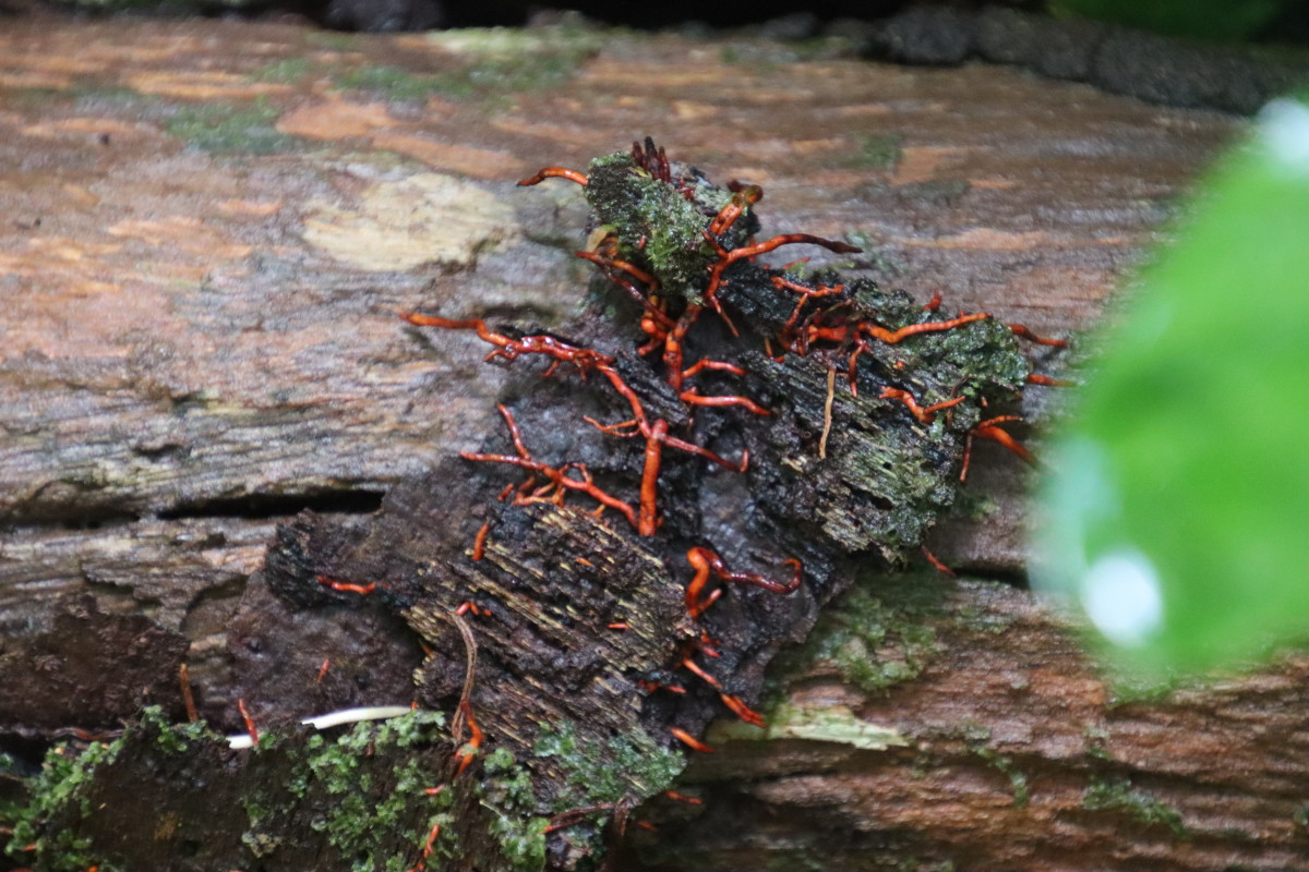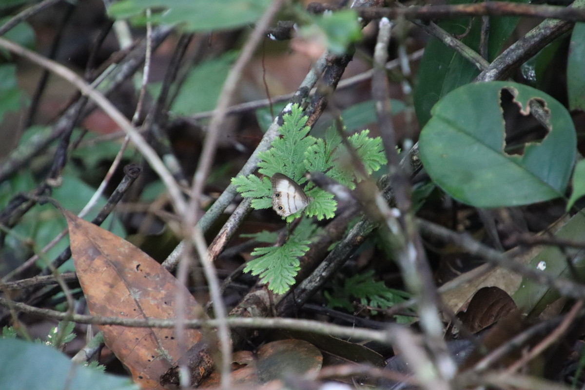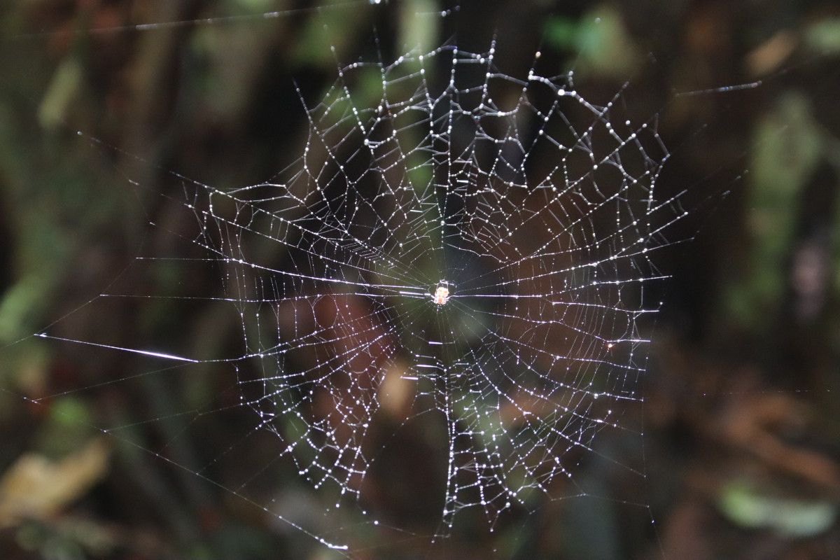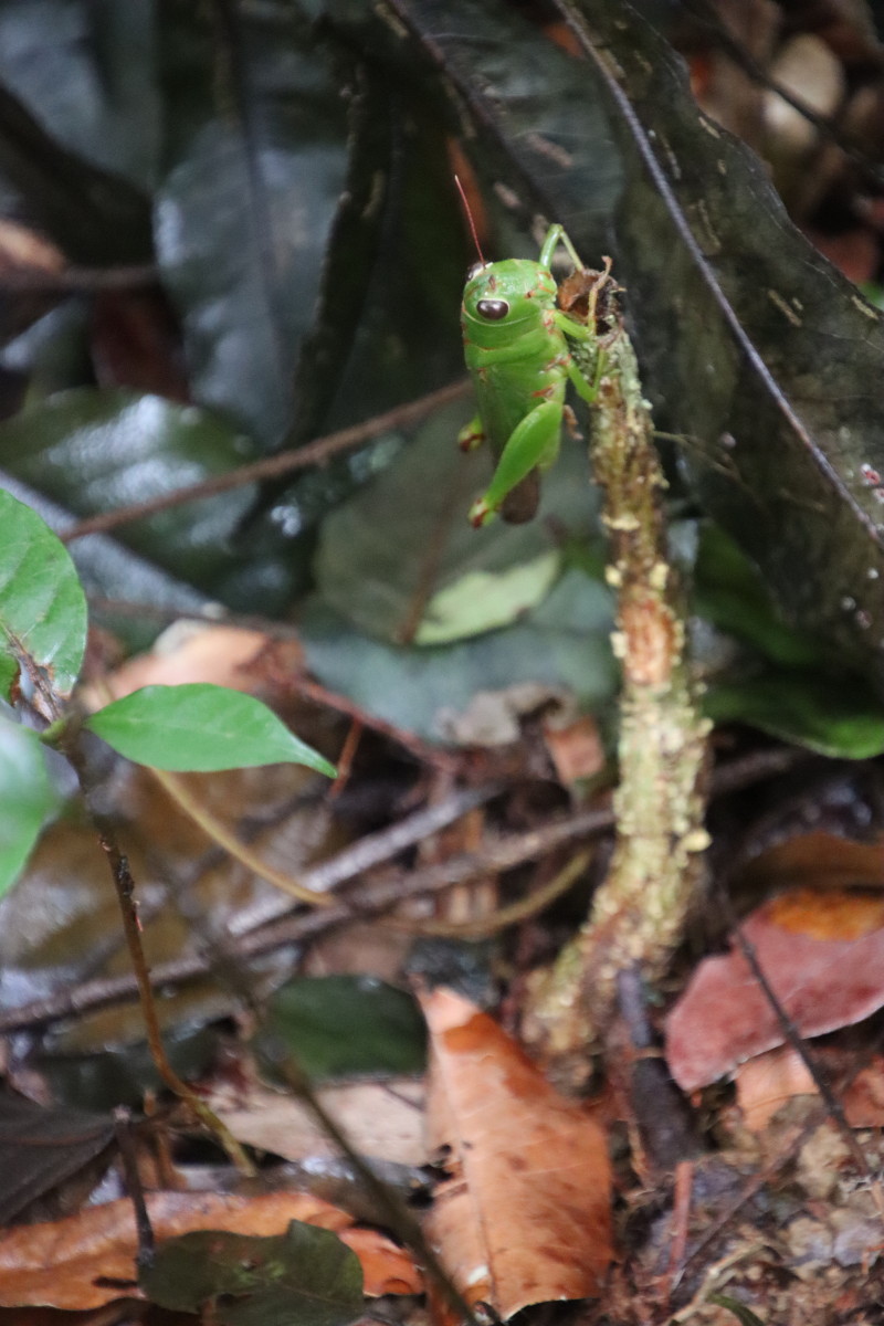Nous sommes à une vingtaine de kilomètres seulement de la forêt où nous étions hier matin. Et pourtant elle est à la fois la même est très différente. Et au niveau bestioles on est carrément gâtés. En plus des petites araignées colorées dans leur toile on a le plaisir de faire la connaissance d’un superbe phasme et surtout d’une mygale énorme.