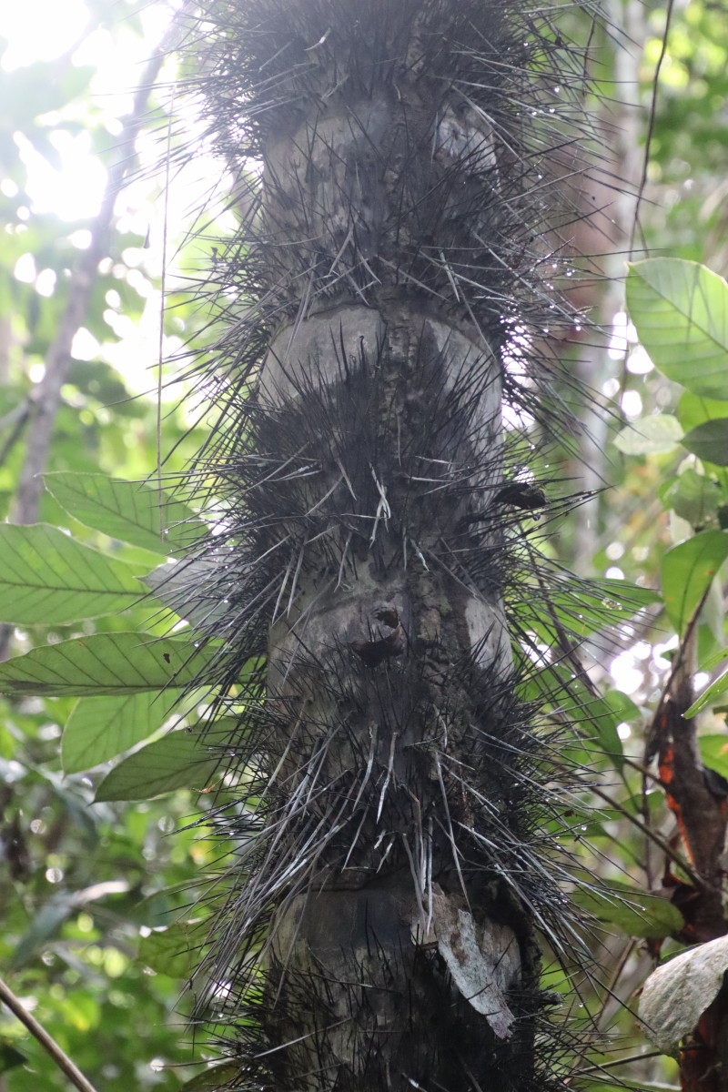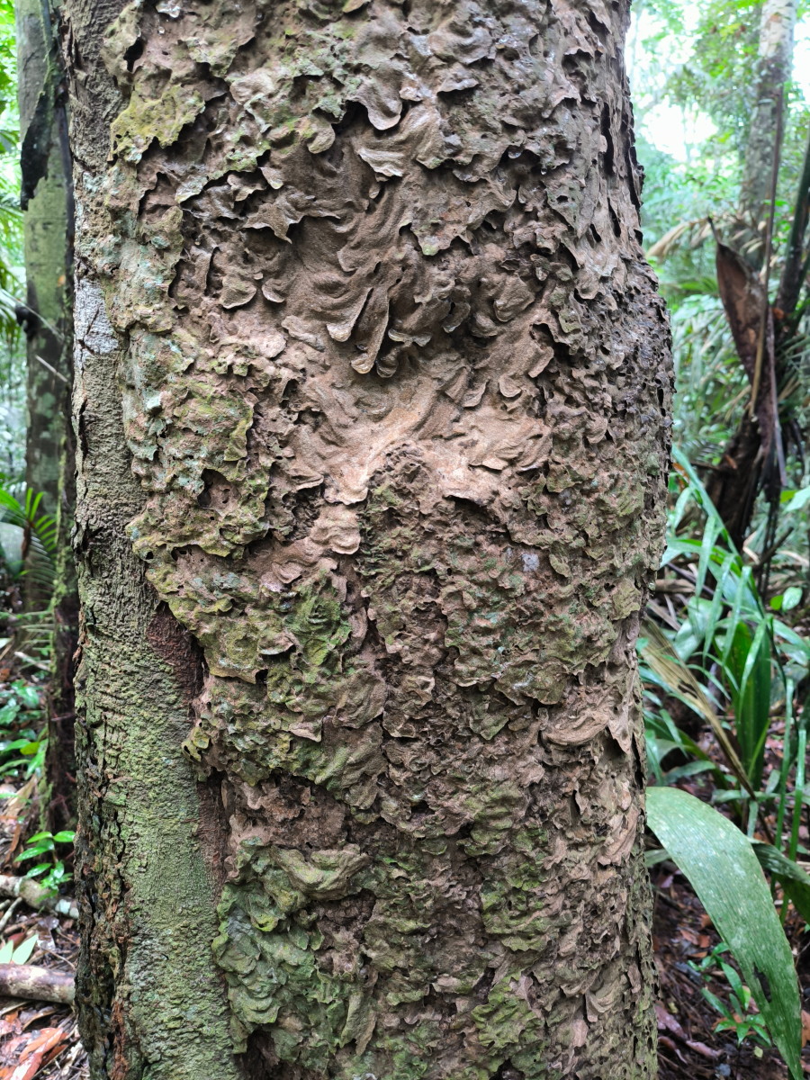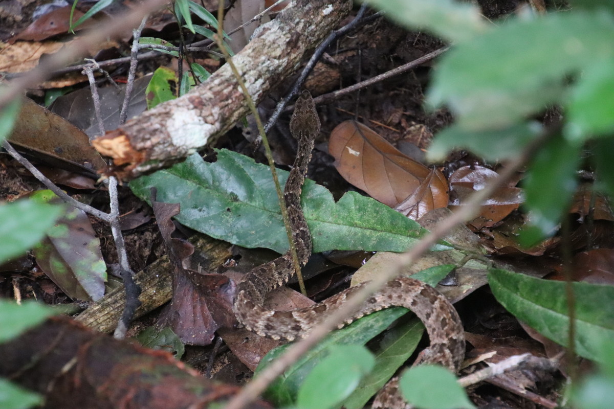 Notre guide et le propriétaire des lieux marchent devant, Anne marche au milieu en s’arrêtant souvent pour faire des photos je ferme la marche en flânant. Soudain, juste où j’allais poser mon pied, j’aperçois un individu rayé se tortillant sur le sol. « Sylvia! vous avez vu il y a un joli serpent là, c’est quoi? » « un serpent c’est pas possible on vient de passer là . On fait super attention mais on a rien vu, il a du traverser entre Anne et toi, surtout ne bouge pas! » disent-ils en cœur. Notre reptile reste là juste le temps qu’on le prenne en photo puis poursuit sa route sinueuse sans même nous regarder. Ce serait un Fer de Lance, serpent assez commun dans tout le bassin amazonien et l’un des plus venimeux.