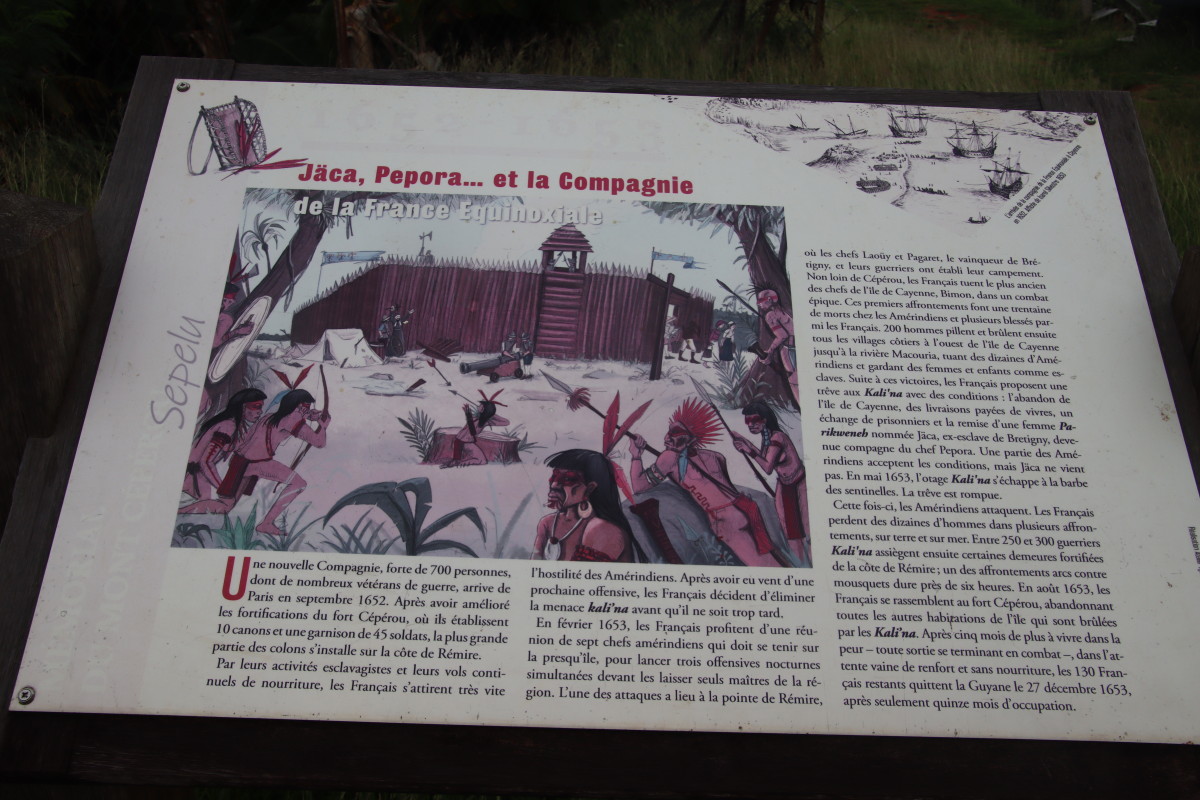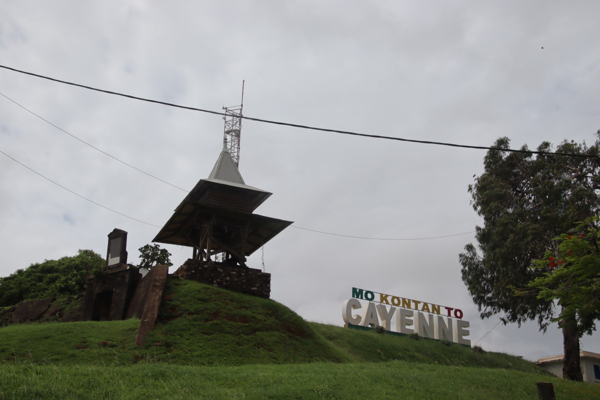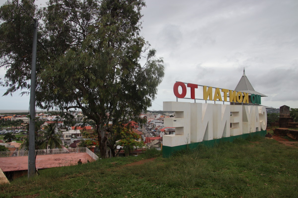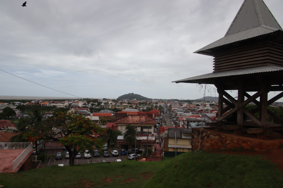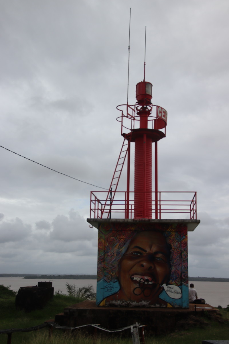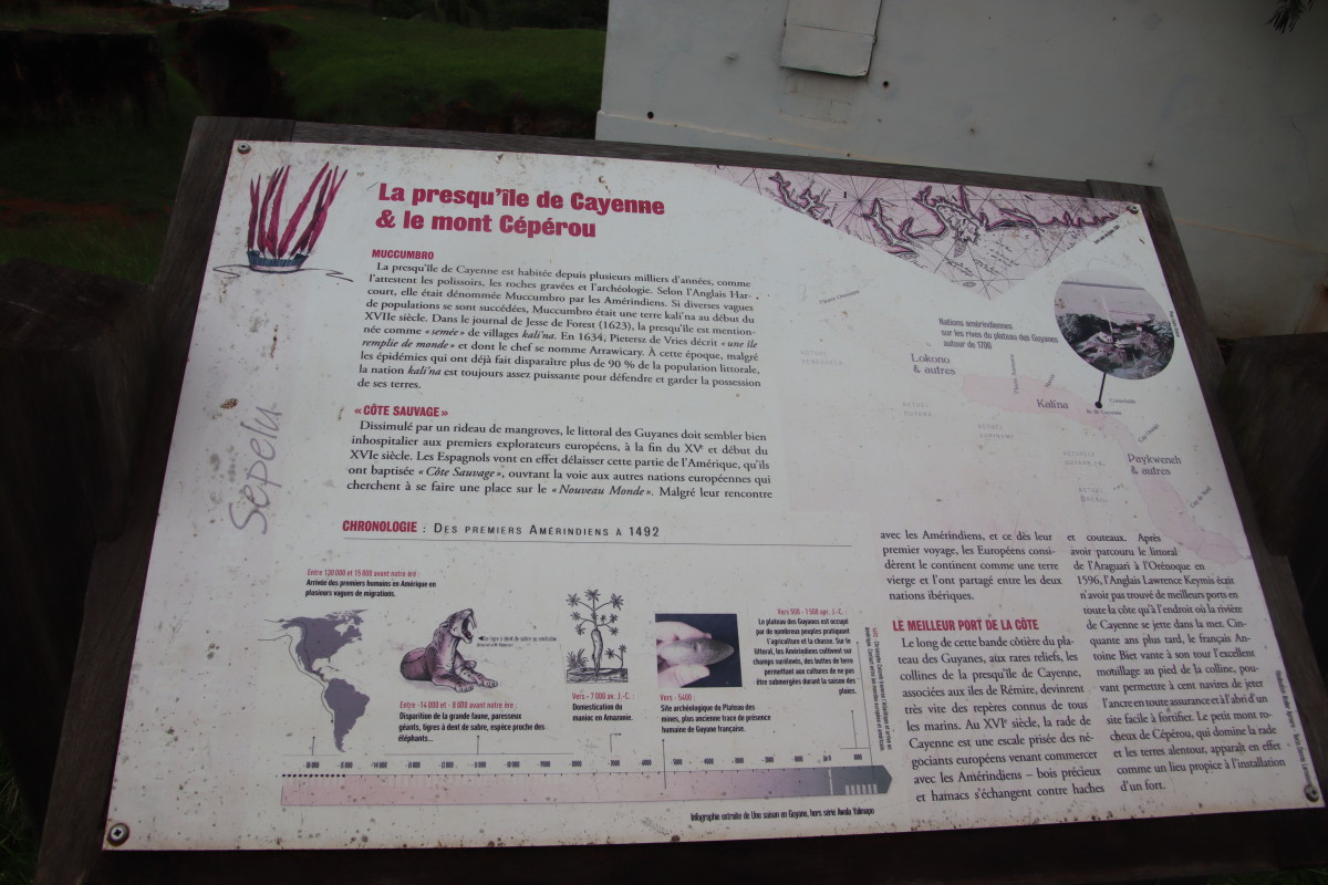 Puis nous grimpons au mont Cépérou accompagné d’un adorable reptile quadrupède. Cette colline domine la cité et l’embouchure. Elle est couronnée par un fort dont le rôle était de défendre la ville contre quelques attaques étrangères mais surtout contre la vindicte des population locales (amérindiennes) qui luttaient pour leur terre et leur indépendance. Elles n’ont d’ailleurs jamais été vaincues mais leur résistance s’est affaiblie quant ils ont été décimés par les maladies importées par les occidentaux. Des panneaux judicieusement disposés autours de la cour du fort rappelle leur histoire et réhabilite leur culture.