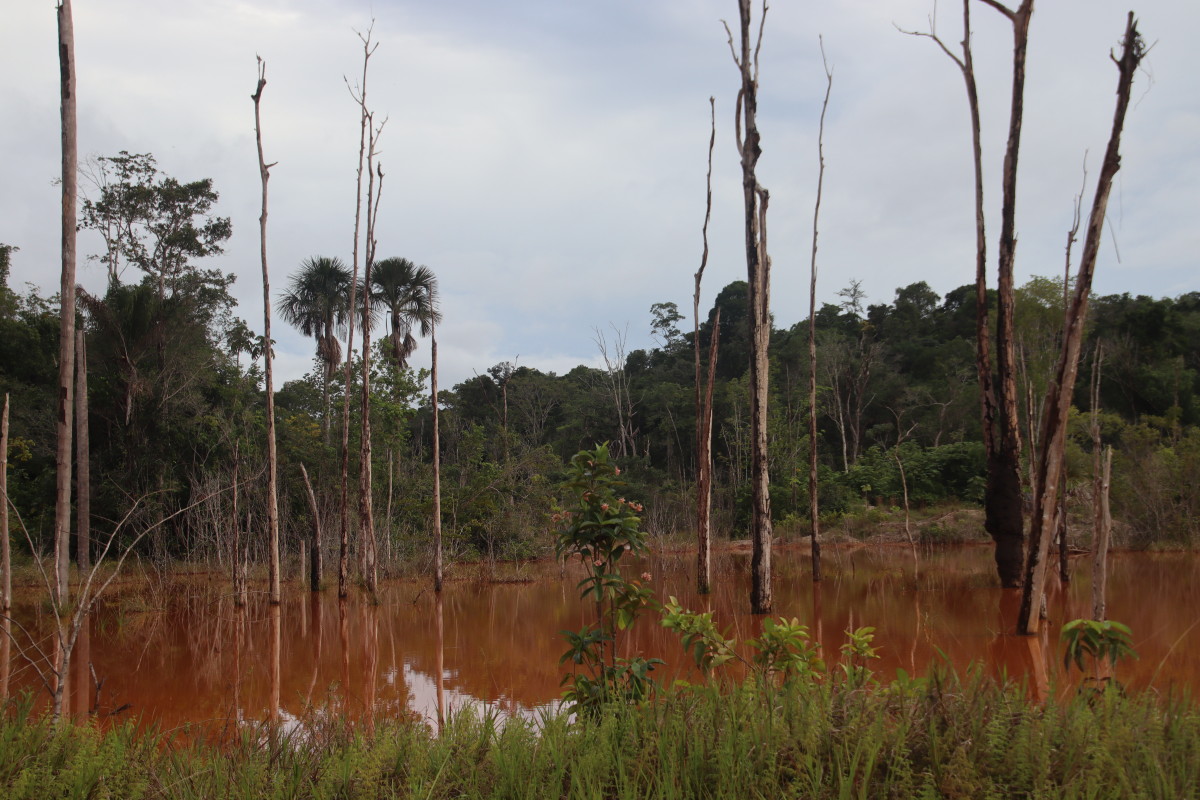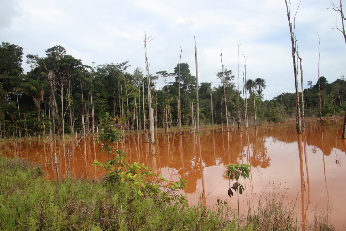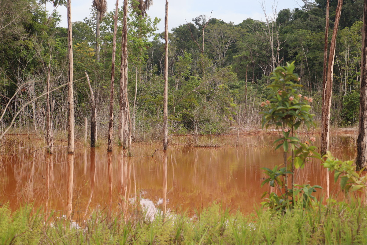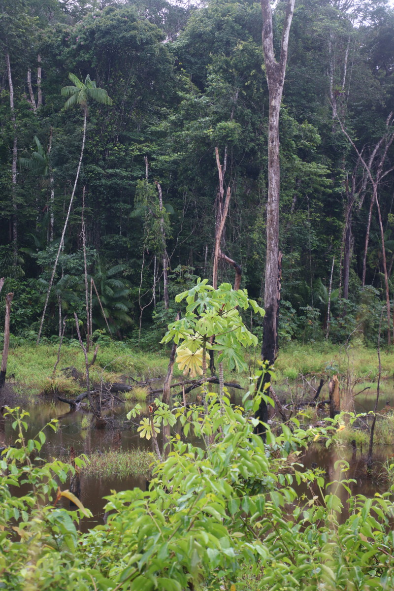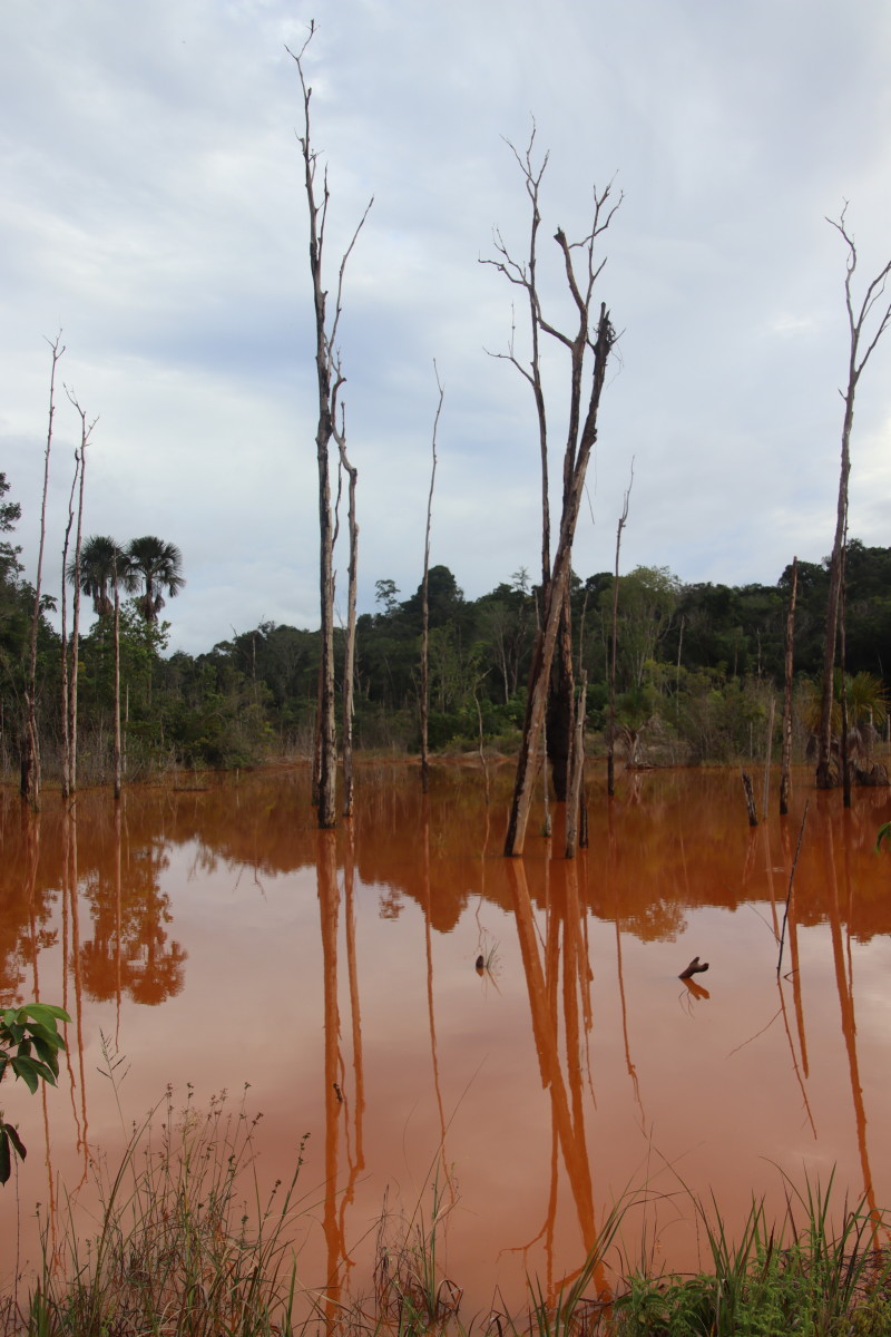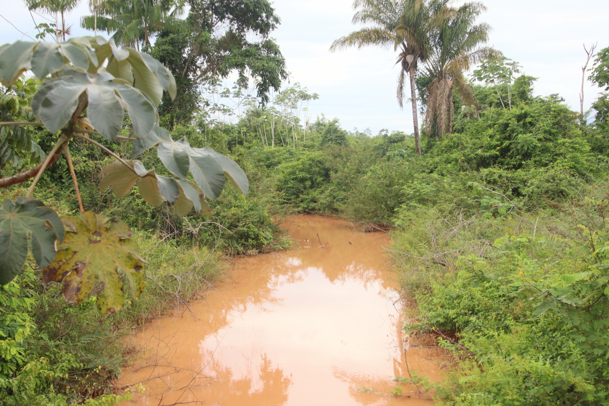 Ici pas d’affleurements sableux, la latérite rouge est partout et colore l’eau de cette couleur rouge foncé. Manifestement, l’eau gagne sur la forêt à certains endroits en raison vraisemblablement de restriction crées par des chantiers d’orpaillage sur ce petit afluent.