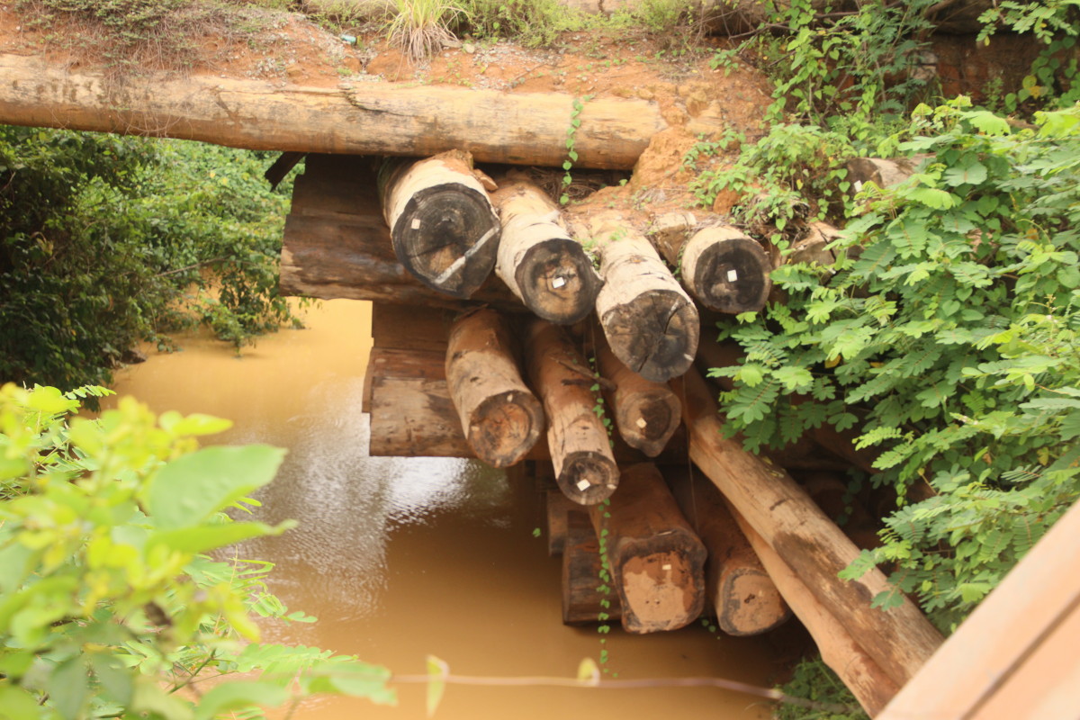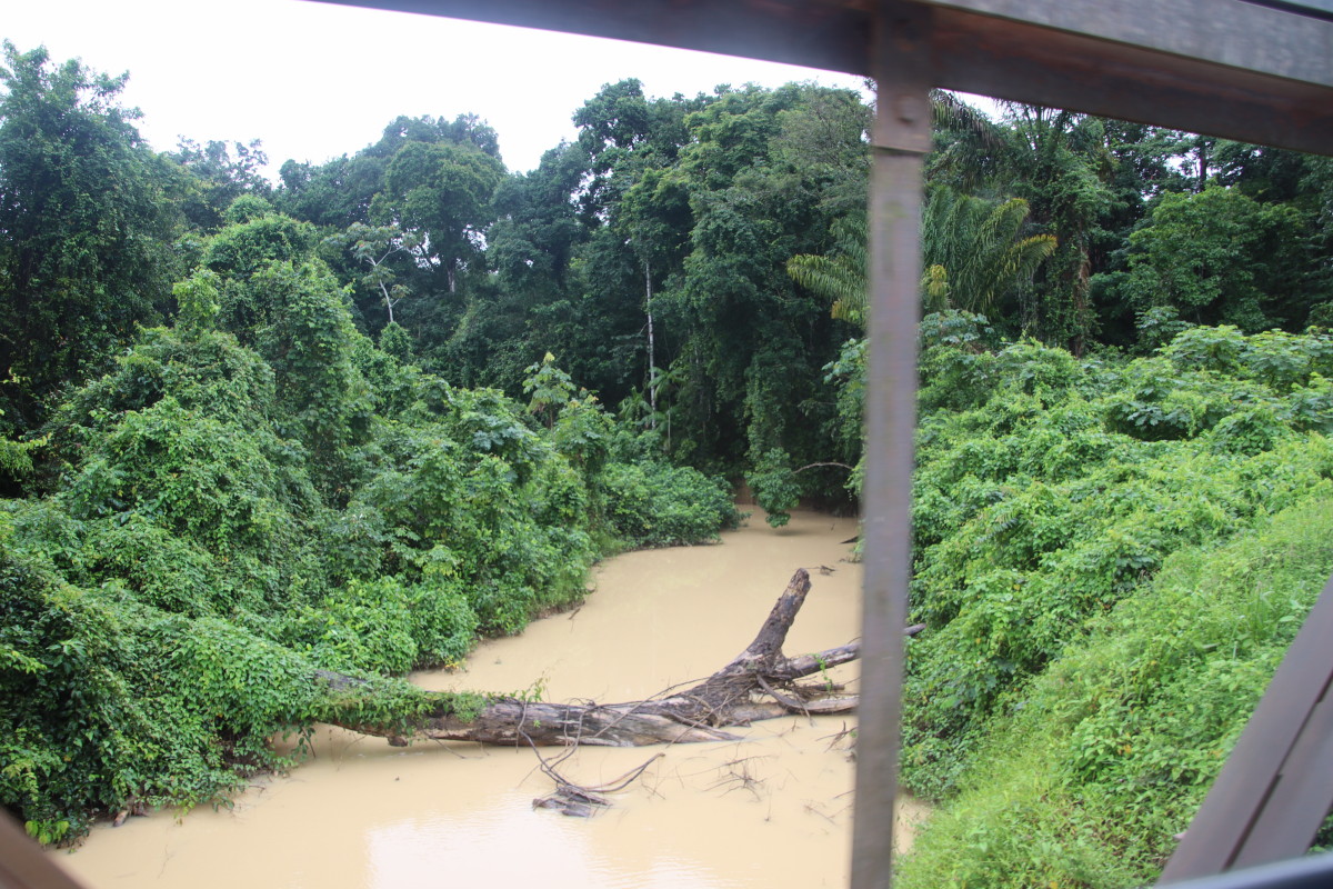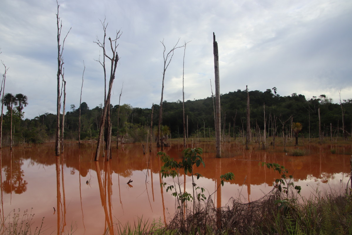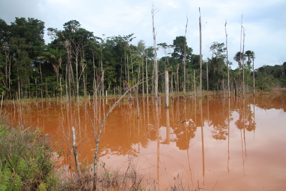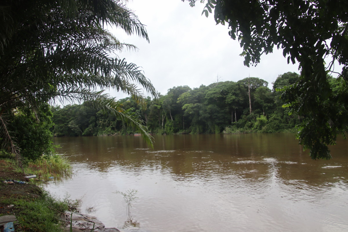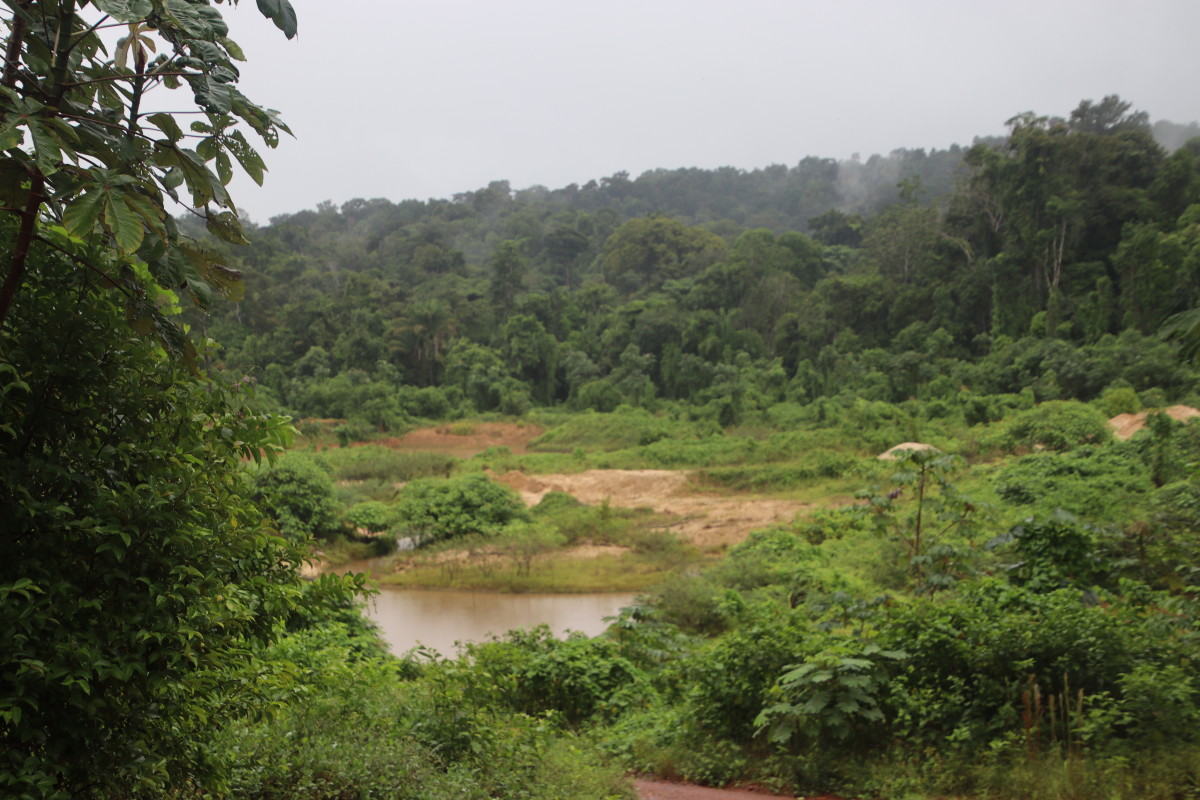 Ici pas d’affleurements sableux, la latérite rouge est partout et colore l’eau de cette couleur rouge foncé. Manifestement, l’eau gagne sur la forêt à certains endroits en raison vraisemblablement de restriction crées par des chantiers d’orpaillage sur ce petit afluent.