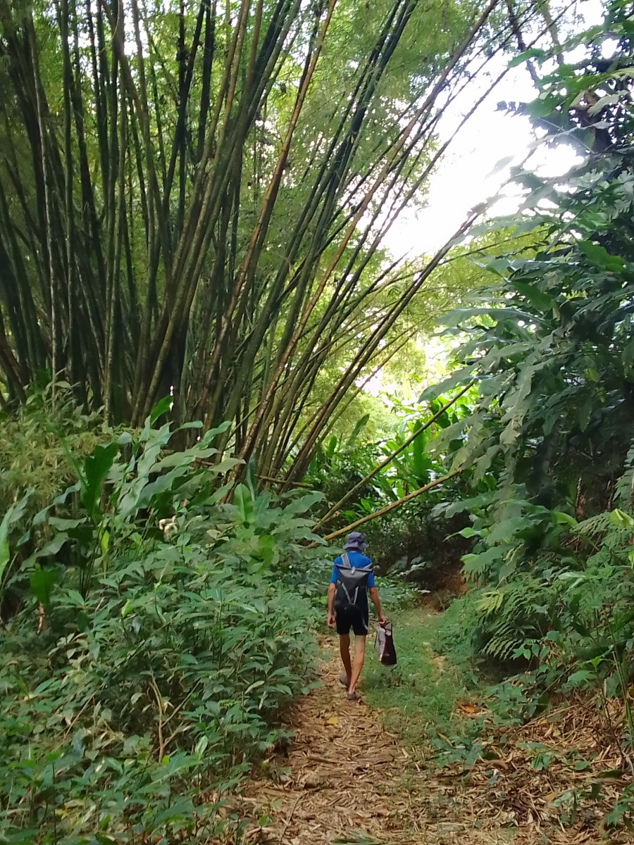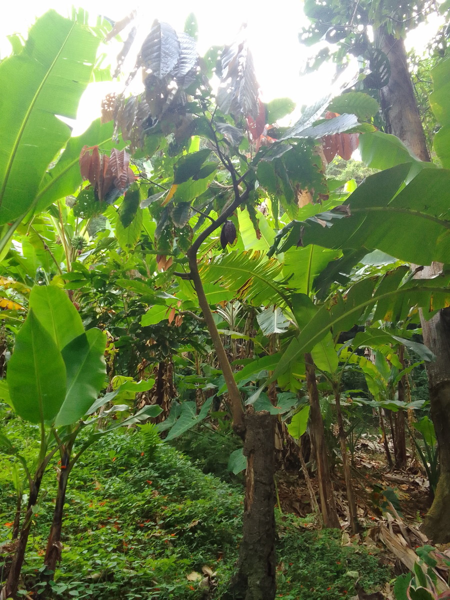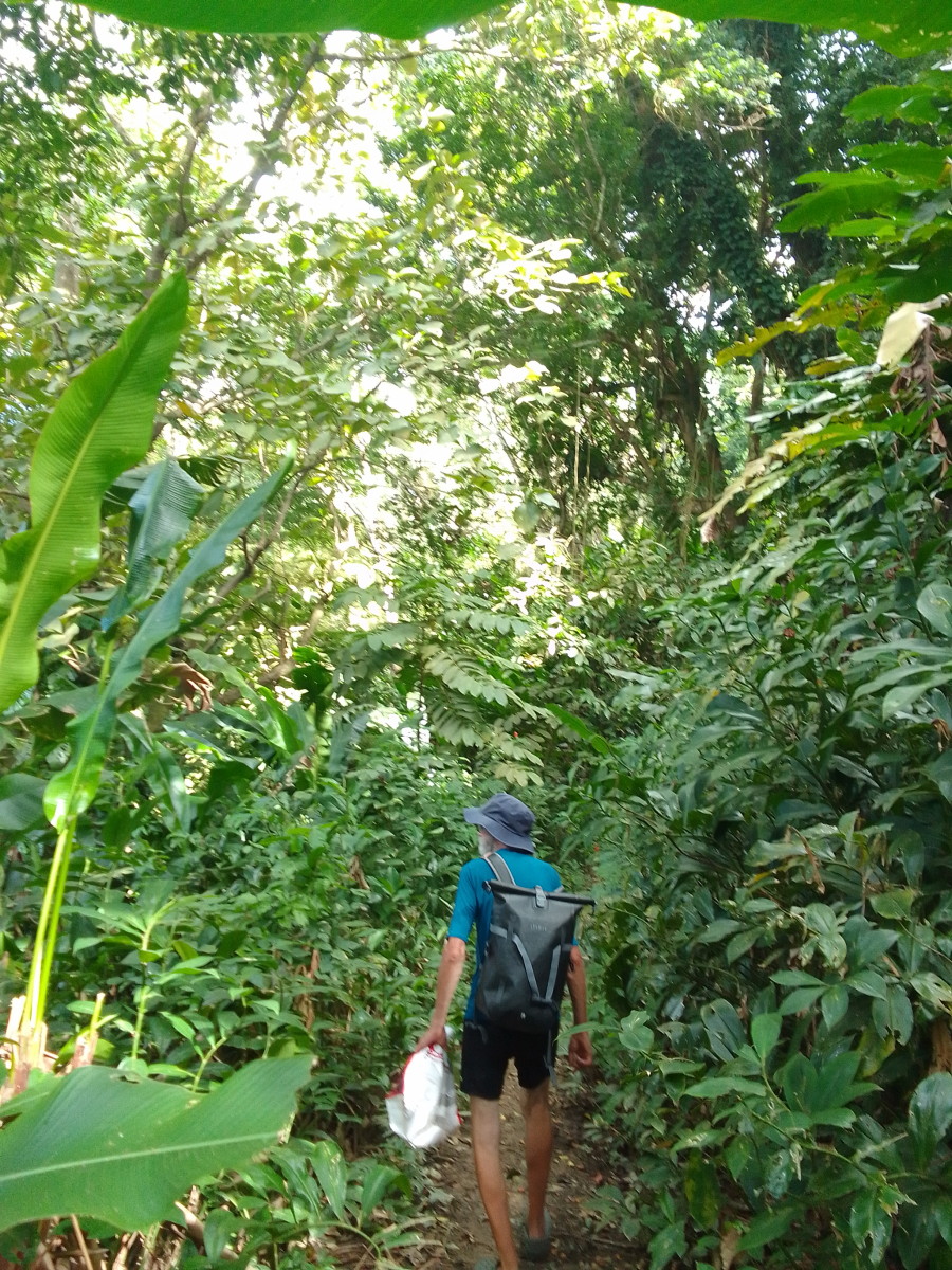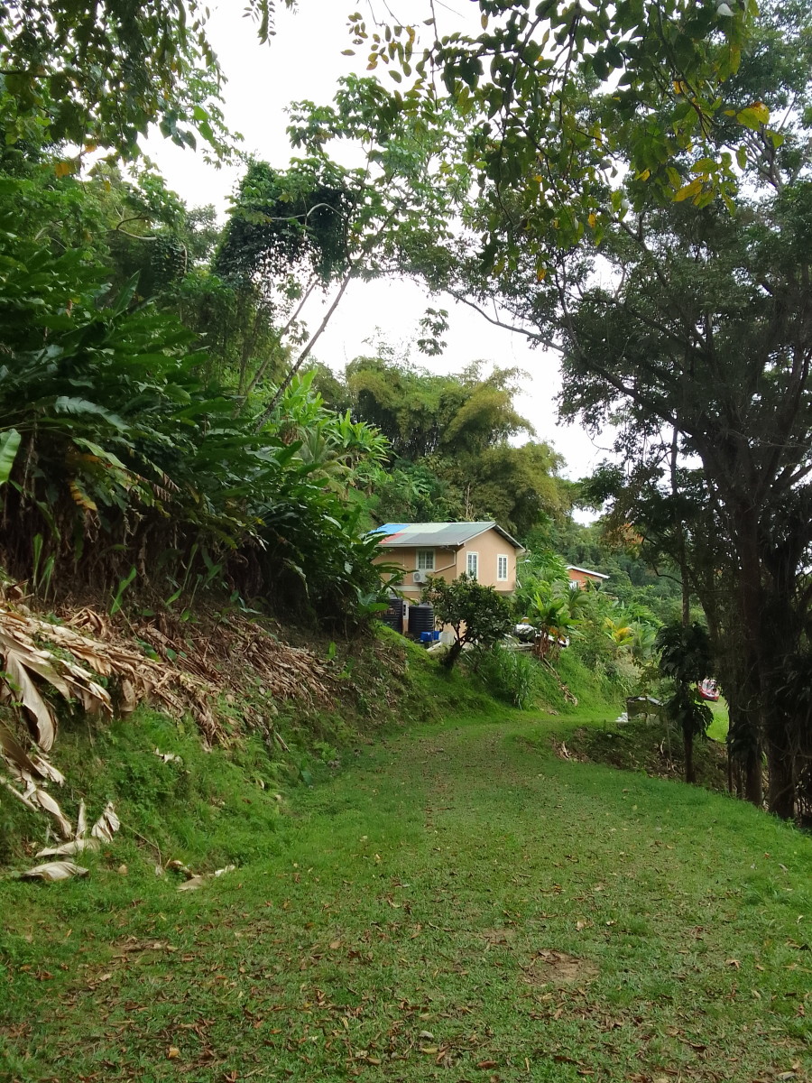 Puis la route goudronnée cède la place à un chemin de terre. La vue commence à être vraiment intéressante. Encore une maison et une petite plantation de banane avec quelques plans de cacao et le sentier s’enfonce dans la foret.