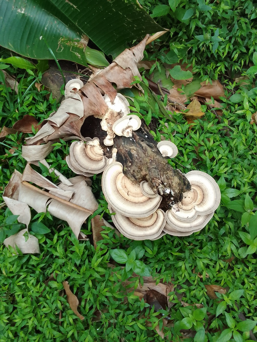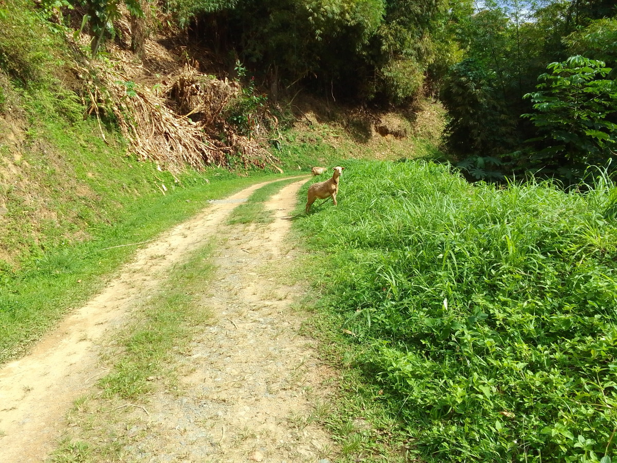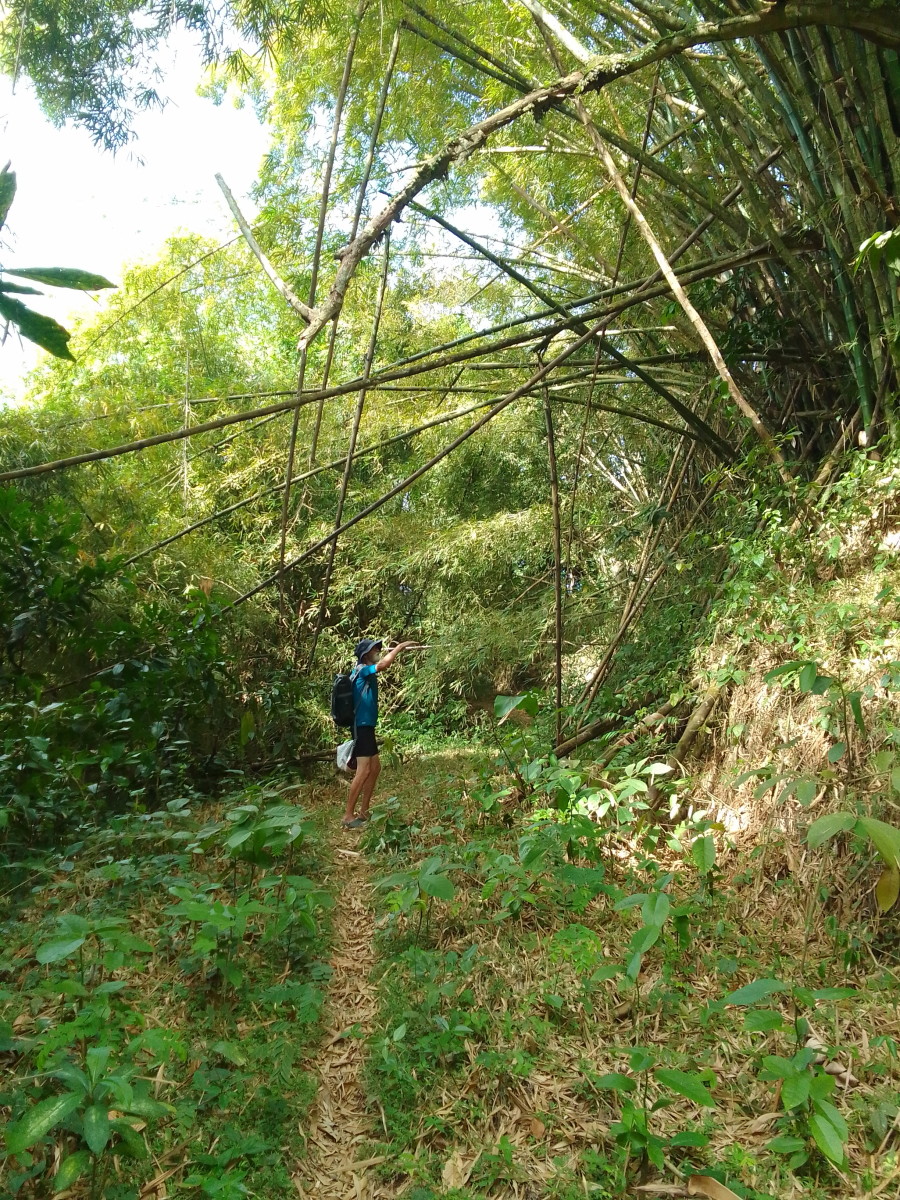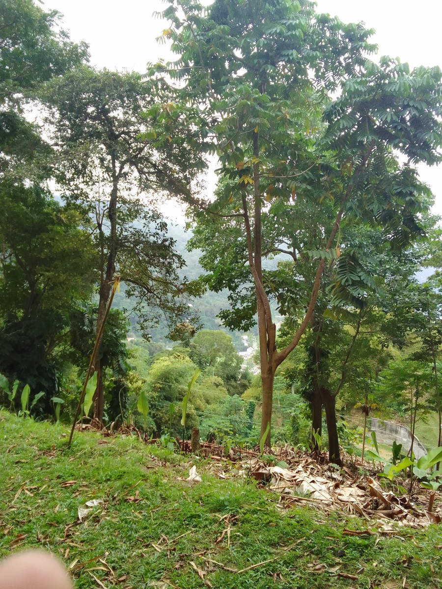Puis la route goudronnée cède la place à un chemin de terre. La vue commence à être vraiment intéressante. Encore une maison et une petite plantation de banane avec quelques plans de cacao et le sentier s’enfonce dans la foret.