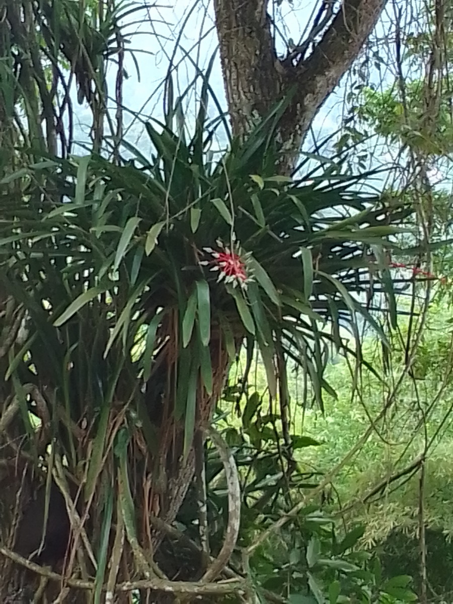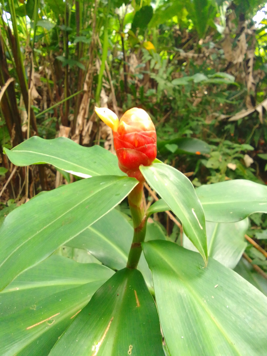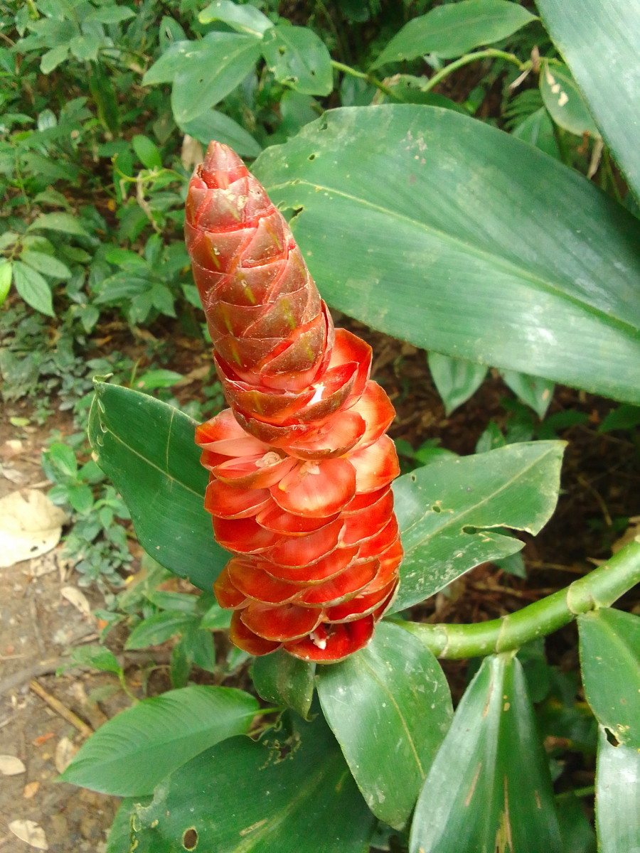 On note au passage sur le bord du sentier de nombreux gingembre rouge ou canne d’eau (Costus woodsonii). La couleur orange étant à l’honneur en cette saison, il y a aussi dans la canopée de grands arbres fleuris garnis de belles fleurs oranges se sont des Immortelles (Erythrina poeppigiana).