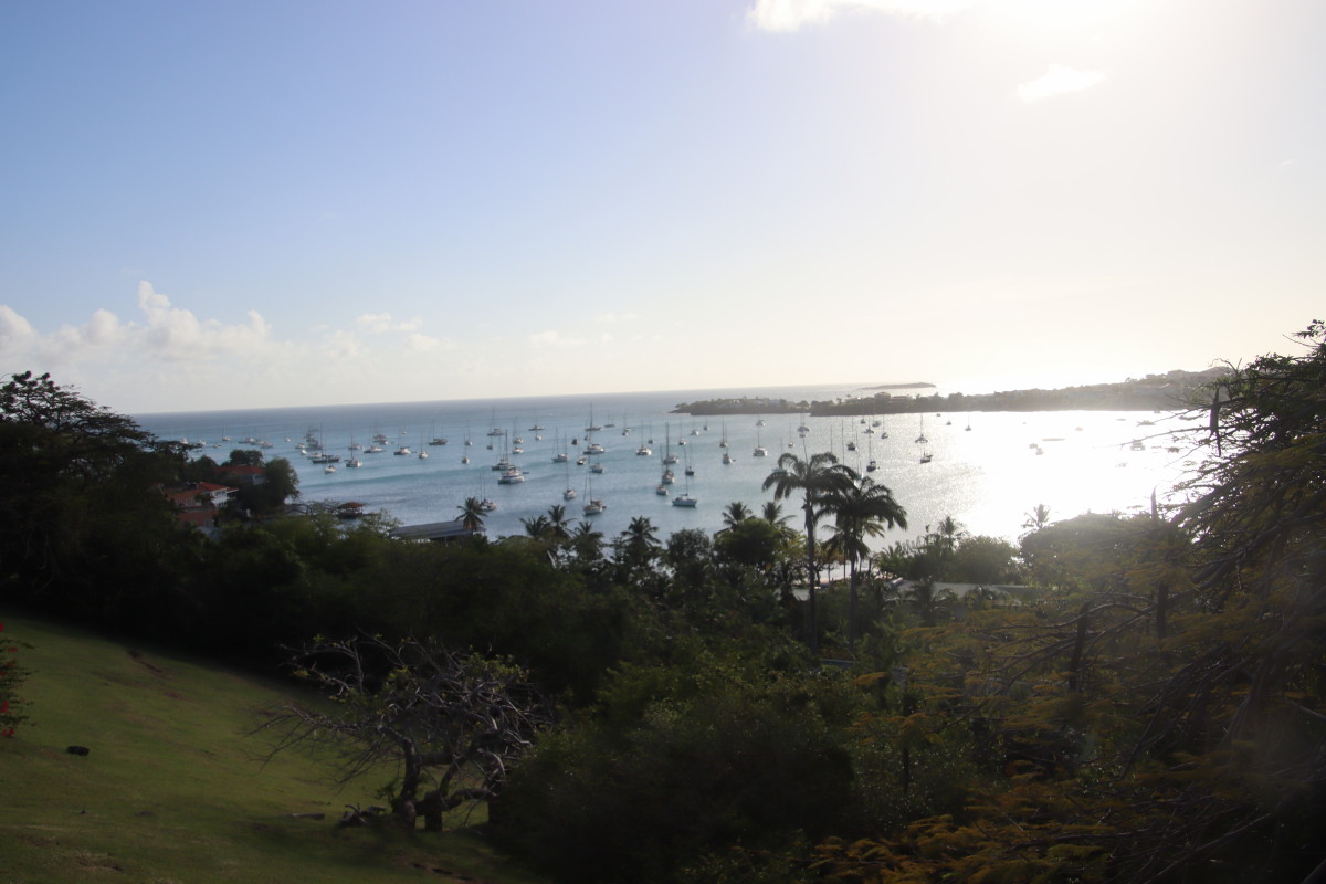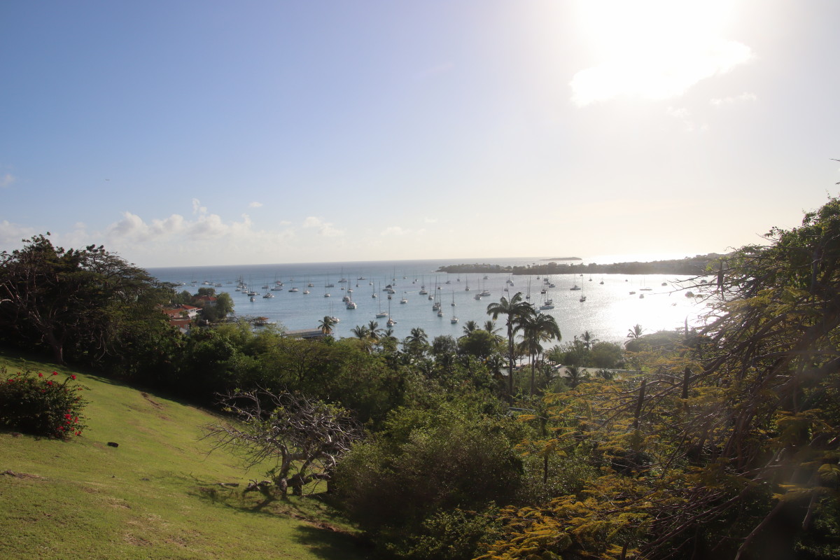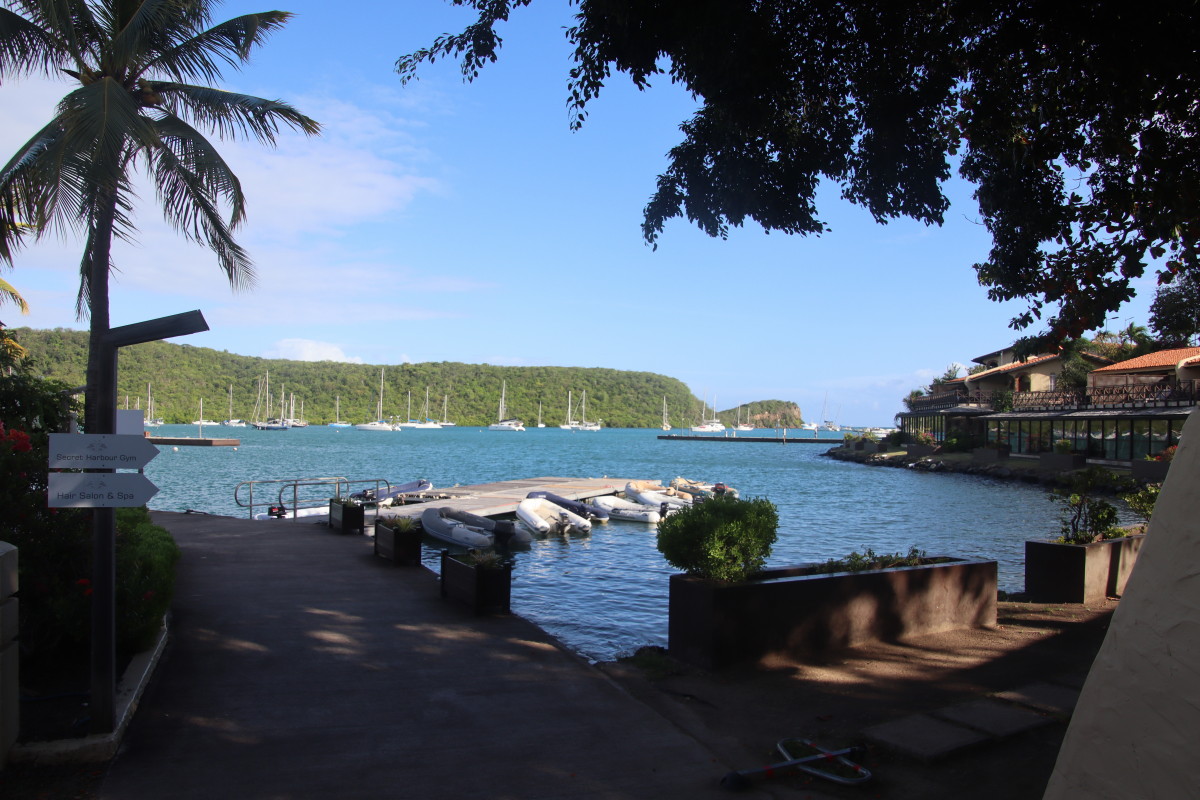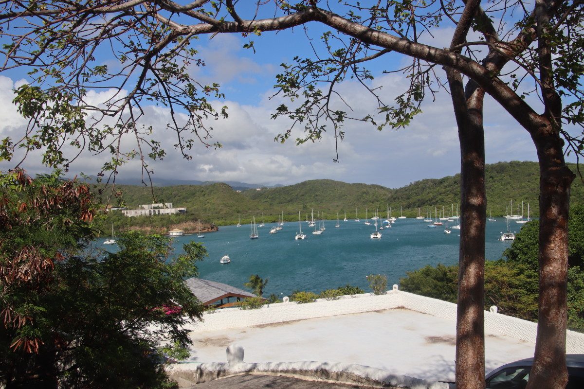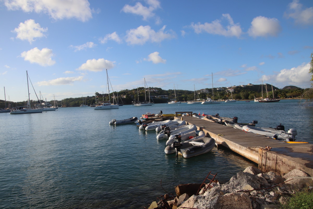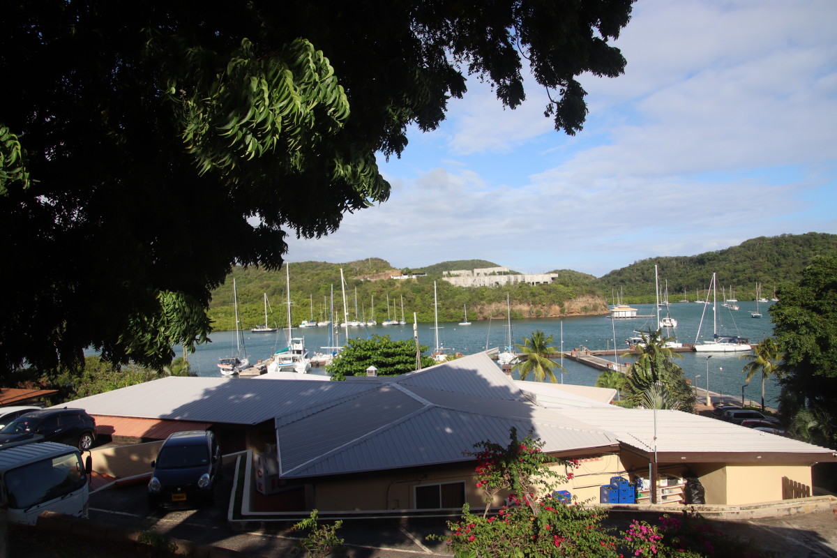 La première vision est un peu un choc pour nous : la baie et remplie de bateaux. Nous n’en n’avions pas vu autant depuis notre départ de Mindelo en novembre dernier. On trouve un corps mort libre tout près du ponton, fermons le bateau et débarquons aussitôt pour faire la clearance d’entrée. Le bureau de douane/émigration est juste là au-dessus du quai. Les formalités sont expédiées en moins de 10’. Tout est facilité par l’application « SailClear » où j’avais rempli notre déclaration d’arrivée la veille avant de partir de Tobago. Le plus long a été de payer les droits (environ 50 EUR tout compris).