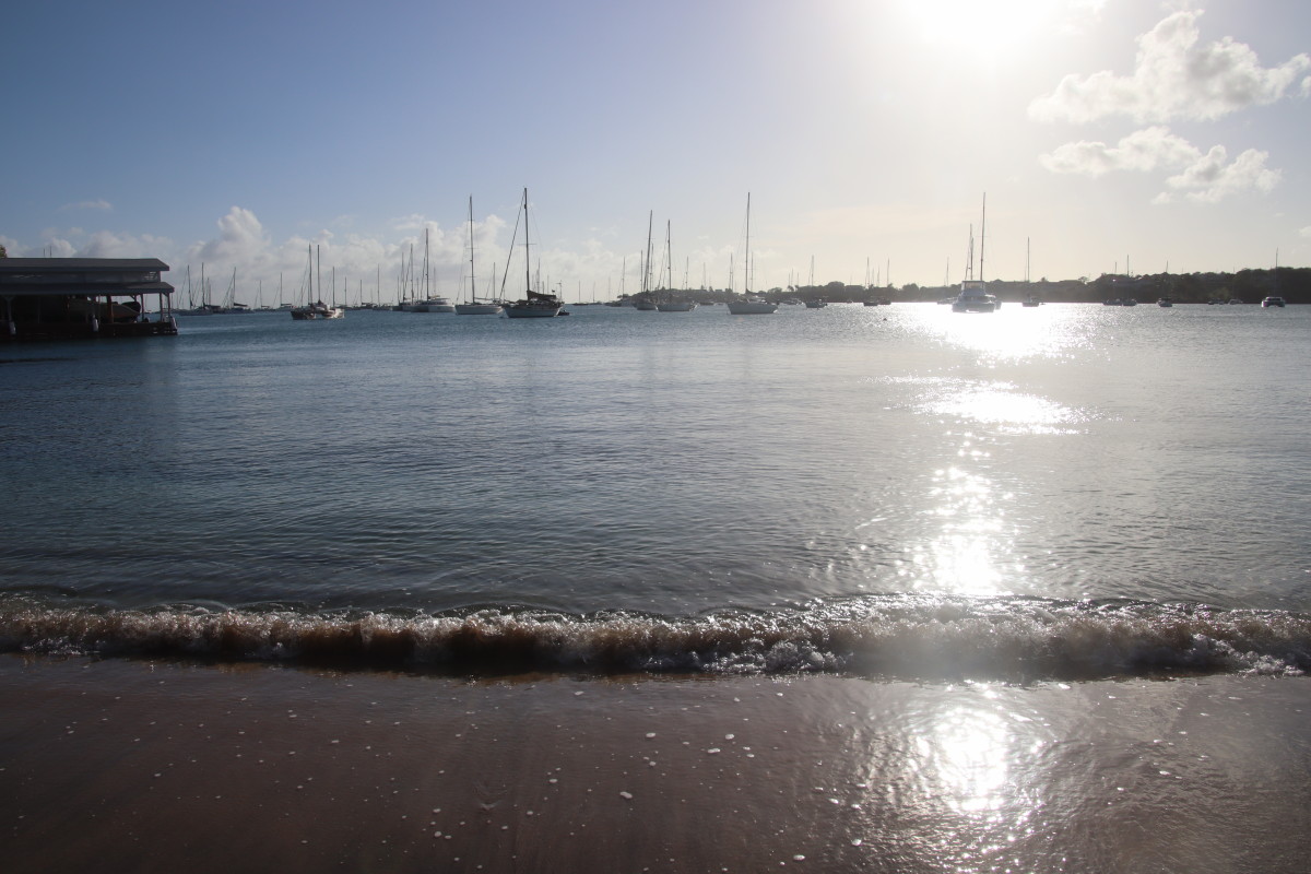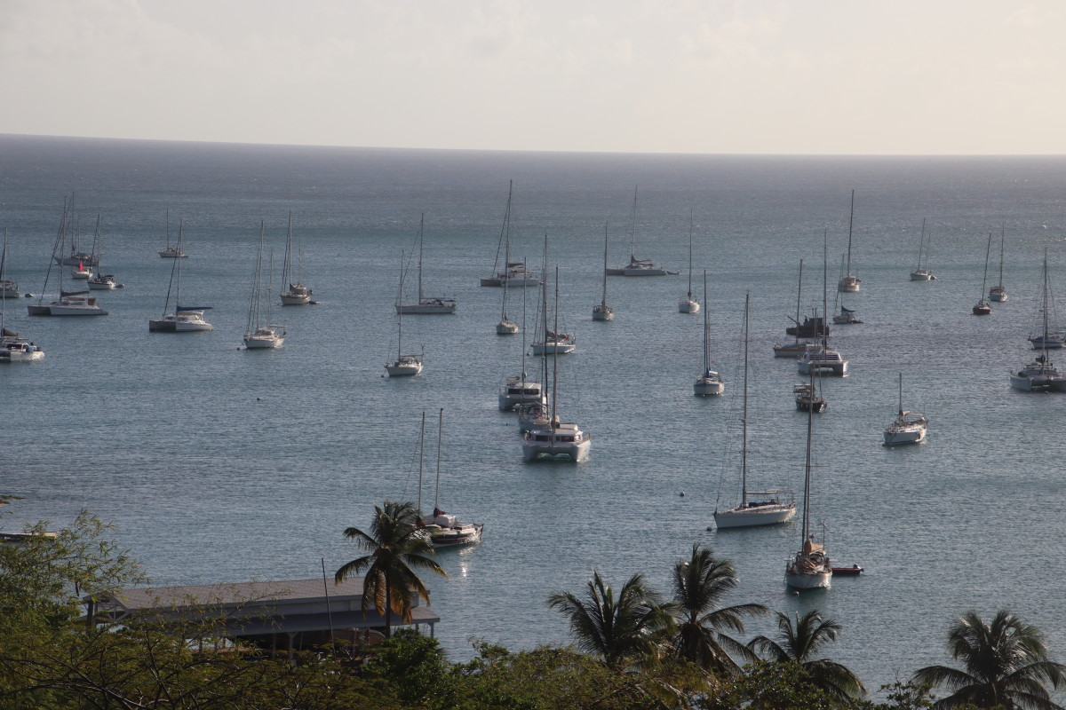Parmi la grosse cinquantaine de bateaux au mouillage dans la baie seulement une douzaine semble en escale tous les autres sont inoccupés, probablement en hivernage. Les baies de la côte sud sont traditionnellement parmi les abris les plus sûr des Caraïbes. La gérante de la marina nous a expliqué que lors du passage du cyclone Beryl en juillet 2004 tous ses corps morts avait tenu mais quelques bateaux avait été endommagés par d’autres dont l’ancre n’avait pas tenu. Nos amis Carole et Daniel avait aussi hiverné leur Folligou à terre au chantier du fond de la baie et il avait traversé l’épreuve sans aucun dommage.