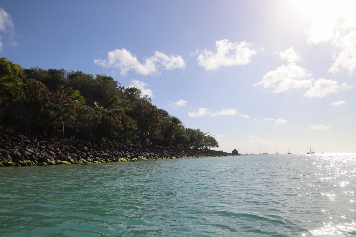 Les 10 milles depuis Port Egmond jusqu’à Saint Georges sont avalés rapidement même si passé la pointe de la Quarantaine on subit des rafales catabatiques assez fortes. Nous prenons une bouée de corps mort à Martin’s Bay et partons faire le tour de la ville en kayak. (pas de possibilité d’ancrage près de la ville où beaucoup de bouées sont disponibles). mouillage tranquille avec de l’eau très claires et tortues nous tournant autour…