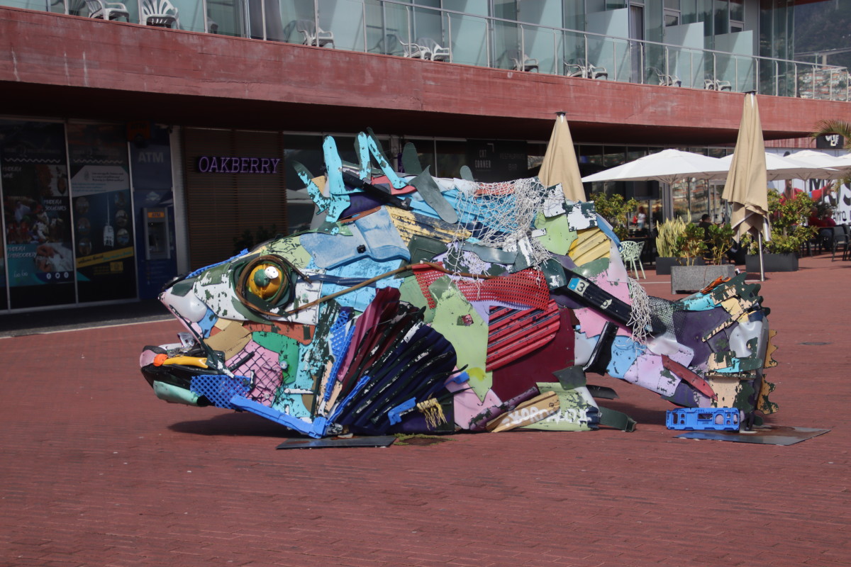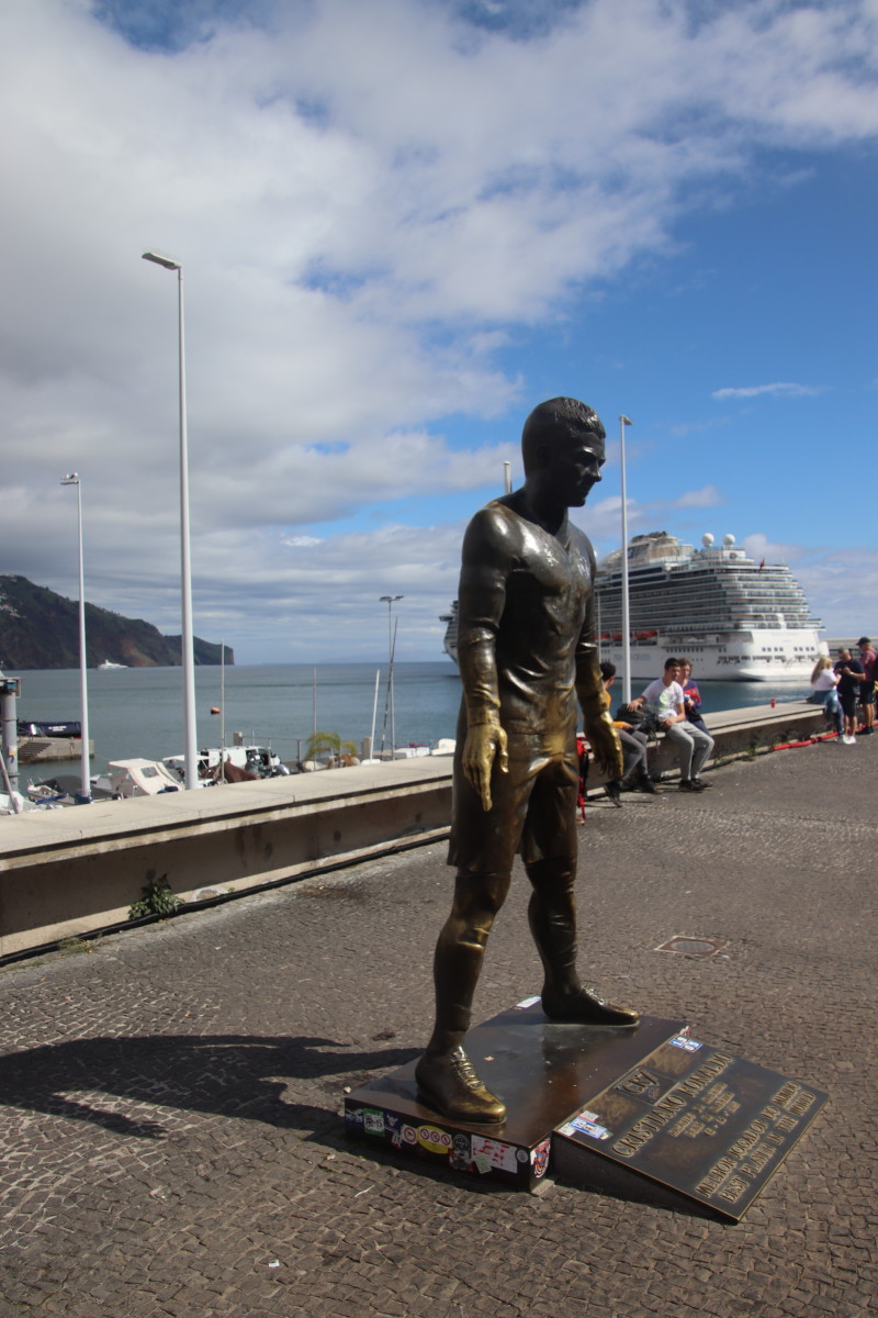 Le port commercial est principalement dédié aux paquebots de croisières (nous en verrons jusqu’à quatre ensembles) qui déversent leurs milliers de passagers touristes dans la ville. Parfois il y a des visiteurs plus authentiques comme ce phoque habitué des pontons ou ce trois mat à voile de la marine danoise. Le port abrite aussi un labo océanographique équipé d’un drone de surface pour étudier l’évolution de l’eau de l’océan autour de l’île. Mais que serait Funchal sans son héros national le fameux CR7 (je vous laisse deviner de qui il s’agit) né dans la cité du fenouil*?
