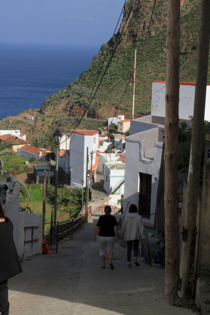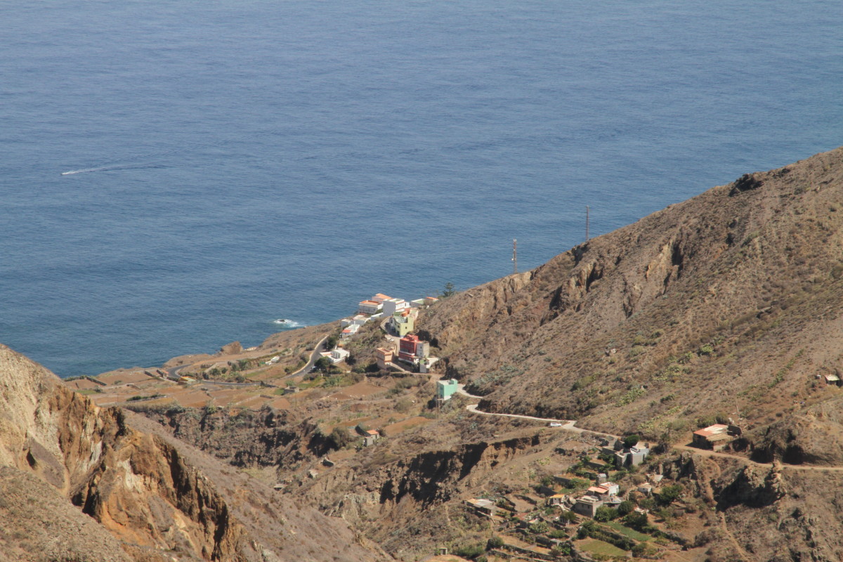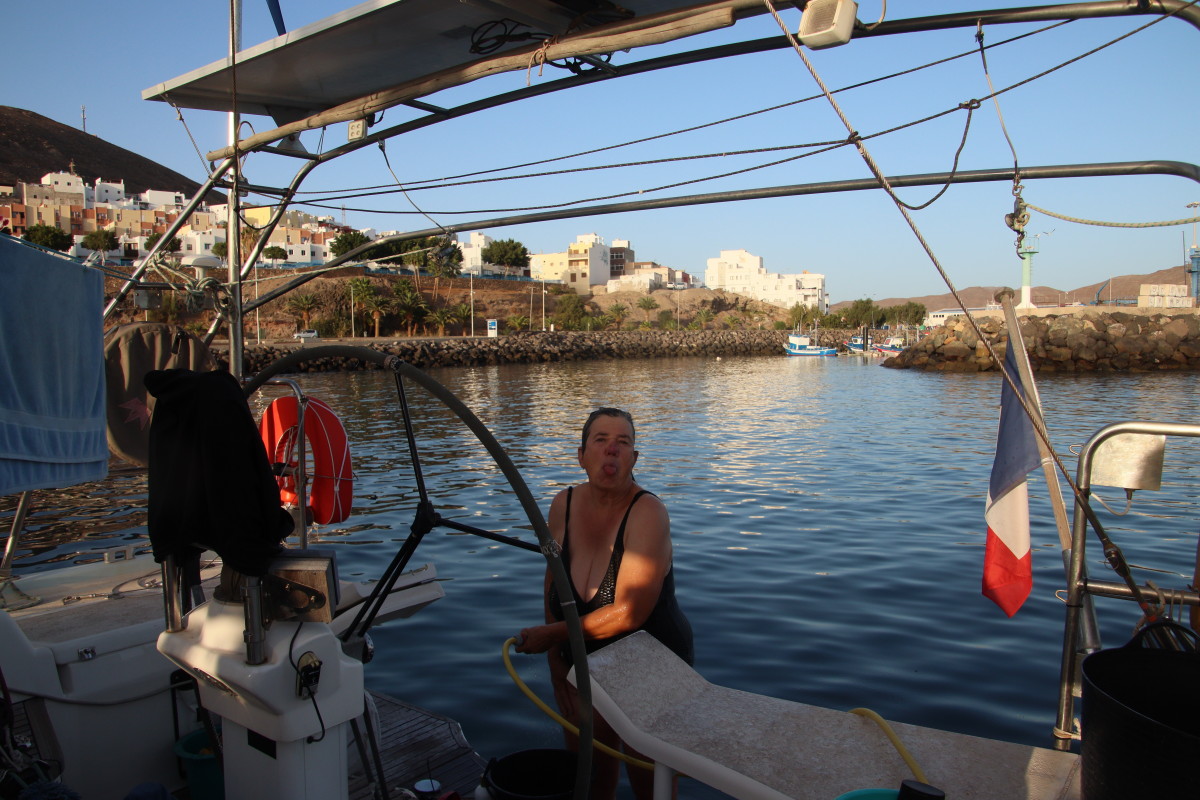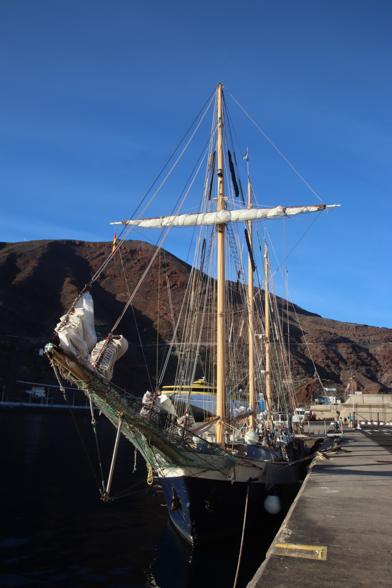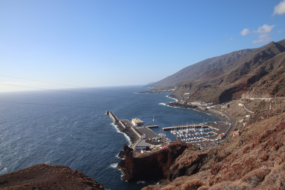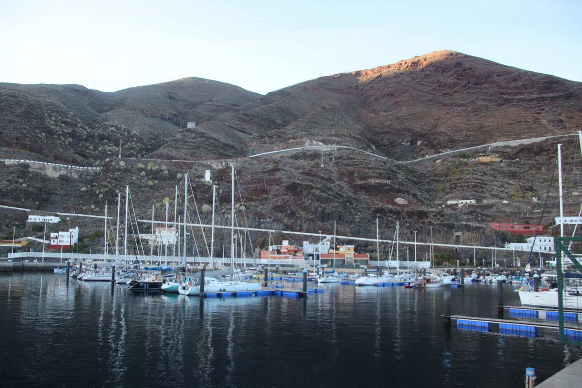 L’endroit est très spécial, entouré de pentes abruptes d’aspect lunaire avec juste quelques maisons accrochées en bas de la falaise. L’infrastructure portuaire est assez bien intégrée dans le décor. Par rapport à tous les ports de l’archipel c’est sans aucun doute l’un des mieux protégés de tous les vents mais c’est surtout et de loin le plus calme : une demie douzaine de bateaux de voyage dont la majorité est là pour passer l’hiver au chaud dans un coin tranquille (c’est un peu notre cas) et les autres faire une dernière étape européenne avant la traversée vers le Cap Vert ou les Antilles (attention si votre destination, votre pavillon ou votre nationalité requiert une sortie officielle de l’UE, vous ne pourrez pas la faire ici). Ces voiliers de grandes croisières sont complétés en milieu de semaine par les quelques rares charters/locations qui osent faire le saut si loin de la vie nocturne trépidante des autres îles. Aucune circulation automobile en dehors de l’arrivée et du départ des 2 ferrys journaliers et cerise sur le gâteau une plage, juste de l’autre côté de la jetée intérieure, très bien aménagée avec des rampes de descente à travers les galets et toujours praticable car à l’abri du grand môle extérieur. Dans le terminal il y a un café assez agréable et une mini-supérette plutôt bien achalandée pour sa taille et avec du pain tous les matins. Pour des plus grosses courses il faut monter à Villa de Valverde la capitale de l’île (Bus ligne 7, cinq départs tous les jours), les commerces d’alimentation sont tout près de la gare de bus (supermarchés , et 5-oceanos pour les surgelés) Bref un endroit idéal pour se reposer et nous remettre de cette grippe qui ne veut pas nous lâcher.