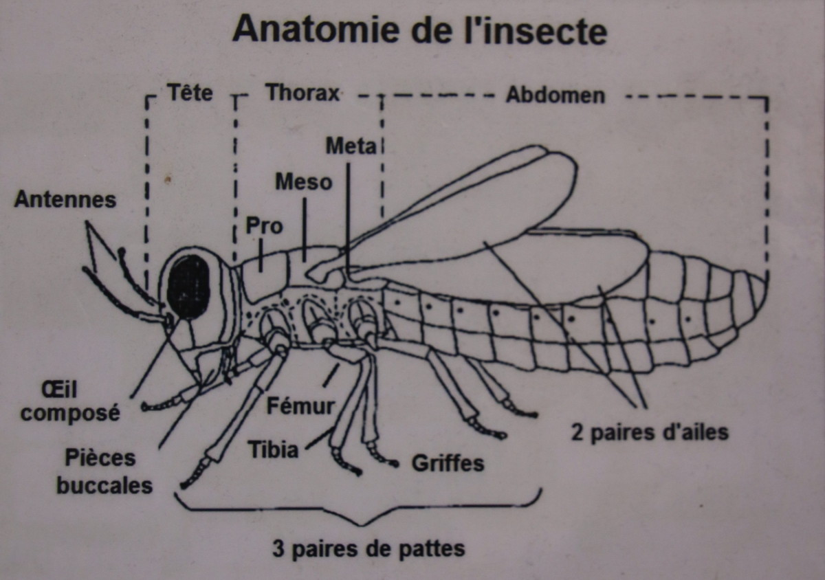 Les insectes font partie de l’embranchement des arthropodes, sous-embranchement des hexapodes. Les insectes ont six pattes à l’état adulte, deux paires d’ailes pour les volants et une paire d’antennes. Un insecte a toujours une tête, un thorax et un abdomen bien séparés entre eux. Les pattes et les ailes sont toutes situées sur le thorax.