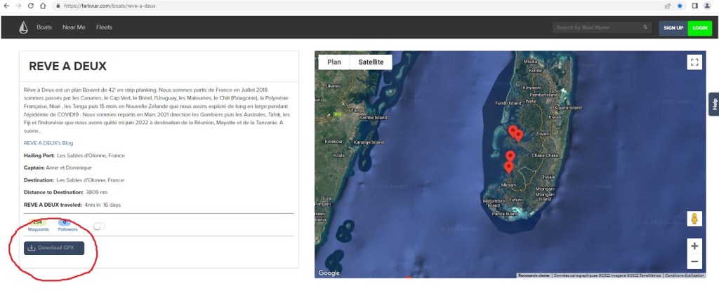 En vous rendant sur notre page de suivi Farkwar vous pourrez télécharger la liste de nos mouillages au format gpx pour une utilisation directe dans votre logiciel de navigation. Il suffit de cliquer sur le bouton « down load GPX » (contient aussi quelques points intermédiaires pour les traversées)