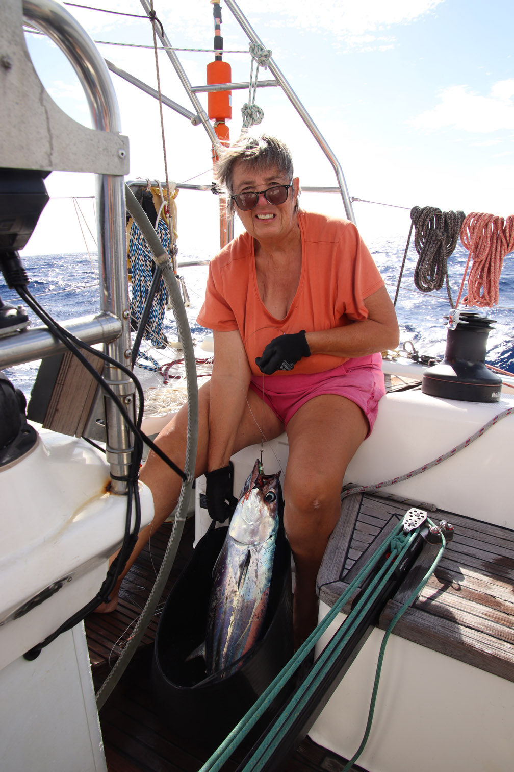 Pour le bon goût et la conservation de la chair il est très important de tuer et saigner le poisson dans les règles. Le document de l’IFREMER que vous pourrez télécharger ici explique très bien comment procéder. Pour éviter de transformer notre cockpit en scène de massacre pendant l’opération nous utilisons maintenant un grand bac qui nous évite bien du nettoyage.