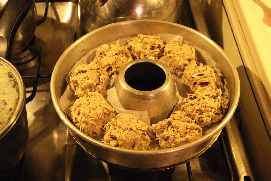 Ajoutez les œufs, l’huile d’olive, l’oignon ciselée, l’ail écrasé, la coriandre les zestes de combava, le jus de citron et le thon émietté.