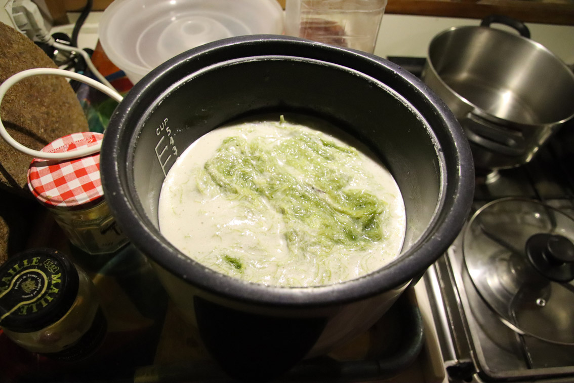 Ensuite, il faut les blanchir en les faisant bouillir 10 minutes dans de l’eau non salée puis les égoutter. Le terme culinaire blanchir prend ici une note amusante puisqu’en fait elles sont passées d’un brun jaunâtre à un vert très soutenu.